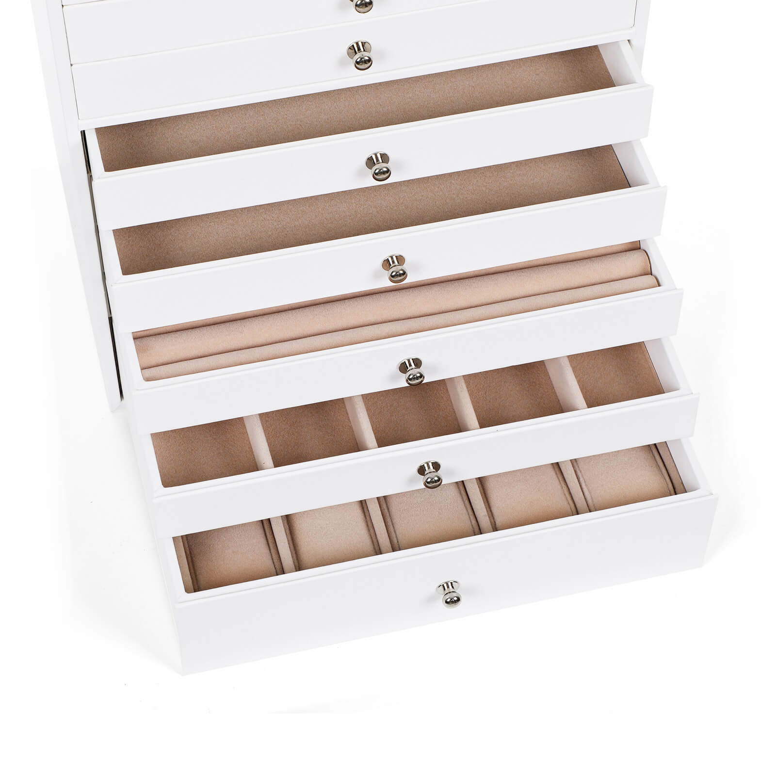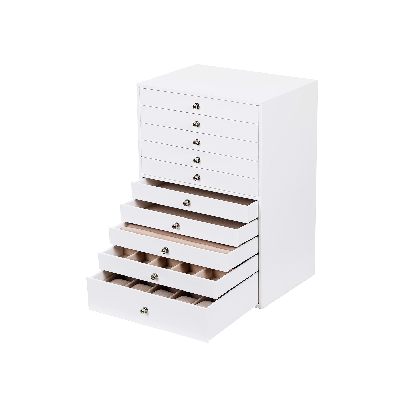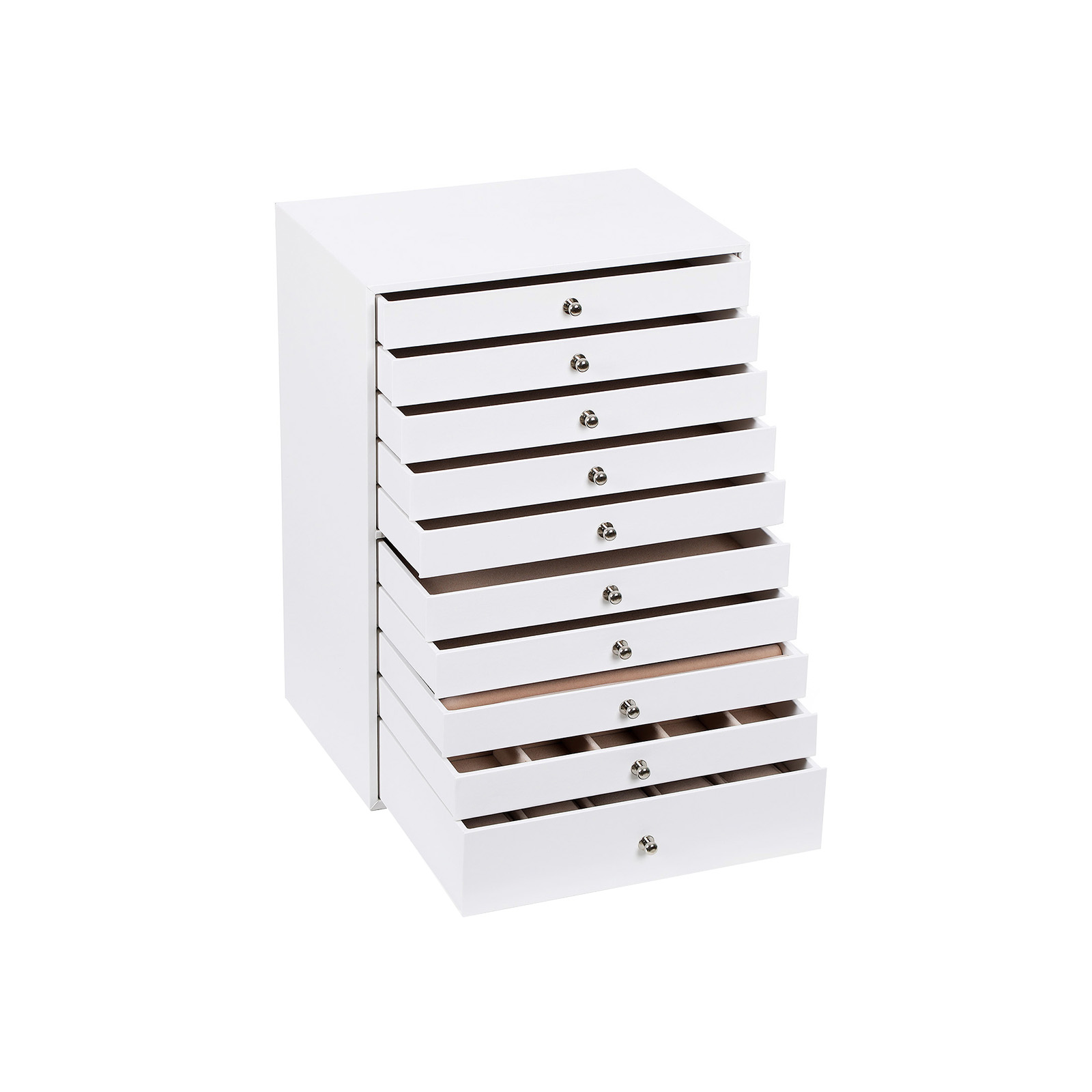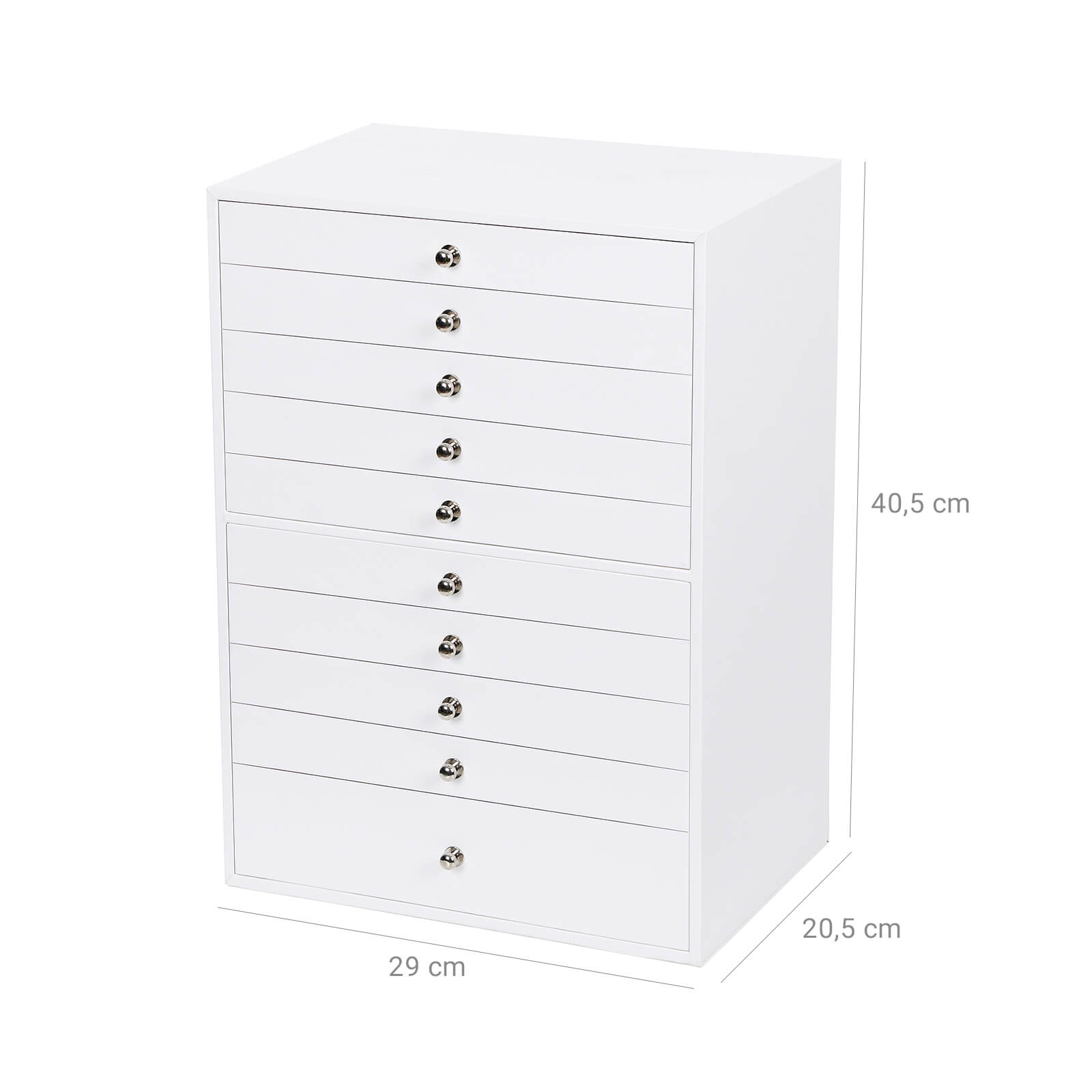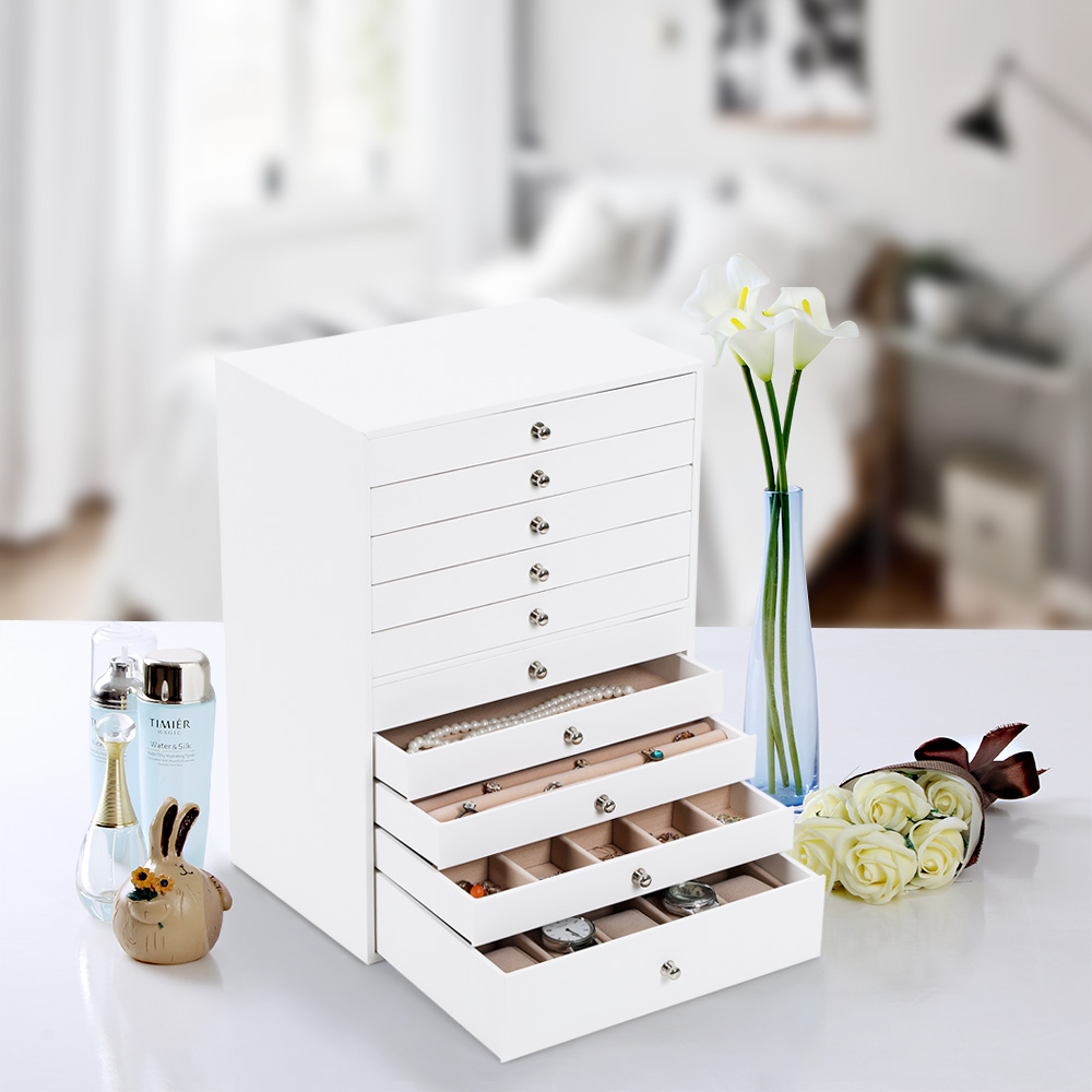 Kuvaus: – Kaunis, tyylikäs ja ajaton korulaatikko – todellinen katseenvangitsija jokaisessa modernissa kodissa! – Tämä tyylikäs korulaatikko vakuuttaa paitsi elegantilla muotoilullaan myös toiminnallisuudellaan. 10 laatikkoa tarjoaa erilaisia säilytysmahdollisuuksia sormuksille, rannekoruille, kaulakoruille, kelloille ja monille muille esineille – siististi ja tilaa säästäen. Lisäksi se suojaa arvokkaita lempikoruja pölyltä ja naarmuilta. – Songmicsin tyylikäs korurasia on huolellisesti valmistettu ja helppo puhdistaa, ja se on ehdoton hankinta kaikille korujen ystäville. Säilytys ja hoito: – Säilytä korurasia ilmastoidussa tilassa ja vältä jättämästä sitä pitkäksi aikaa auringonvaloon tai kosteaan tilaan. Sopiva lämpötila: 10–40 ℃. – Pinnan tahrat voidaan pyyhkiä pois hieman kostutetulla liinalla, vältä veden pääsemistä korurasiaan. – Käytä säännöllisesti erityistä nahkahuoltotuotetta, jotta nahka säilyttää kiiltonsa pitkään.- Suojaa korulaatikko varastoinnin aikana puristukselta. – Älä säilytä korulaatikkoa kemikaalien kanssa. Tuotetiedot: – Väri: valkoinen (ulkopuoli) + beige (sisäpuoli) – Mitat: 40,5 x 29 x 20,5 cm – Yläosan uusien laatikoiden yksittäiset mitat: 19,6 x 27,5 x 3,5 cm – Kymmenennen laatikon mitat: 19,6 x 27,5 x 6,5 cm – Paino: 5,1 kg Toimitus sisältää: – 1 x korulaatikko (ilman koruja)