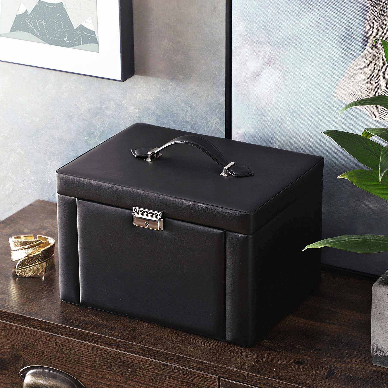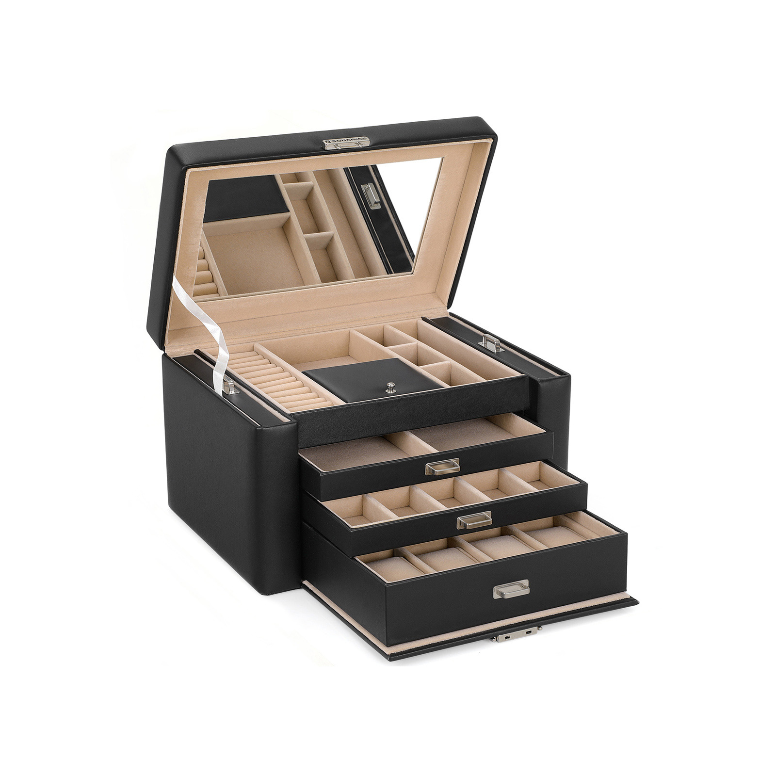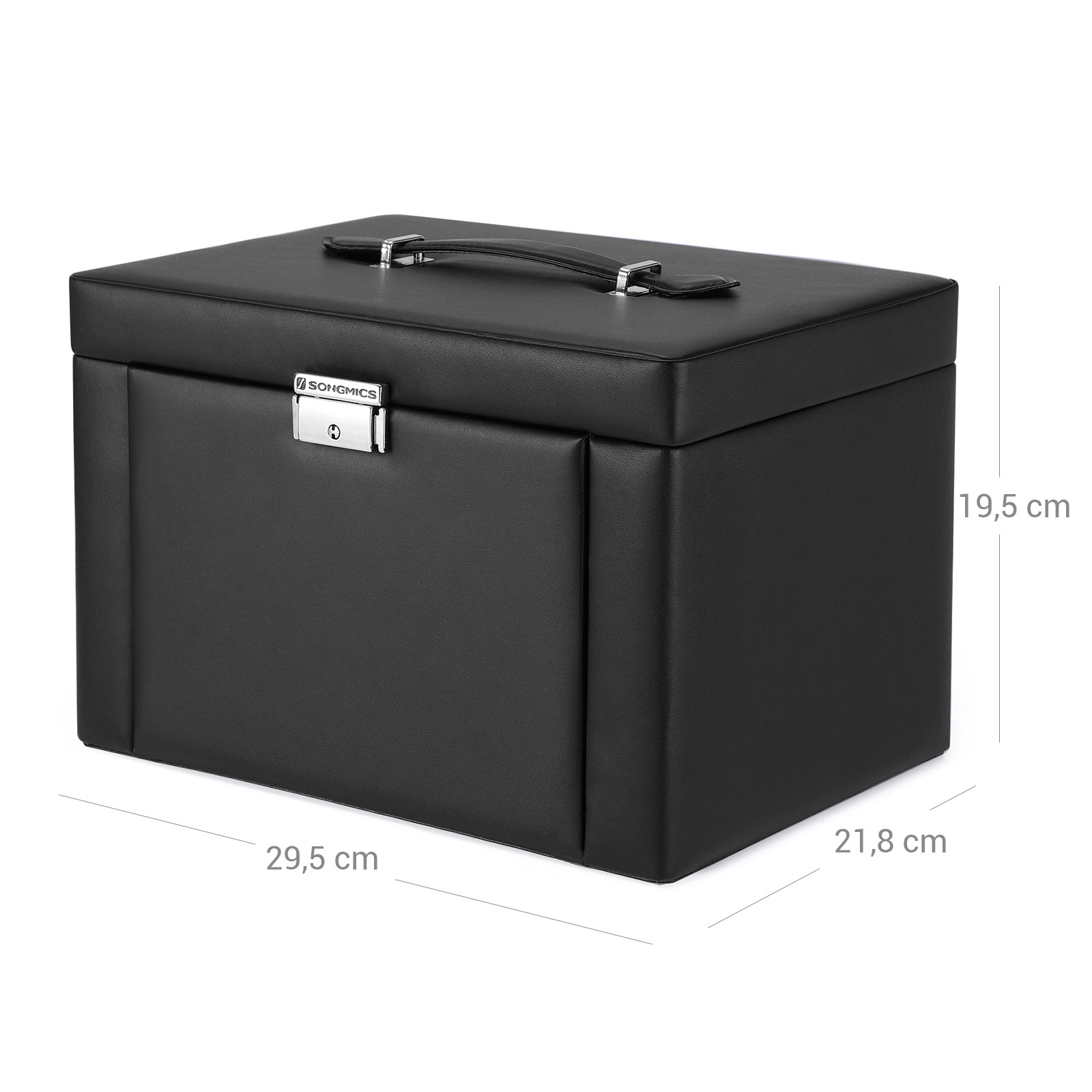 Tuotetiedot Väri: musta Materiaali: MDF (keskitiheä kuitulevy) + sametti + keinonahka Tuotteen mitat: 29,5 x 19,5 x 21,8 cm (L x K x S);Peilin mitat: 22 x 14,4 cm; Sivutaskun mitat: 20,3 x 15,6 cm (2 x) Sormustaskun mitat: 5,8 x 18,7 cm 1. laatikon taskujen mitat: kukin 10,3 x 19,5 x 2,5 cm (2 kpl) 2. laatikon lokeroiden mitat: kukin 4,3 x 6,5 x 2,5 cm (15 kpl) 3. laatikon lokeroiden mitat: kukin 5 x 9,5 x 5,5 cm (8 kpl) Toimitus sisältää 1 x korulaatikko 2 x avain