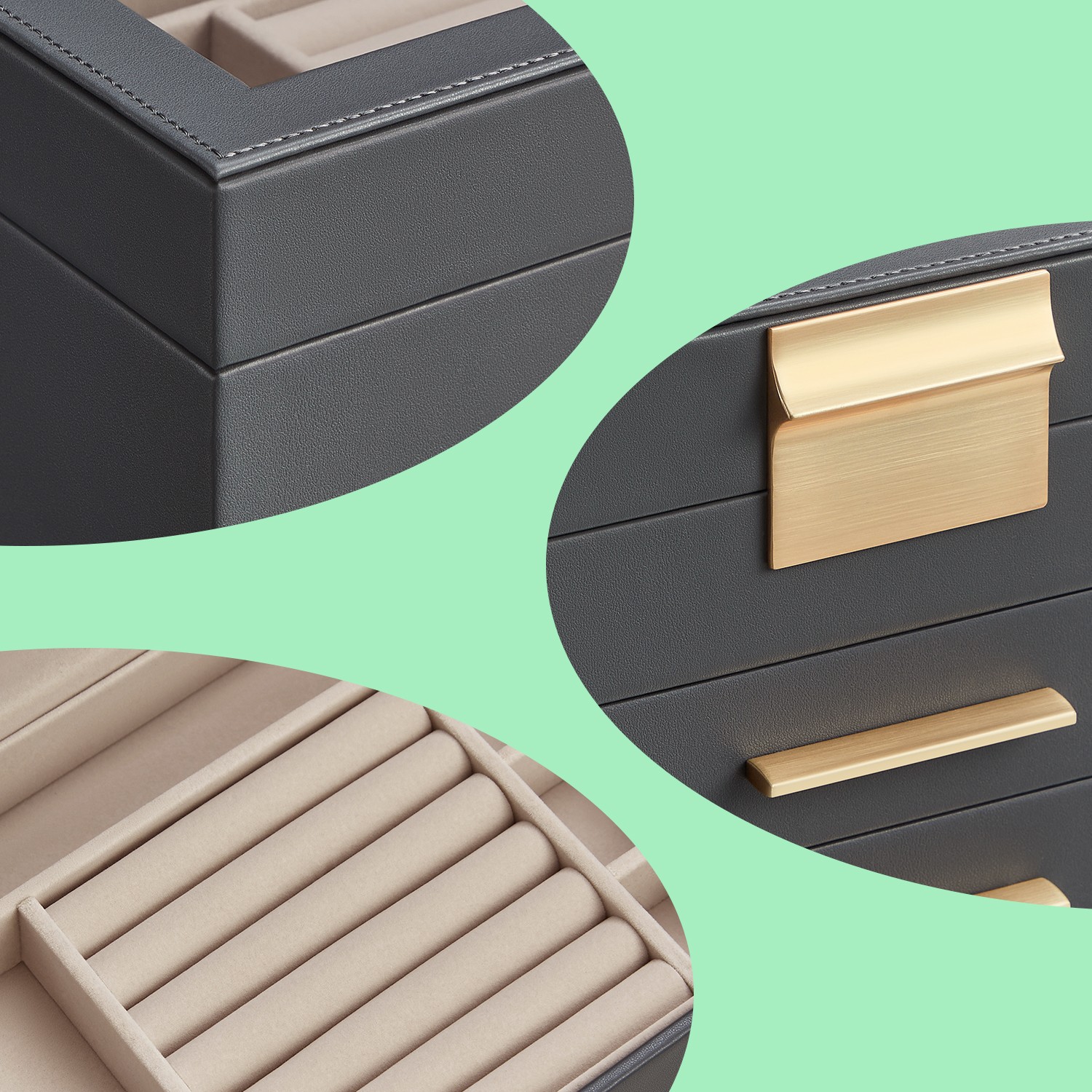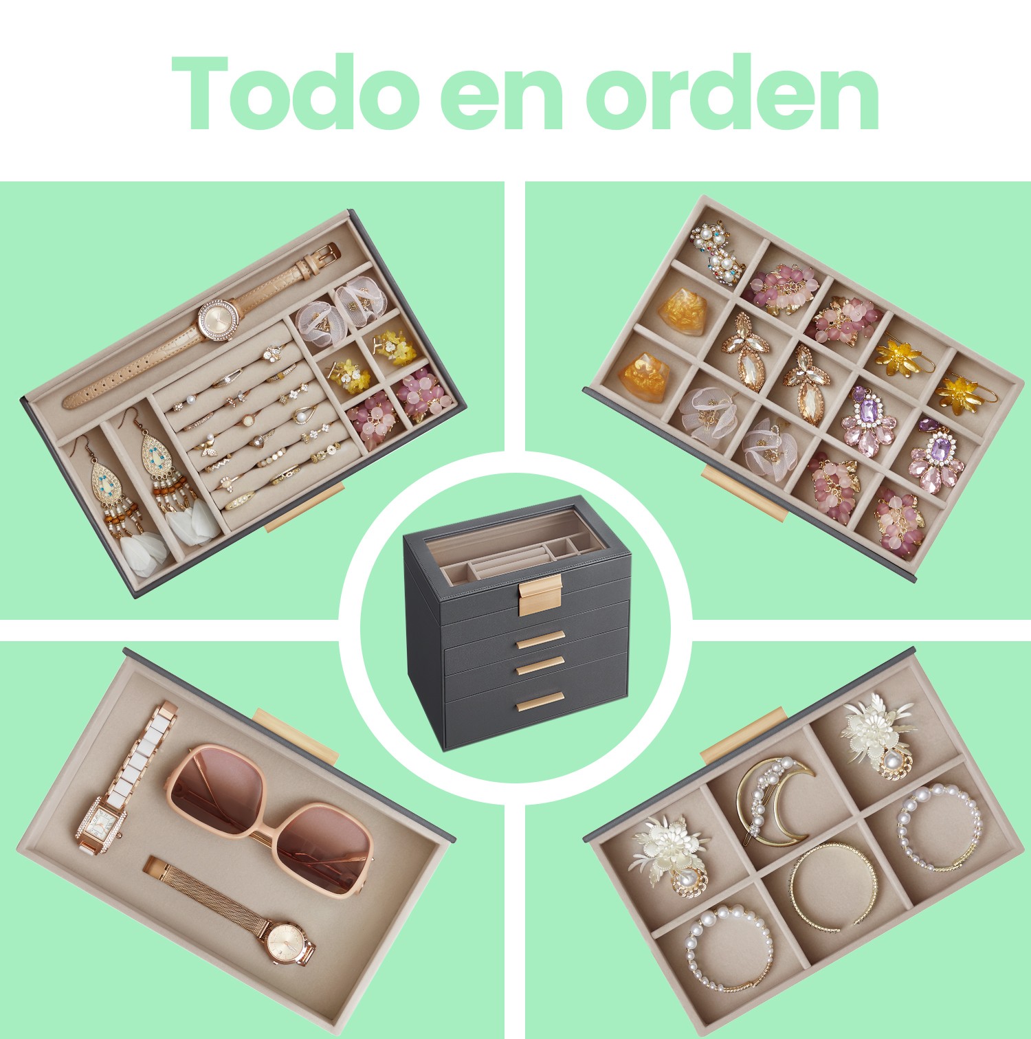 SONGMICS korurasia, 4-tasoinen korulaatikko, korurasia lasikannella, 3 laatikkoa, aurinkolaseille, suurille koruille, korujen säilytys, moderni, grafiitinmusta-kultainen JBC161B02