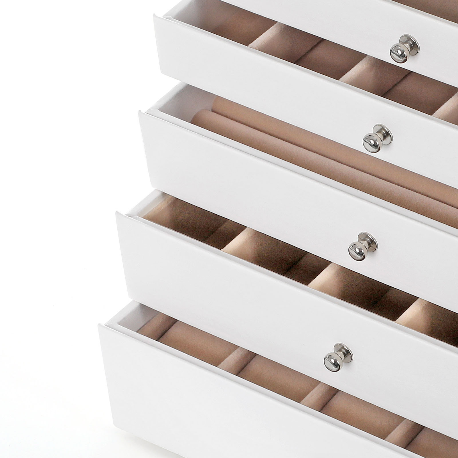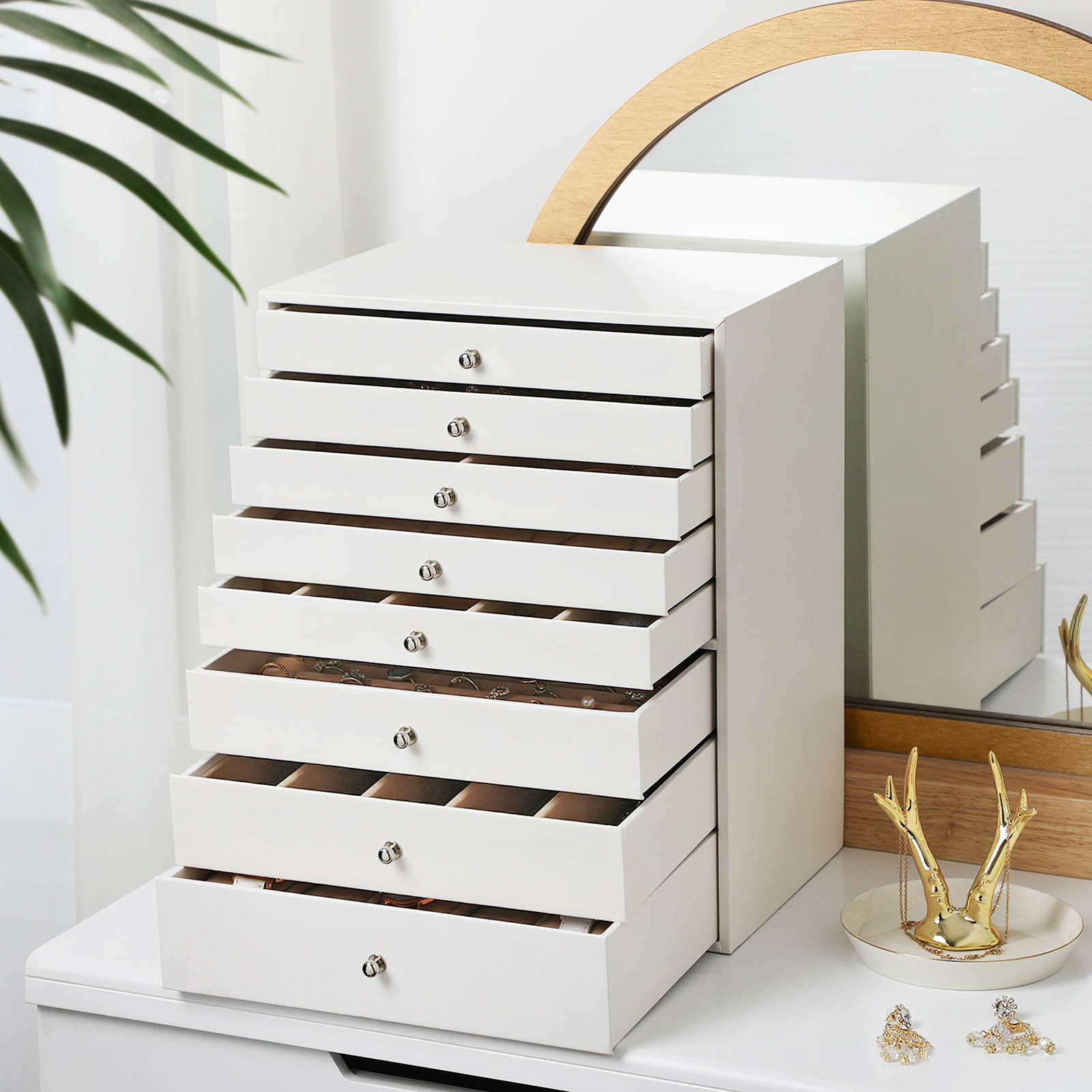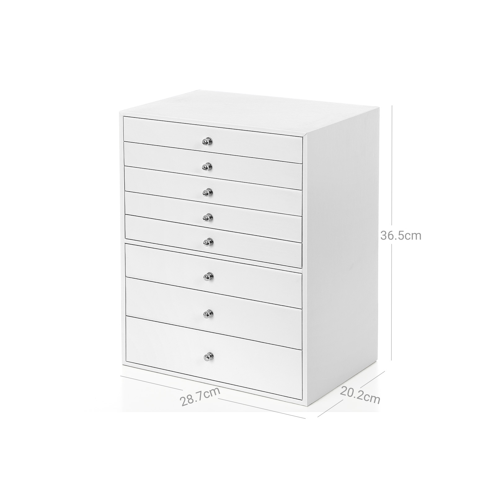 Klassinen korulaatikko korujen ystäville MDF-levyistä ja samettivuorauksesta valmistettu laatikko on täydellinen ja kestävä säilytysratkaisu arvokkaimmille koruillesi. Enemmän tasoja, enemmän iloa Korulaatikossa on 8 laatikkoa. Erityisen hyödyllisiä ovat jokaisen laatikon erilaiset asettelut: – Kaksi ylintä laatikkoa – Näissä ei ole väliseiniä, joten voit vapaasti päättää, mitä koruja haluat säilyttää niissä. – 3. laatikko – Siinä on 8 koukkua, joihin voit ripustaa kaulakorusi siististi.- 4. laatikko – Tässä on 4 isoa lokeroa rannekoruille tai rintakoruille. – 5. laatikko – Tässä on 15 lokeroa korvakoruille tai nappikorvakoruille. – 6. laatikko – Tässä on 10 riviä sormuspaikkoja. – 7. taso – Tässä laatikossa on 5 pitkää lokeroa kaulakoruille tai silmälaseille. – 8. laatikko – Tässä on 10 syvää lokeroa, joissa on kellotyynyt. Tuotetiedot:- Väri: valkoinen – Materiaali: PU (polyuretaani), MDF (keskitiheä kuitulevy), sametti – Koko: 28,7 x 20,2 x 36,5 cm (P x L x K) – Paino: 5,4 kg Toimitus sisältää: – 1 x 8-tasoinen korulaatikko