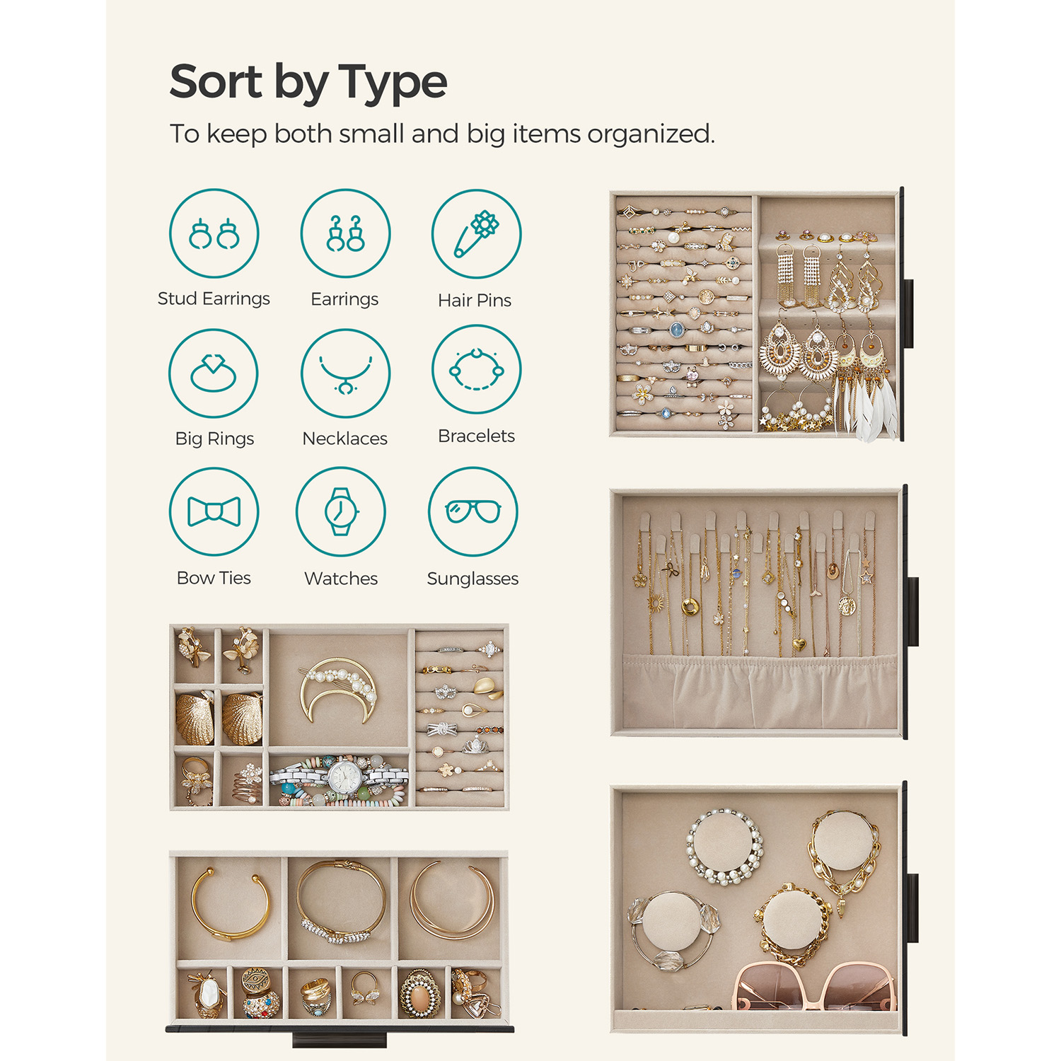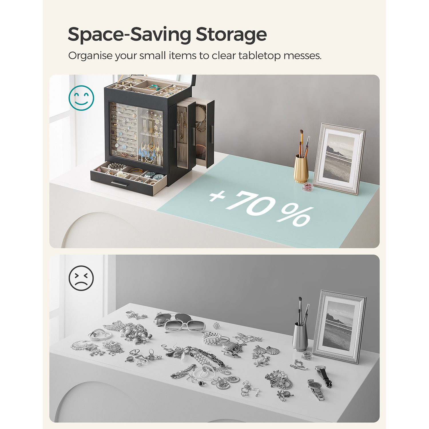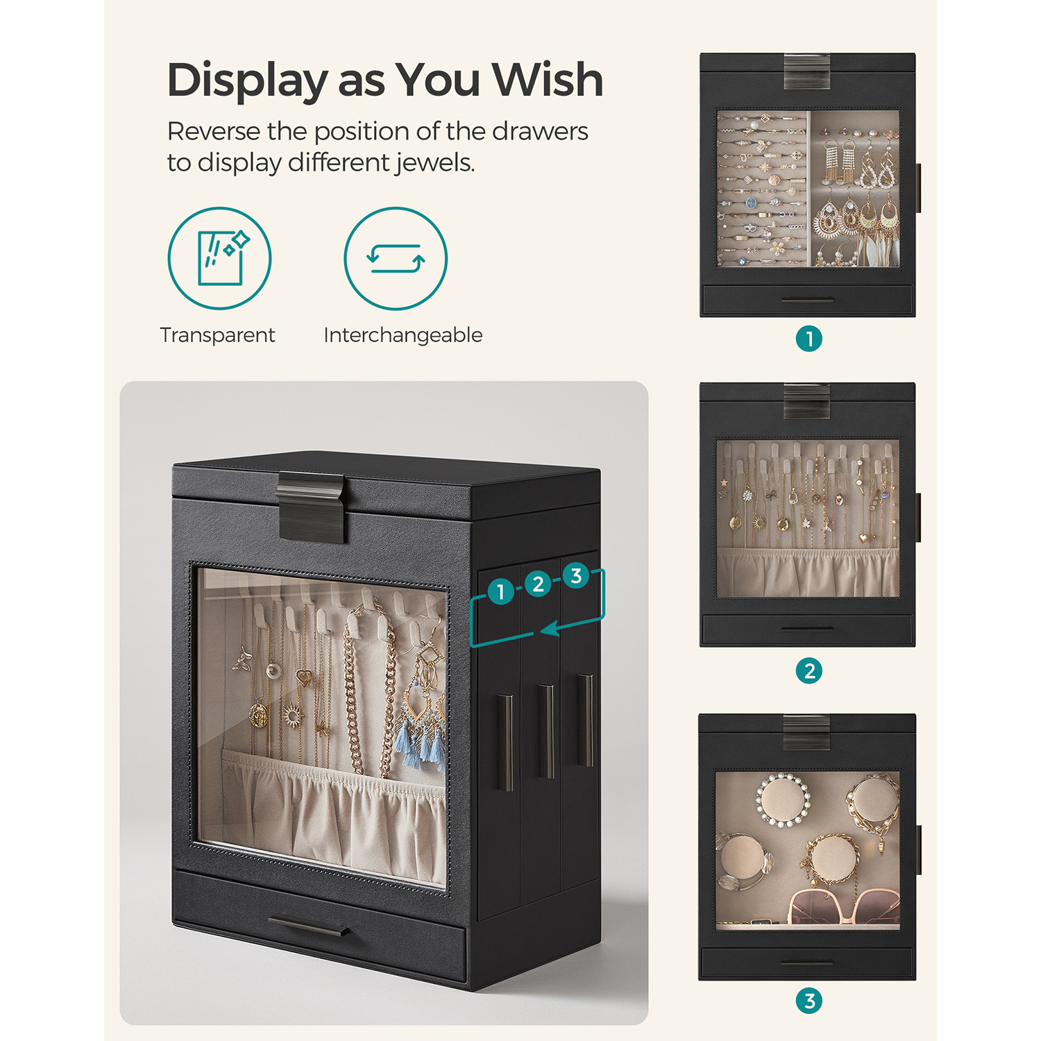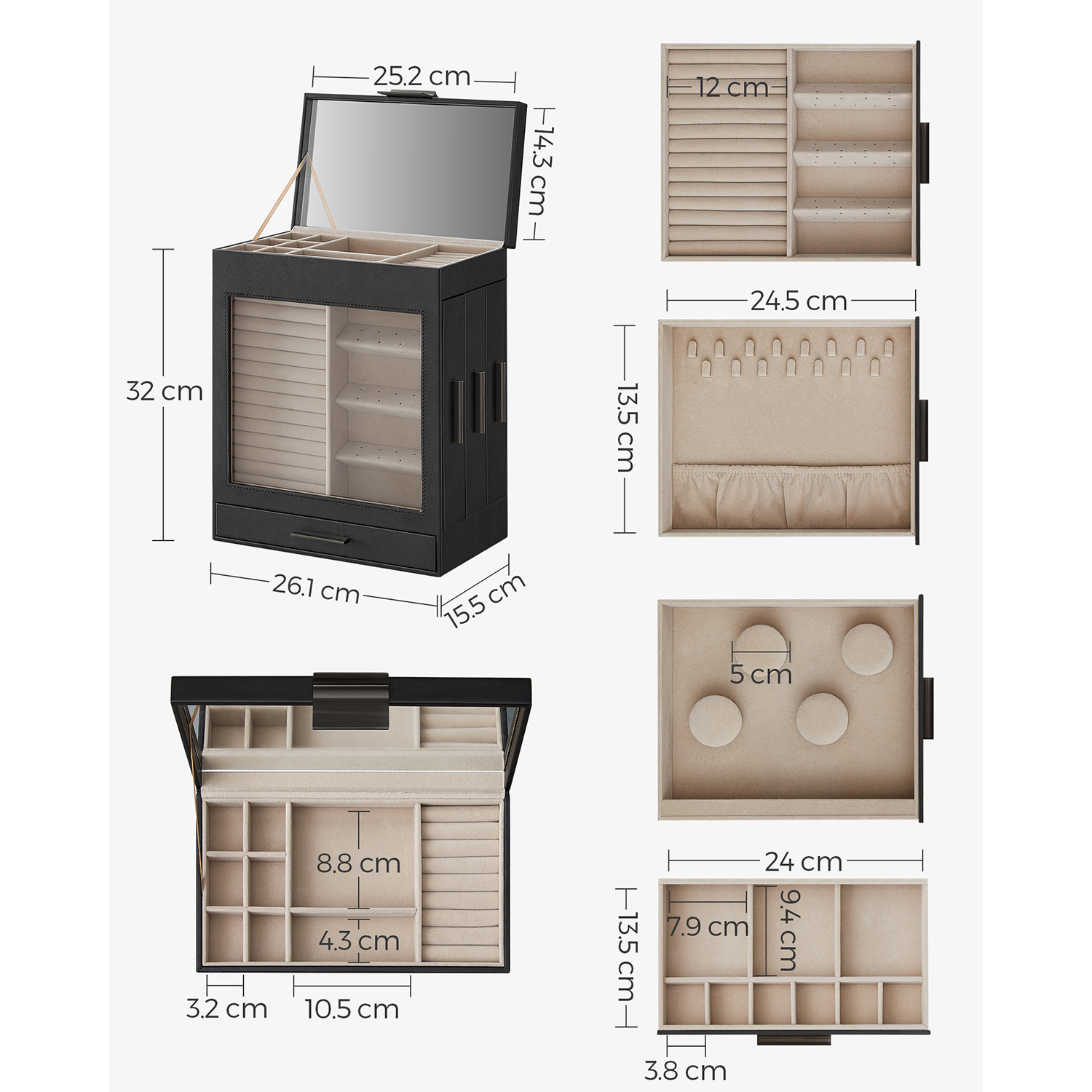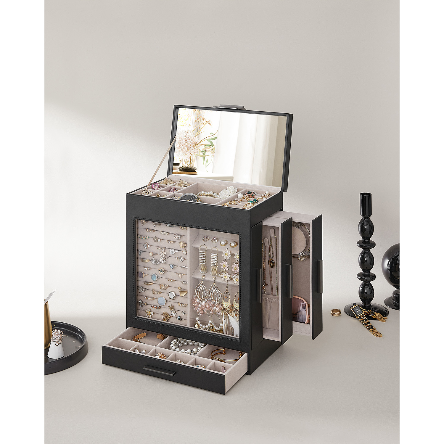 SONGMICS korurasia, korulaatikko 5 tasoa, korupakkaus, lasikansi, sivulaatikot, pystysuora säilytys, iso peili, moderni, korujen säilytys, grafiitinmusta-kultainen JBC162B02