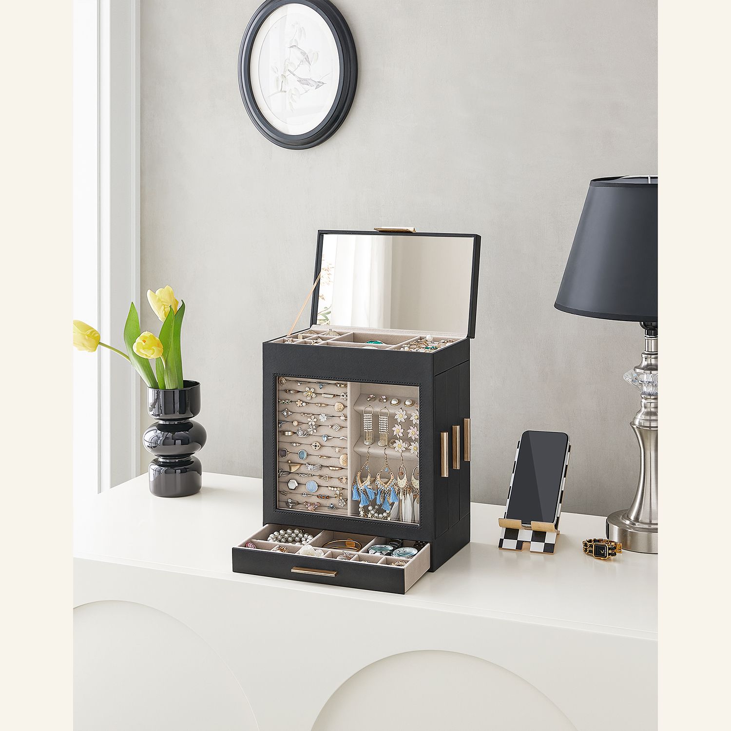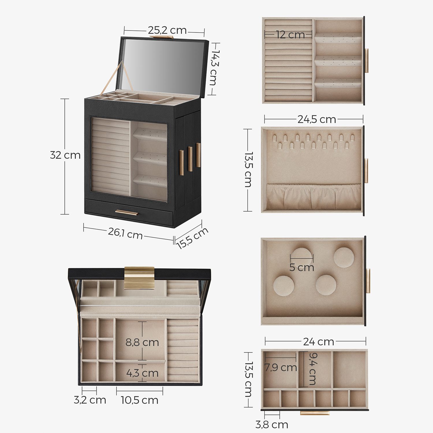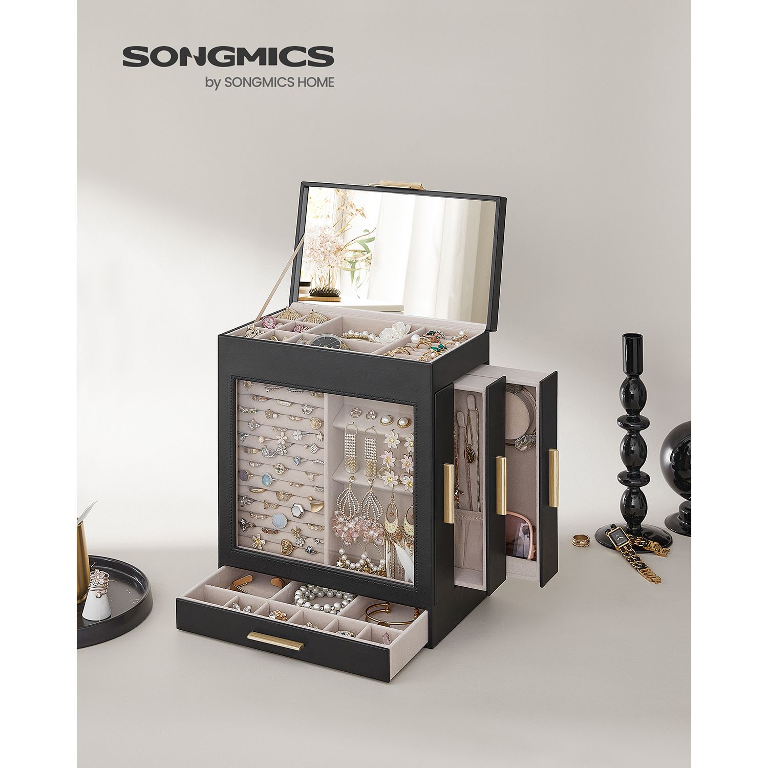 SONGMICS korurasia, korulaatikko 5 tasoa, korupakkaus, lasikansi, sivulaatikot, pystysuora säilytys, iso peili, moderni, korujen säilytys, grafiitinmusta-kultainen JBC162B02