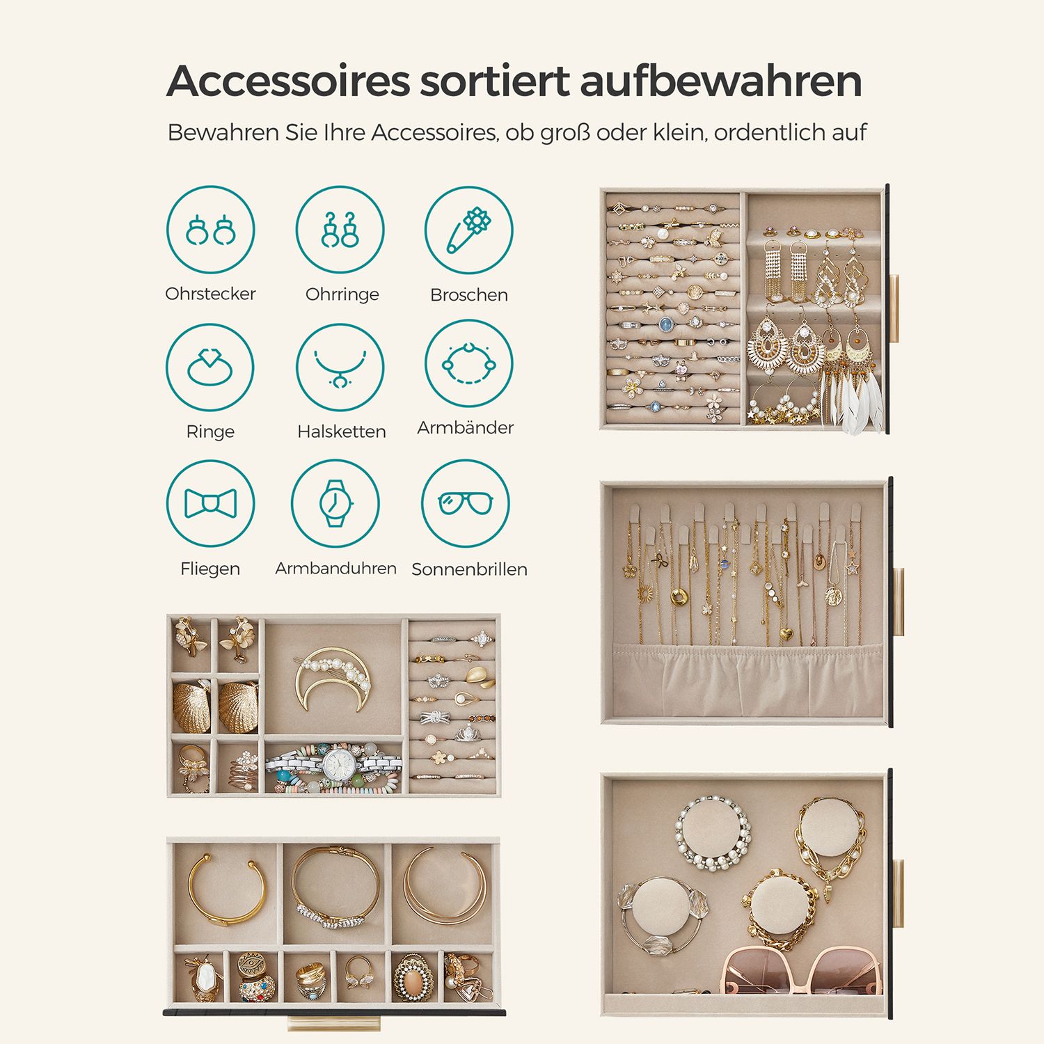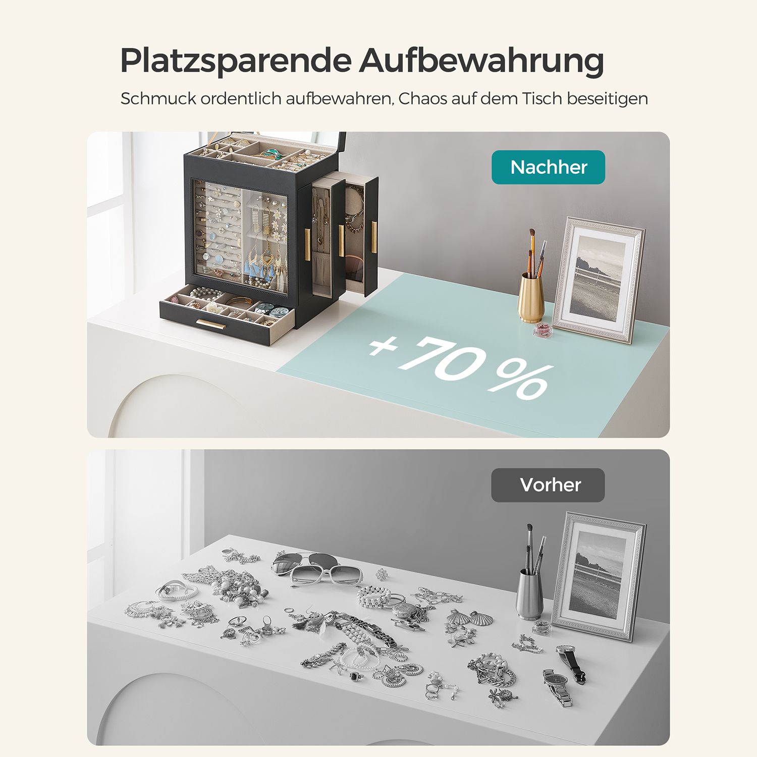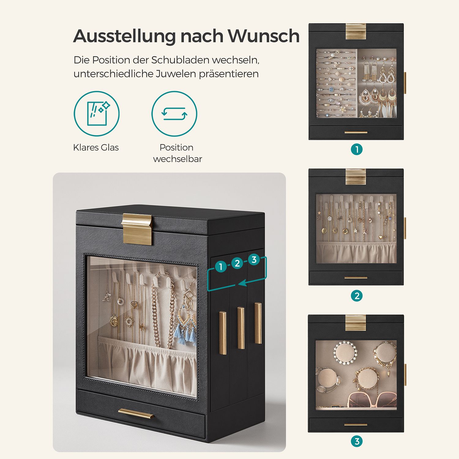 SONGMICS korurasia, korulaatikko 5 tasoa, korupakkaus, lasikansi, sivulaatikot, pystysuora säilytys, iso peili, moderni, korujen säilytys, grafiitinmusta-kultainen JBC162B02