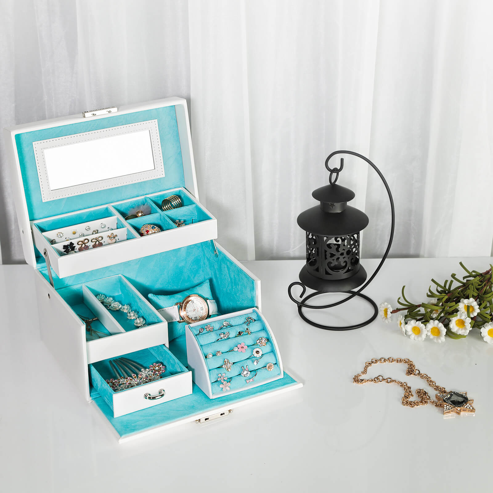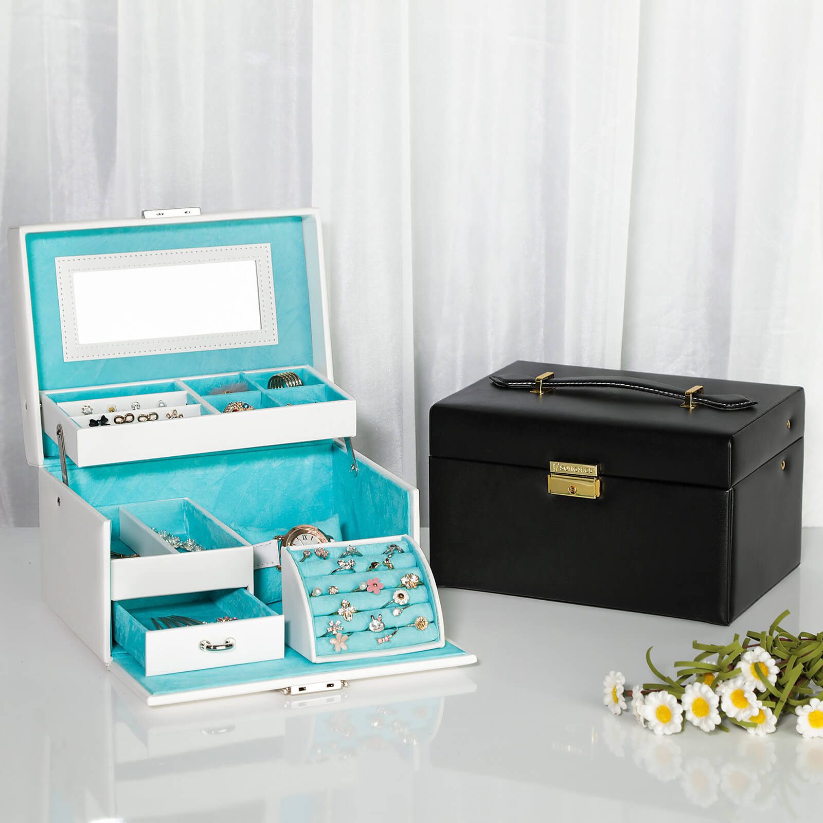 SONGMICS korulaatikko, korukotelo laatikoilla, korulaatikko peilillä ja lukolla, sormuksille, rannekelloille, korvakoruille, kaulakoruille, keinonahka ja sametti, lahjaksi, musta JBC114