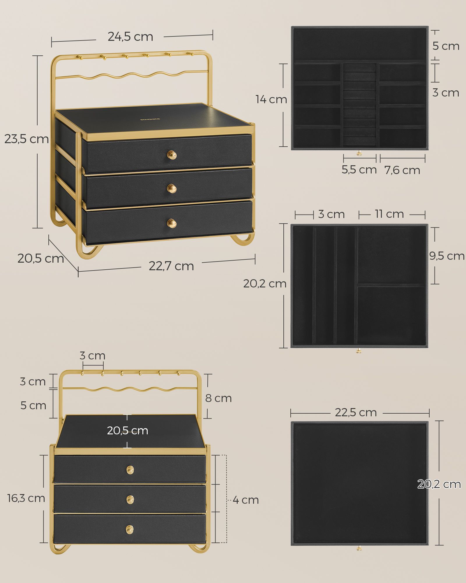 SONGMICS korurasia 3 tasoa, korurasia laatikoilla, avoin korusäilytys yläosassa, meikkipöydälle, metallirunko, 20,5 x 22,7 x 23,5 cm, lahjaidea