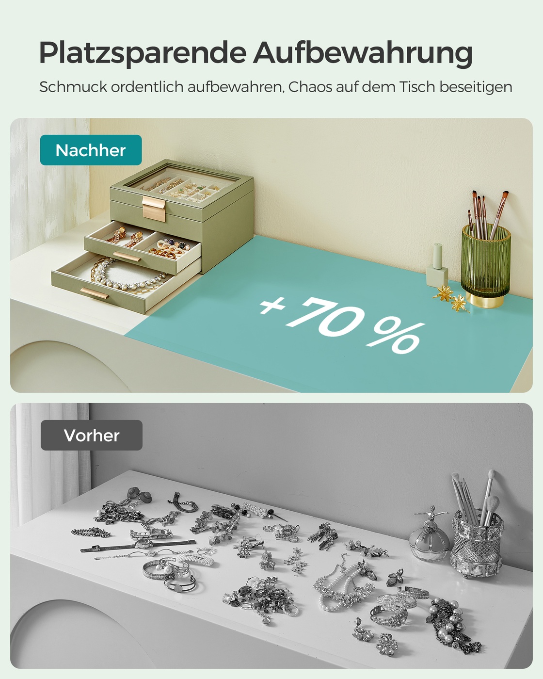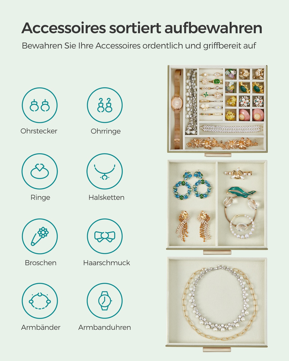 SONGMICS Korukotelo lasikannella 3-tasoinen korukotelo, 2-laatikkoinen korulaatikko, korujen säilytys, lahja rakkaimmillesi, valkoinen JBC239WT
