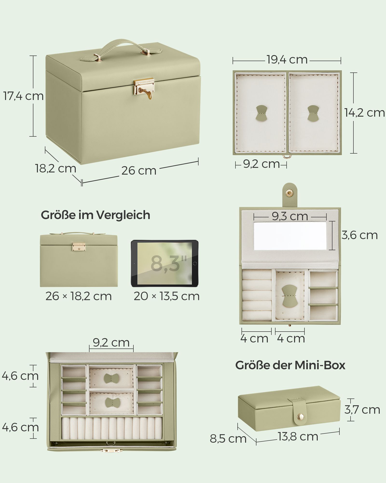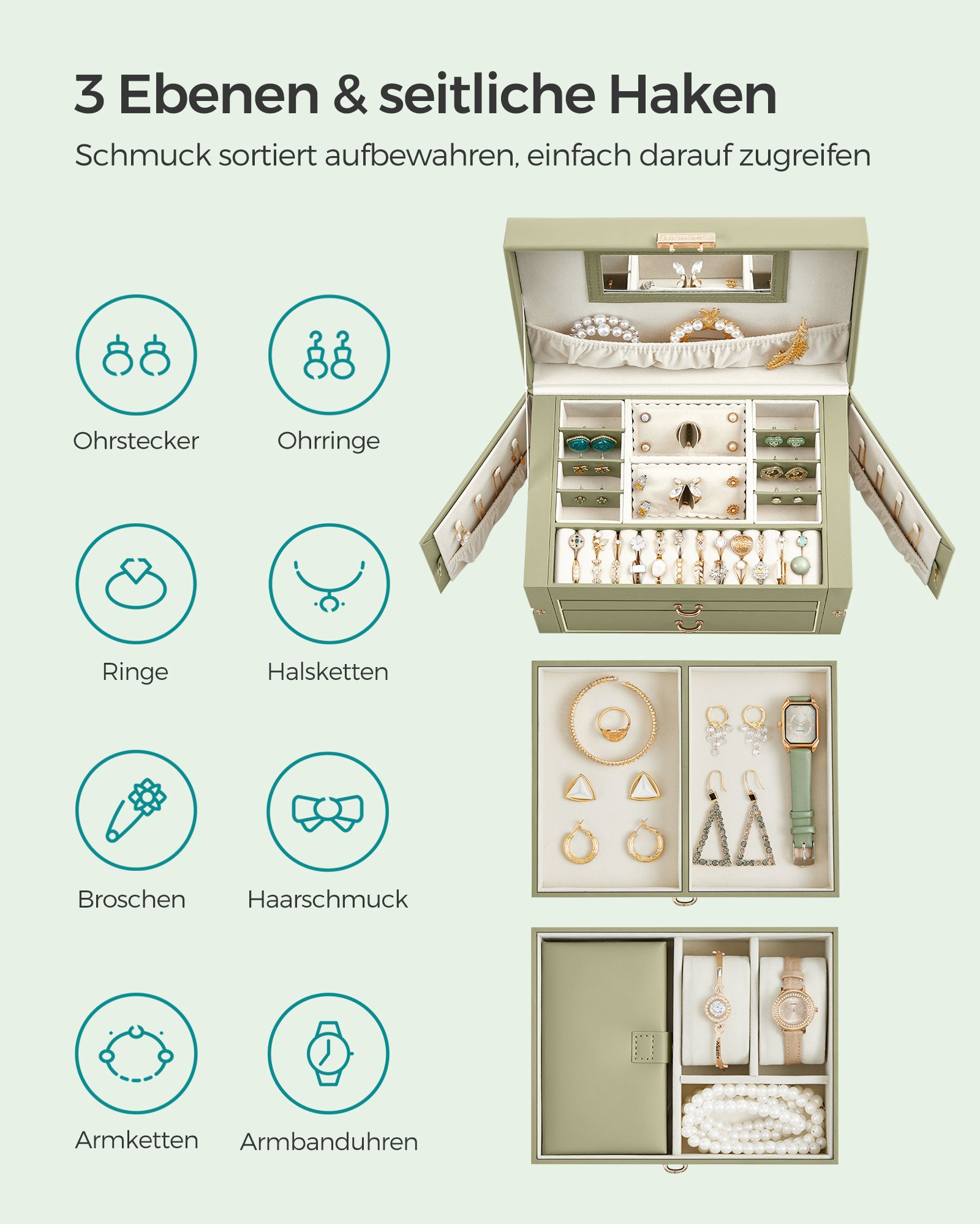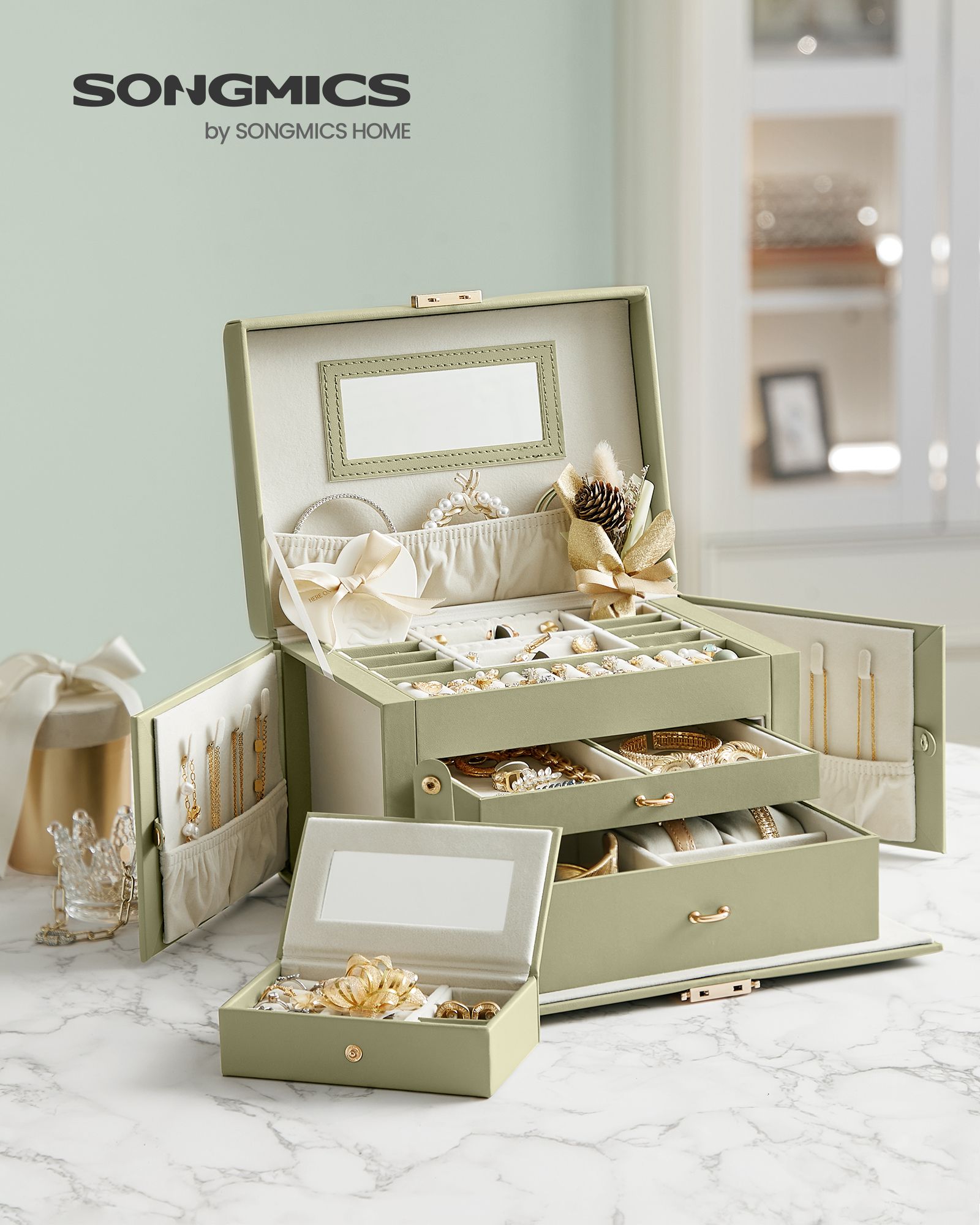 SONGMICS korulaatikko, korukotelo 2 laatikolla, lukittava, peilillä, irrotettava matkalaukku, sormuksille, rannekoruille, korvakoruille, kaulakoruille, samettivuori, lahjaksi, musta JBC121B