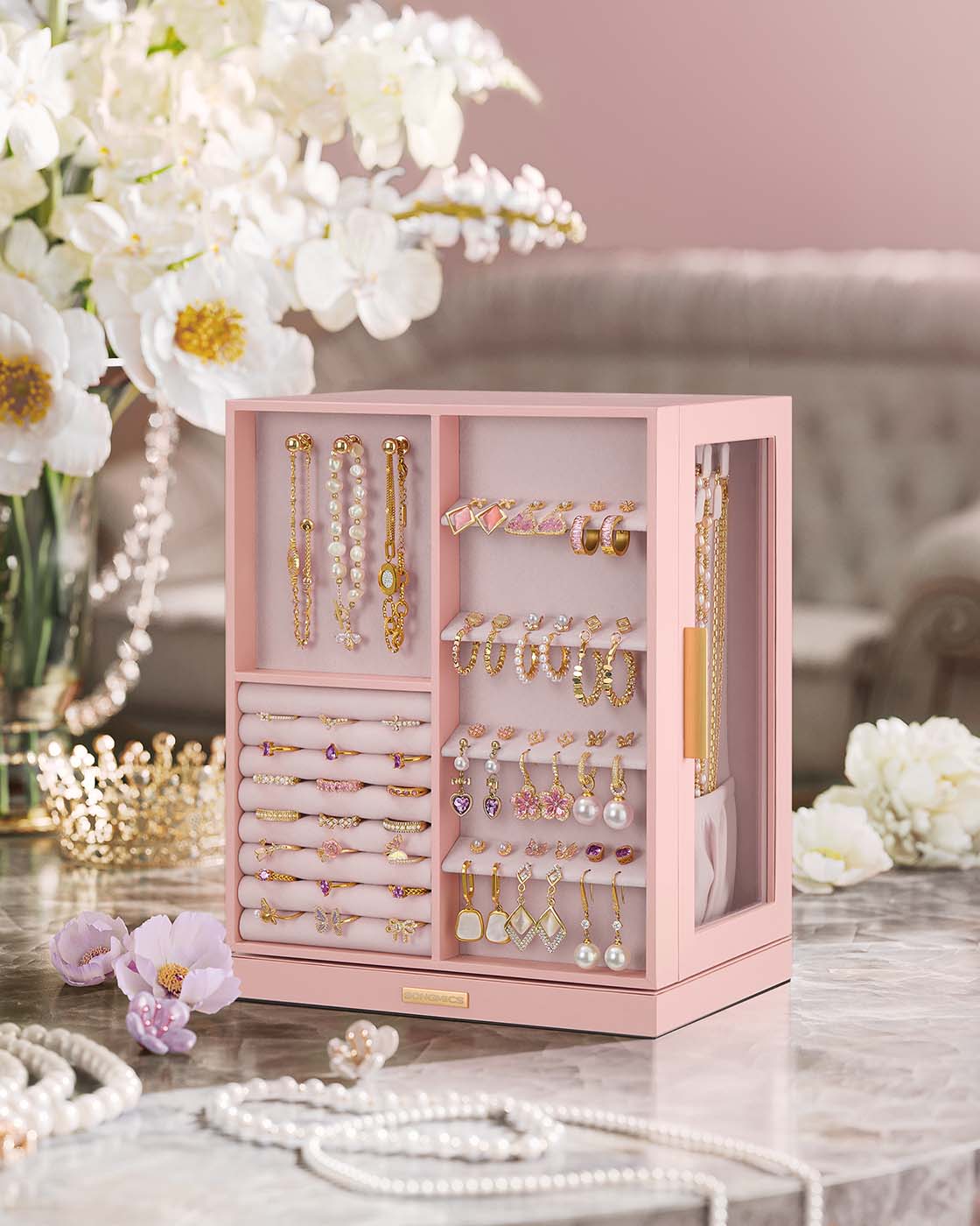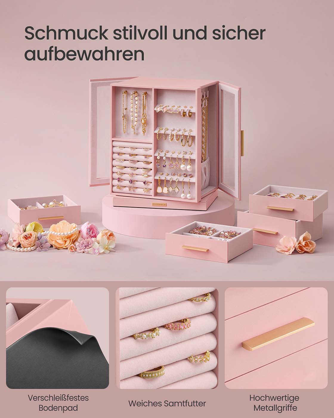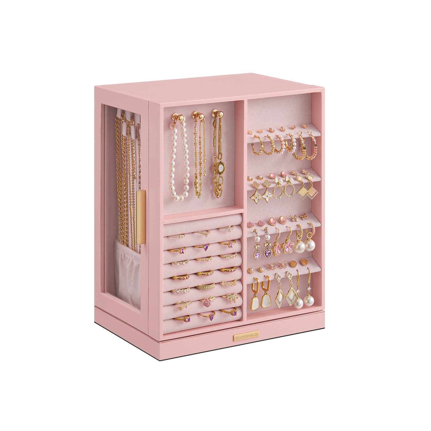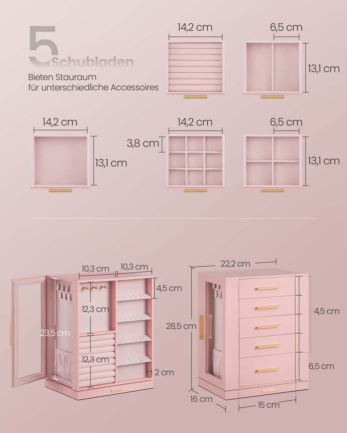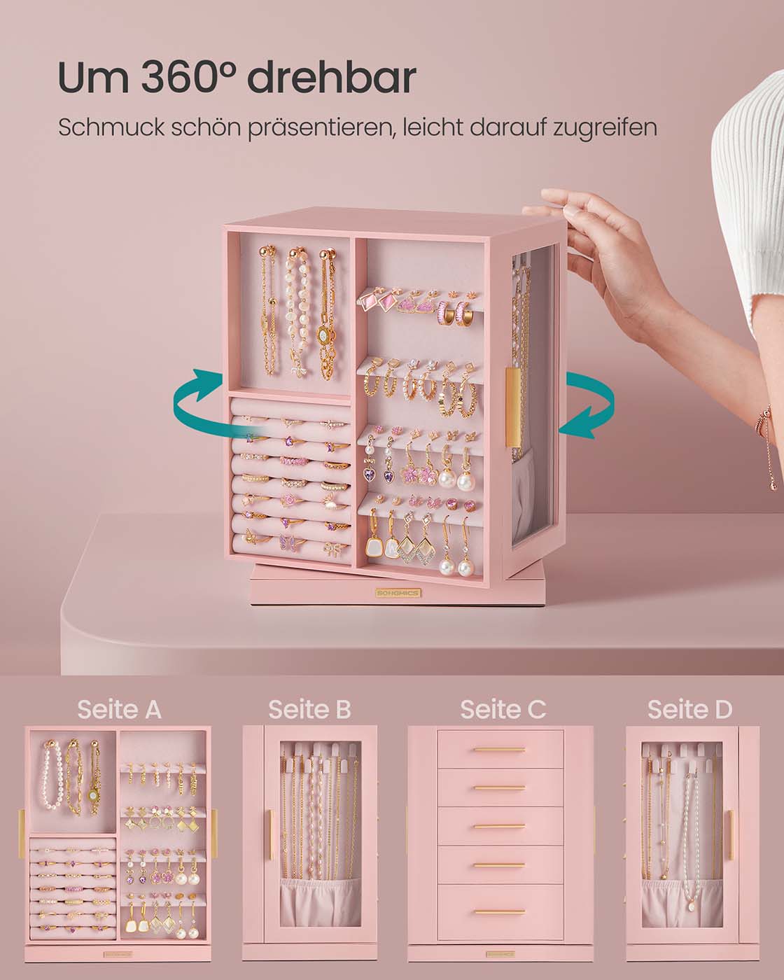 SONGMICS korurasia, 360° kääntyvä, SchSONGMICS korurasia 360° kääntyvä, korurasia 5 laatikkoa, sivulla lasi-ikkunat, tilava, pystysuora korujen säilytys, avoin muotoilu, lahjaidea korurasia 5 laatikkoa, sivulla lasi-ikkunat, tilava, pystysuora korujen säilytys, avoin muotoilu, lahjaidea