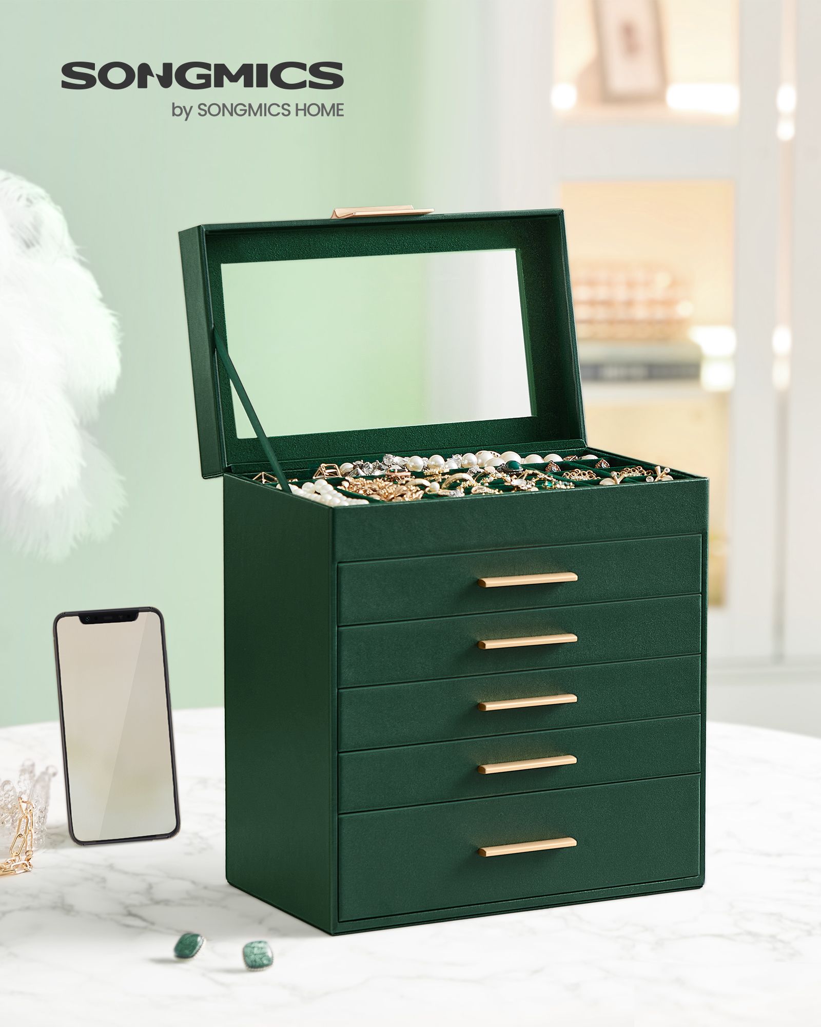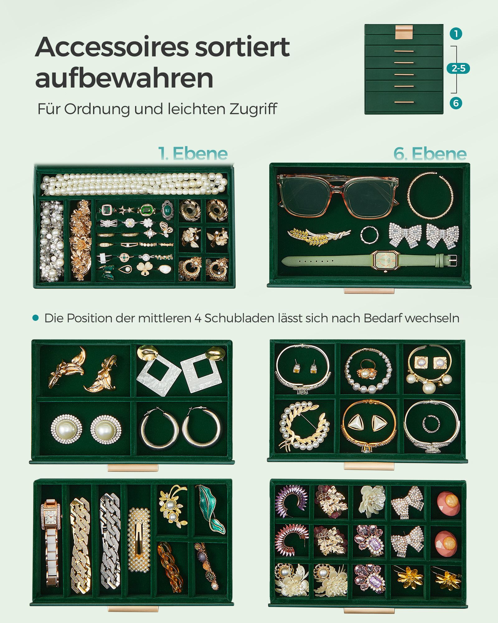 SONGMICS korurasia, 6-tasoinen korulaatikko, korurasia lasikannella, 5 laatikkoa, aurinkolaseille, suurille koruille, korujen säilytys, moderni, kyyhkynharmaa-kultainen JBC171G01