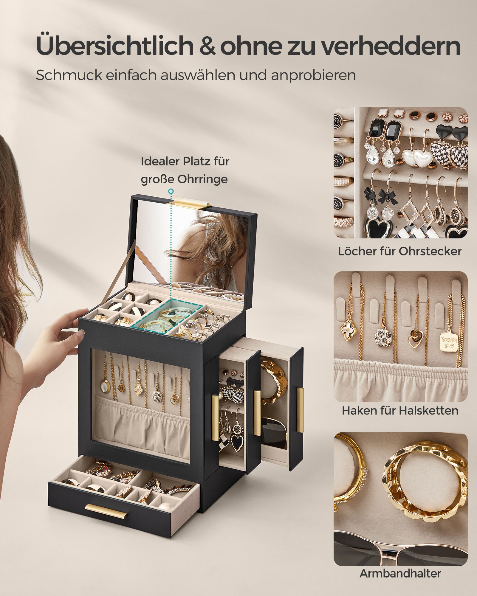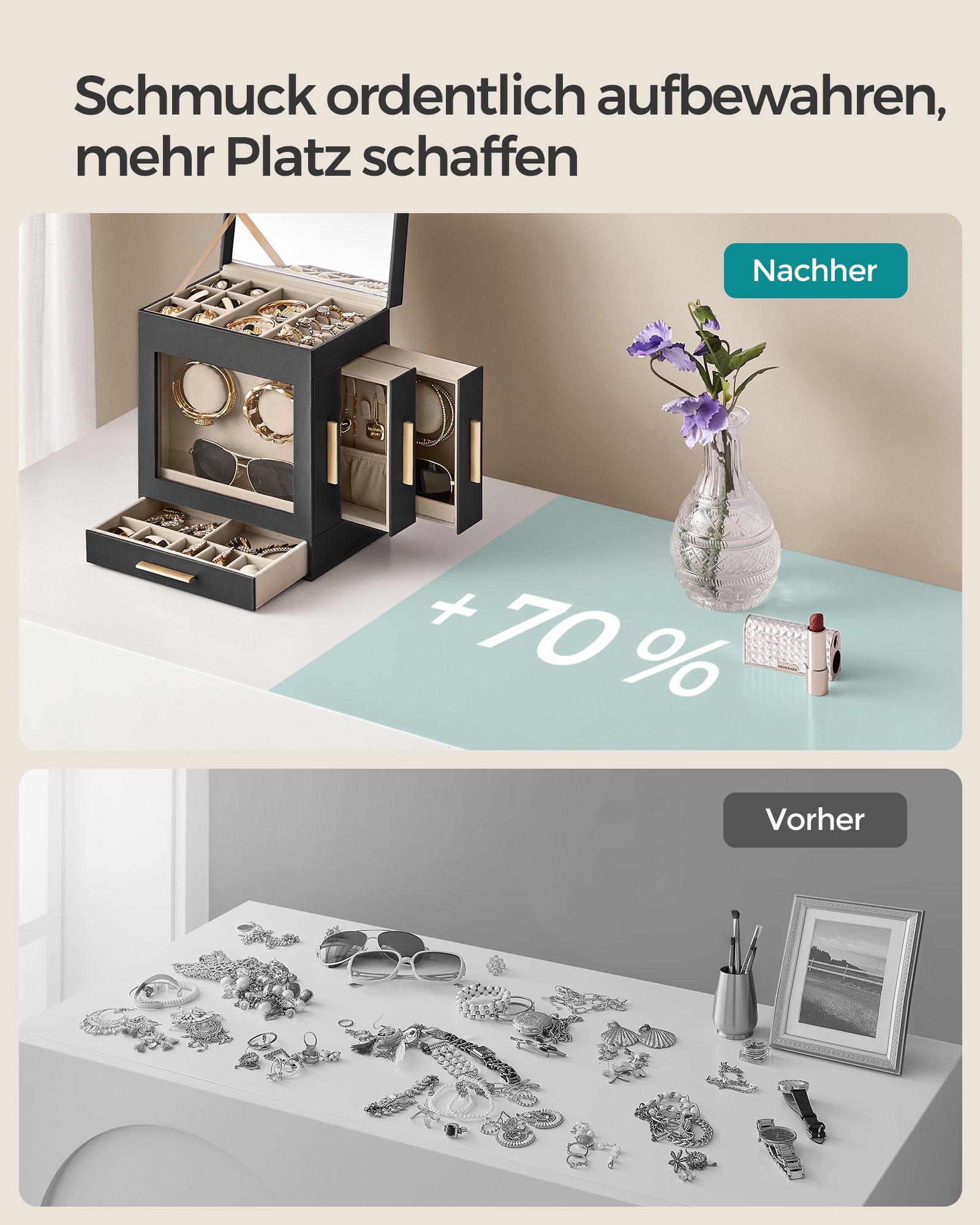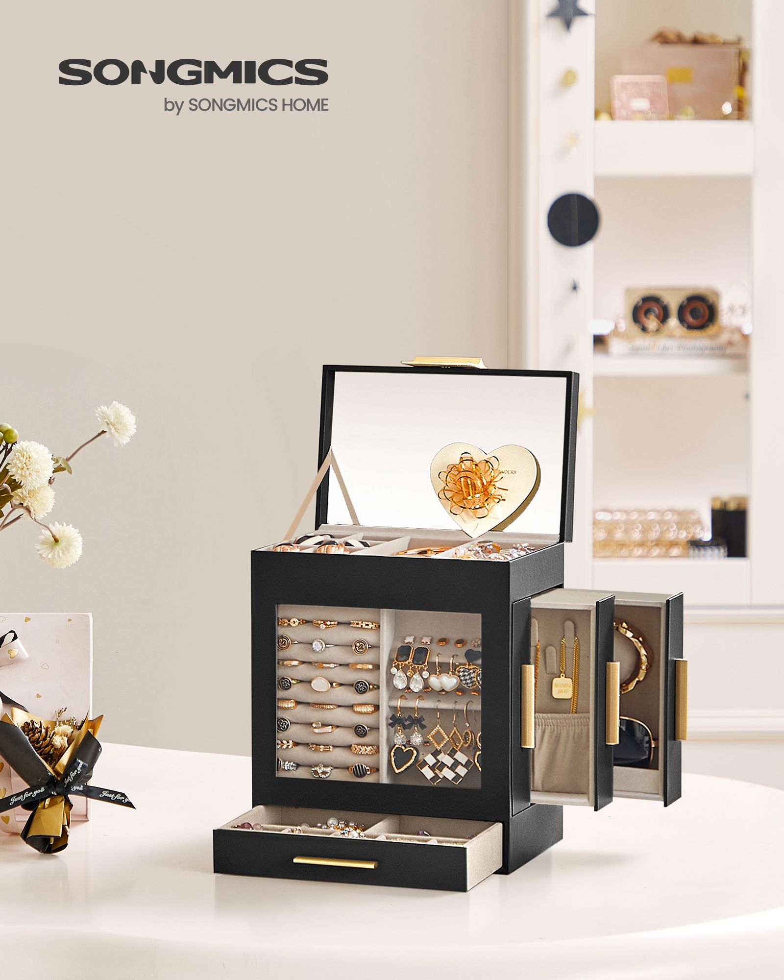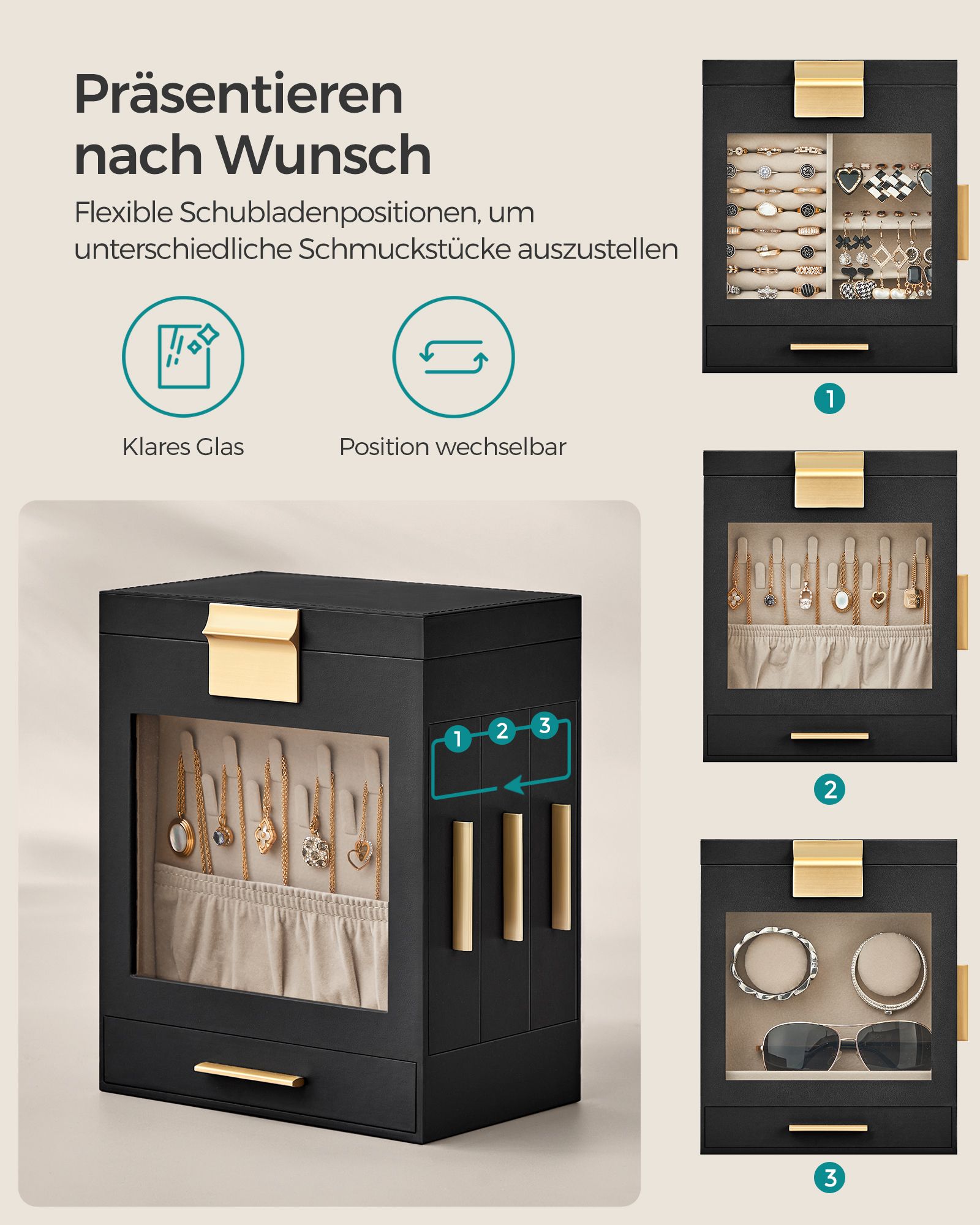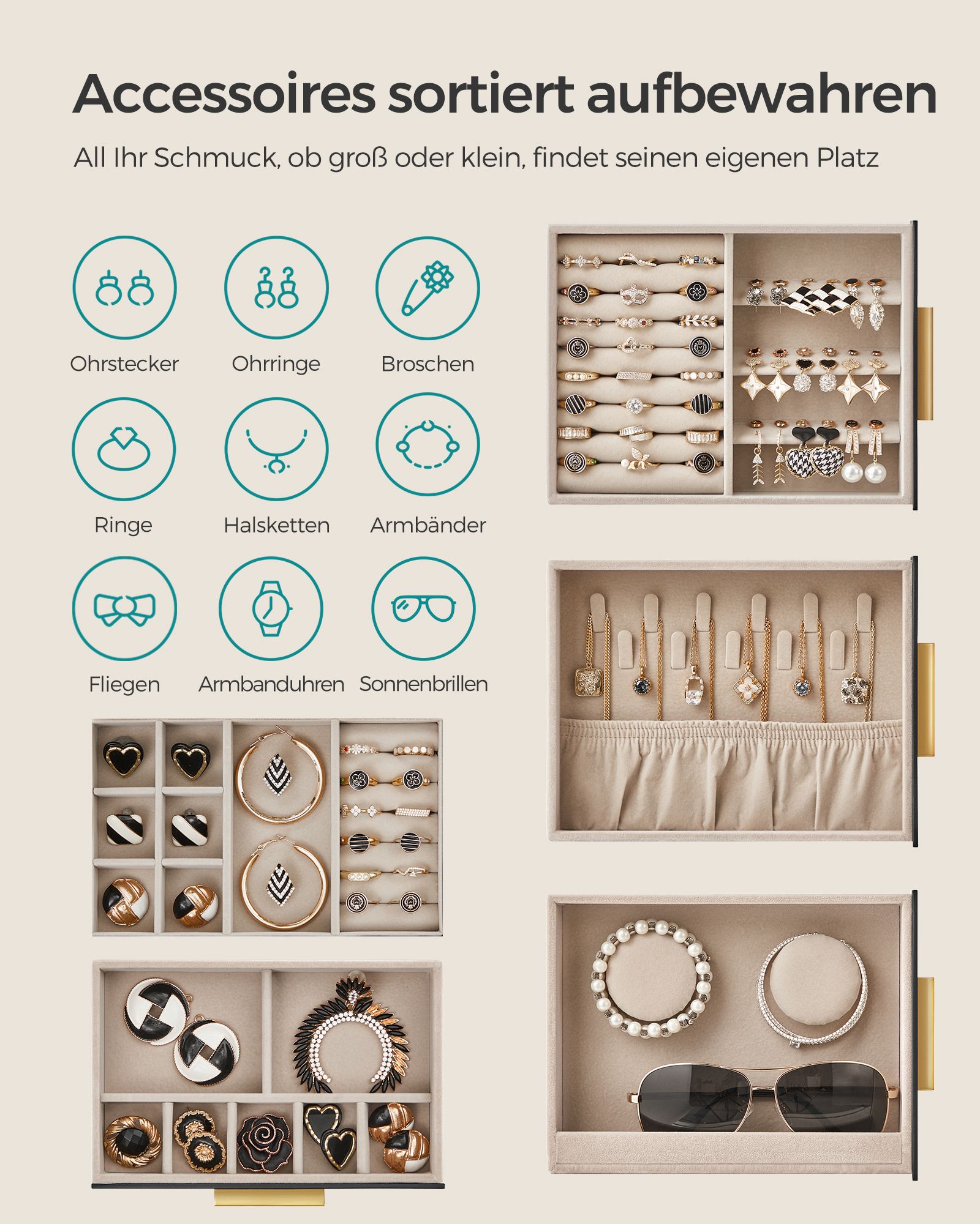 SONGMICS korurasia, 6-tasoinen korulaatikko, korurasia lasikannella, 5 laatikkoa, aurinkolaseille, suurille koruille, korujen säilytykseen, moderni, pilvinen valkoinen-kultainen JBC171W01