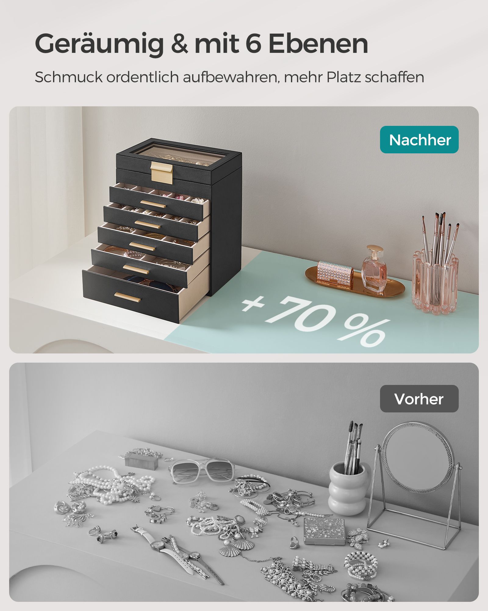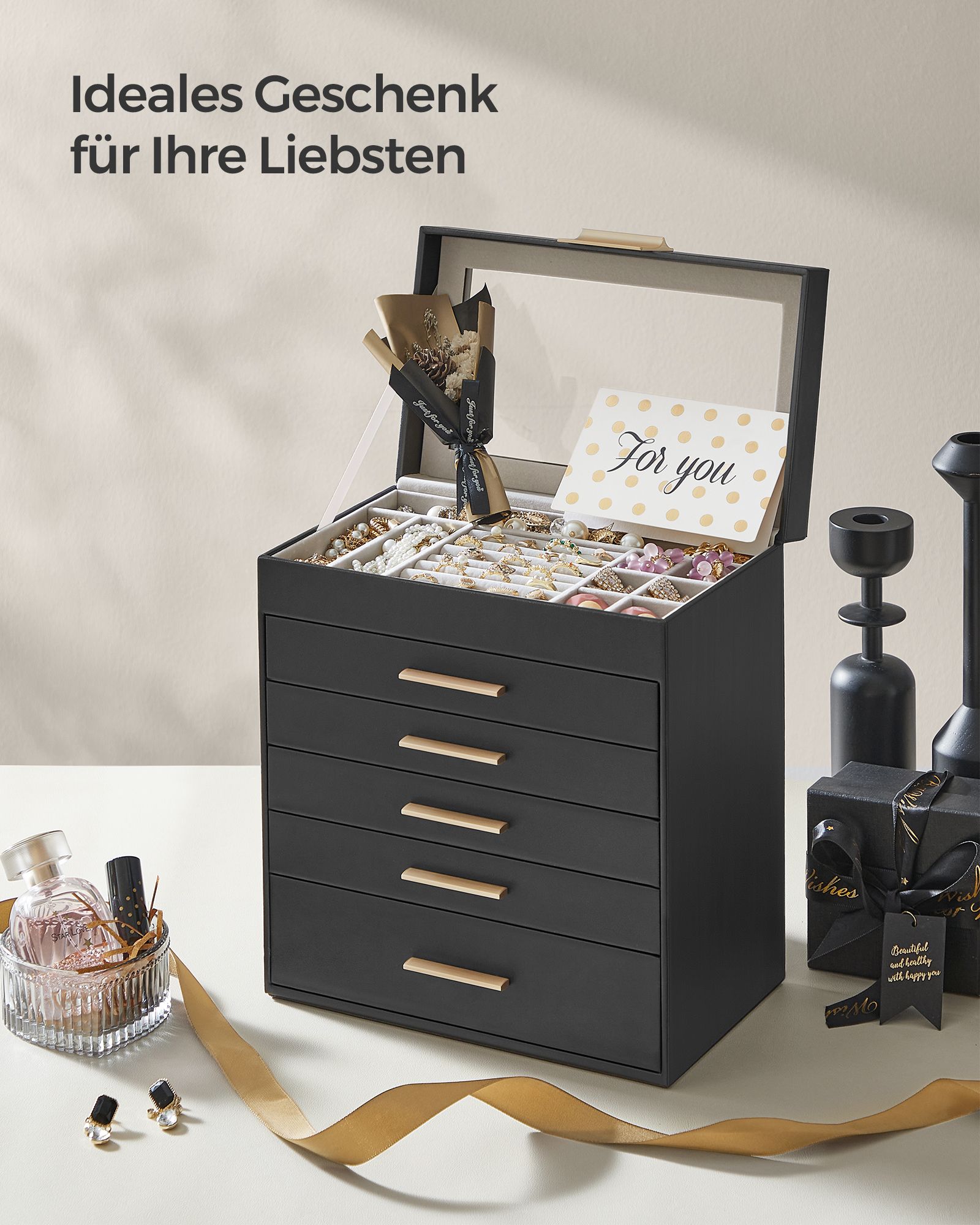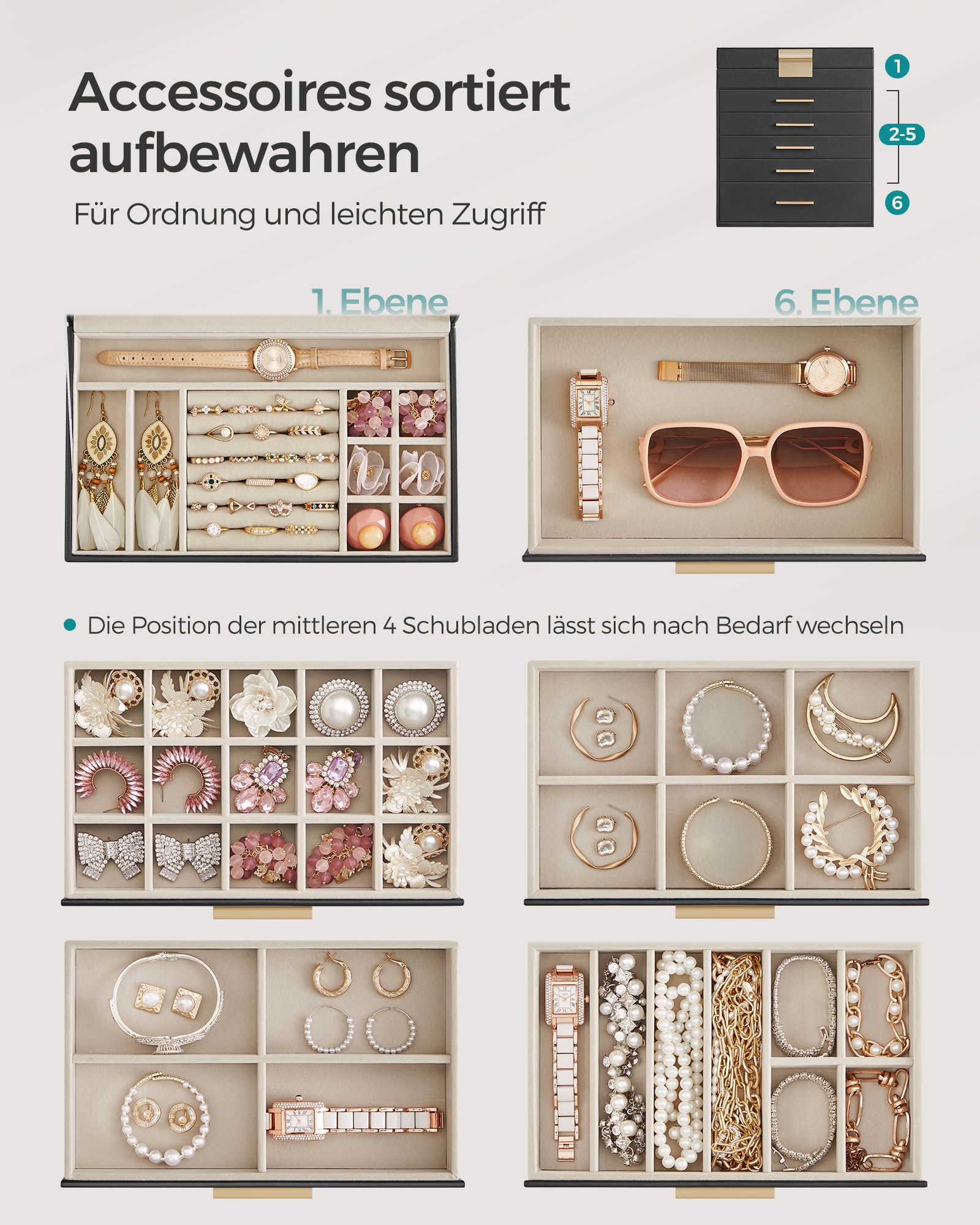 SONGMICS korurasia, 6-tasoinen korulaatikko, korurasia lasikannella, 5 laatikkoa, aurinkolaseille, suurille koruille, korujen säilytys, moderni, kyyhkynharmaa-kultainen JBC171G01