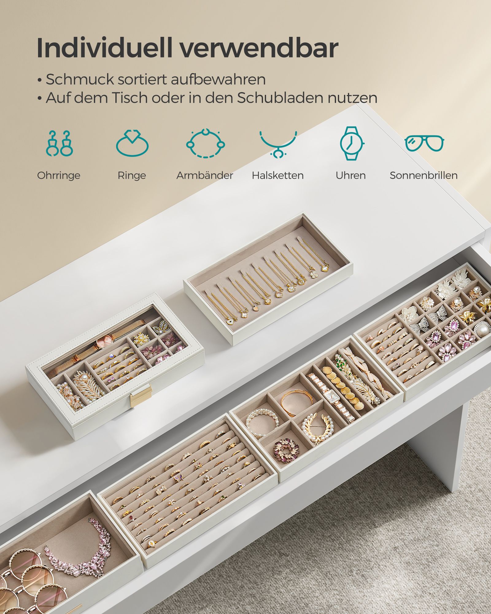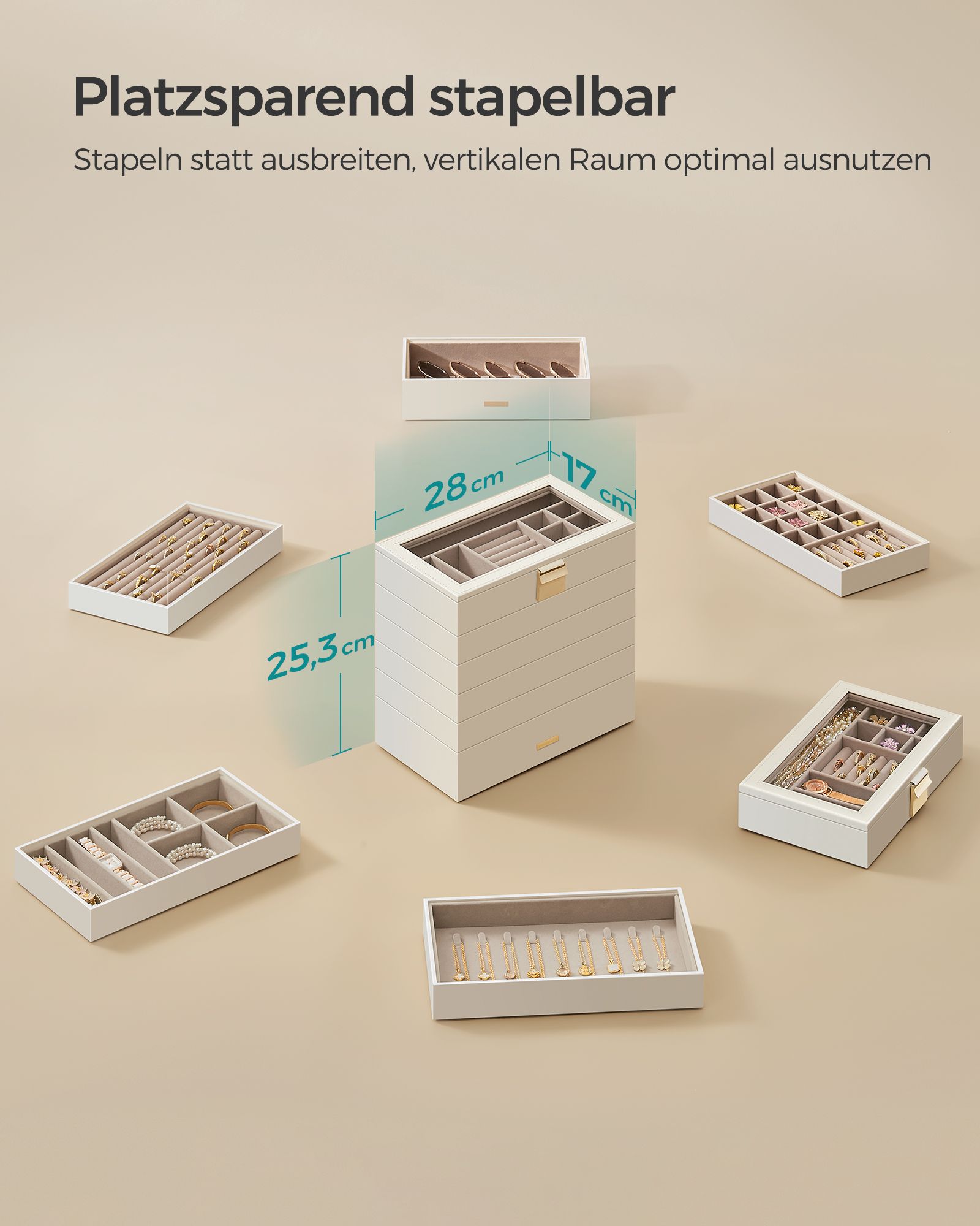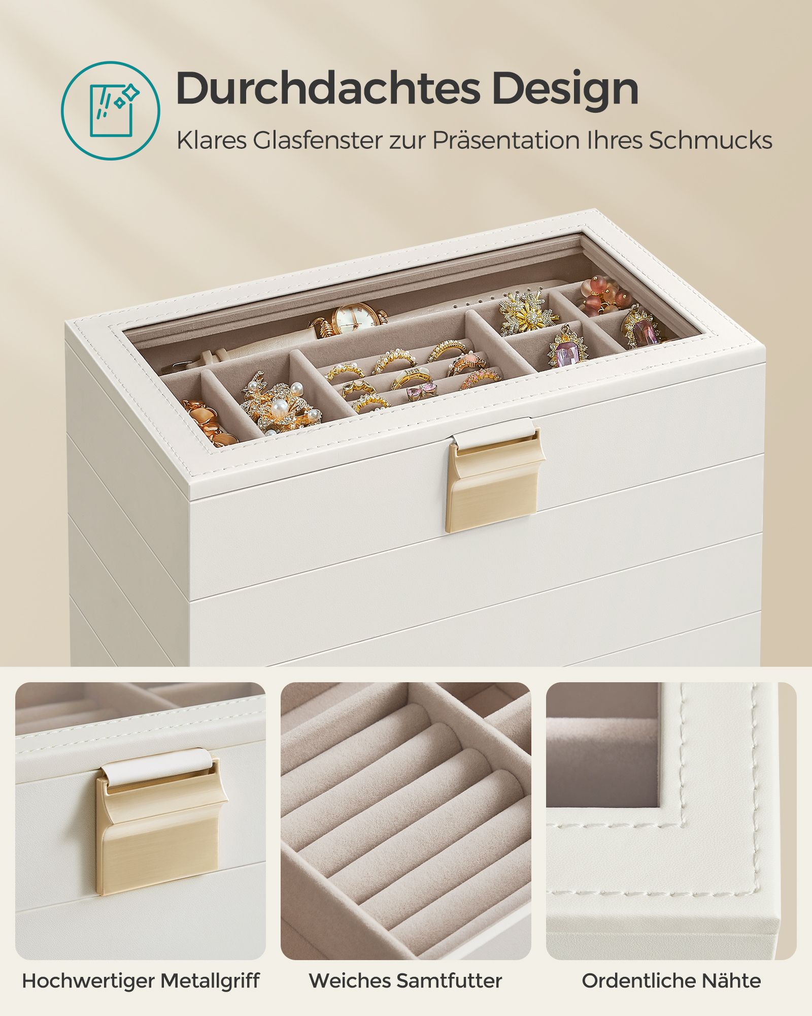 SONGMICS korurasia 4 tasoa, pinottava koruteline, iso korurasia, korurasia lasikannella, 17 x 28 x 18,3 cm, koruteline laatikoihin, lahjaidea, valkoinen JBC164W01