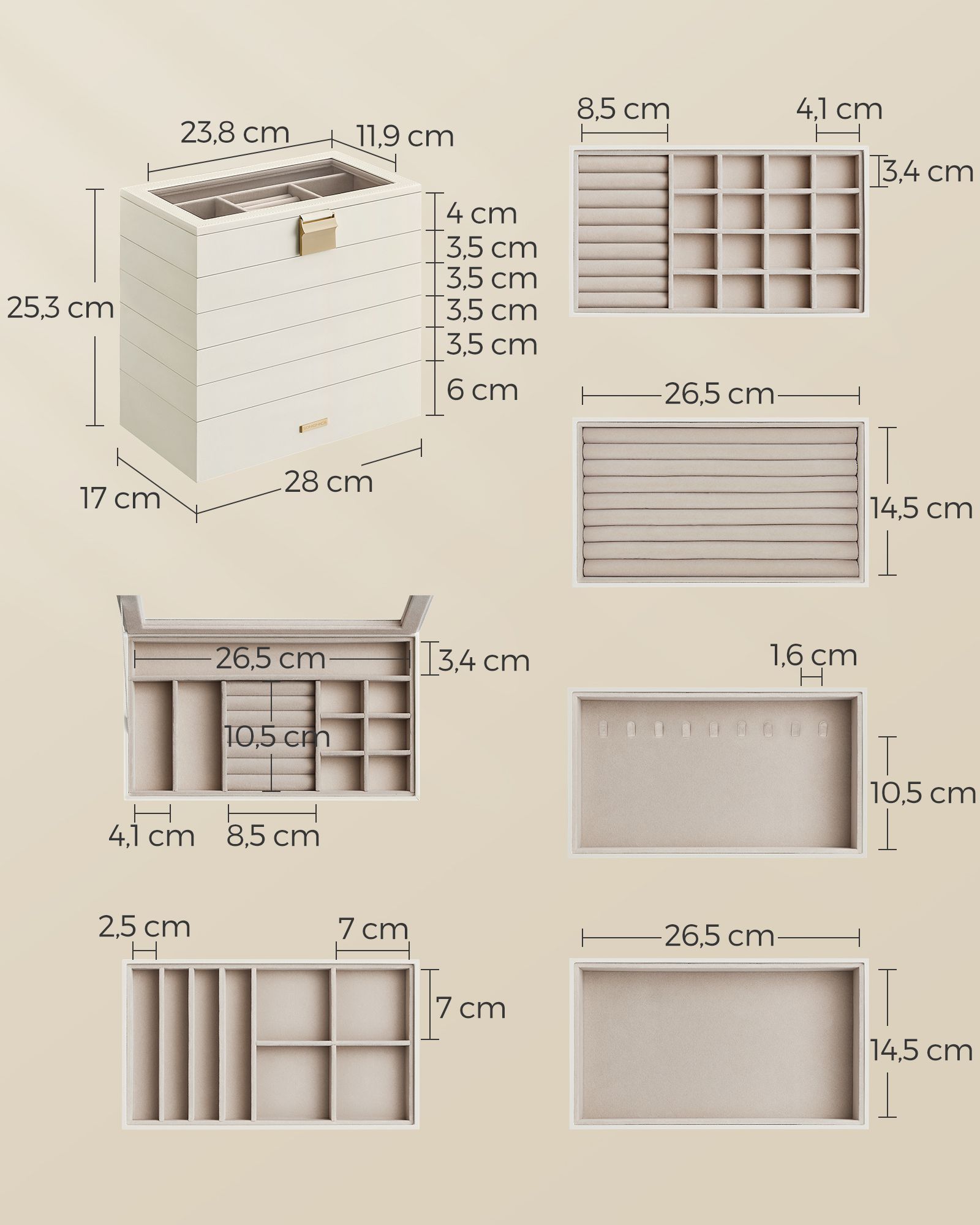 6. taso: 17 x 28 x 6 cm (S x L x K)