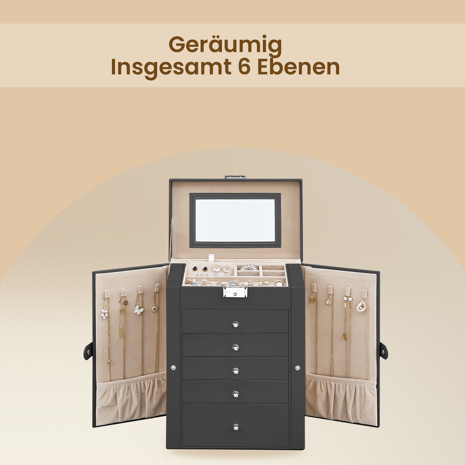 Löydä jokaisen korun kauneus Ovatko korusi hajallaan ympäri taloa ja jotkut niistä ovat olleet pitkään käyttämättöminä, koska olet unohtanut, missä ne ovat? Sitten sinun kannattaa kokeilla tätä korujen säilytyslaatikkoa! Lukuisat lokerot mahdollistavat korujesi selkeän ja kätevän säilytyksen. Valitse sopivat korut helposti tästä laatikosta ja ihaile itseäsi kannen suuressa peilissä! Yksinkertaisuus on trendikästä Musta pinta, kiiltävät metalliosat, yksinkertainen ulkonäkö – tämä korulaatikko tuo ajatonta charmia meikkipöydällesi tai korukauppaasi. Tämän laatikon avulla voit säilyttää kimaltelevat korusi siististi yhdessä paikassa – mikä silmänilo! Lisäksi tämä laatikko sopii täydellisesti lahjaksi ystävillesi ja rakkaillesi. Tuotetiedot: – Väri: musta – Materiaali: MDF (keskitiheä kuitulevy), PU-päällyste (polyuretaani), samettivuori – Kokonaismitat: 26 x 15,5 x 32 cm (P x L x K) – Paino: 3,2 kg Toimitus sisältää: – 1 x korulaatikko