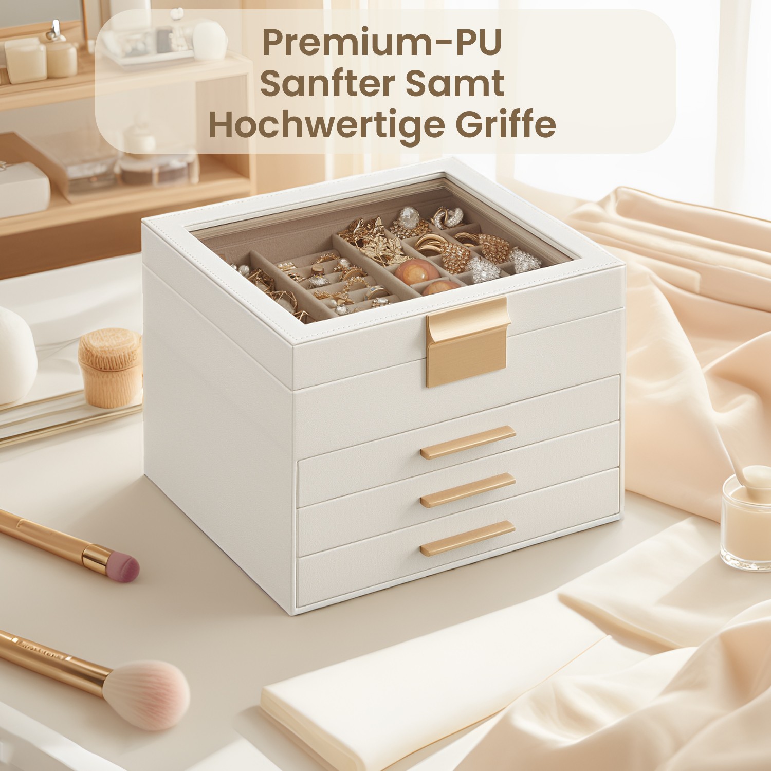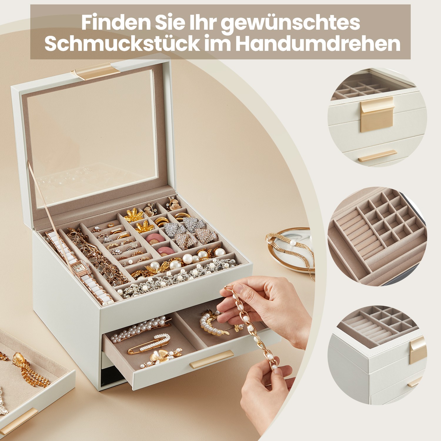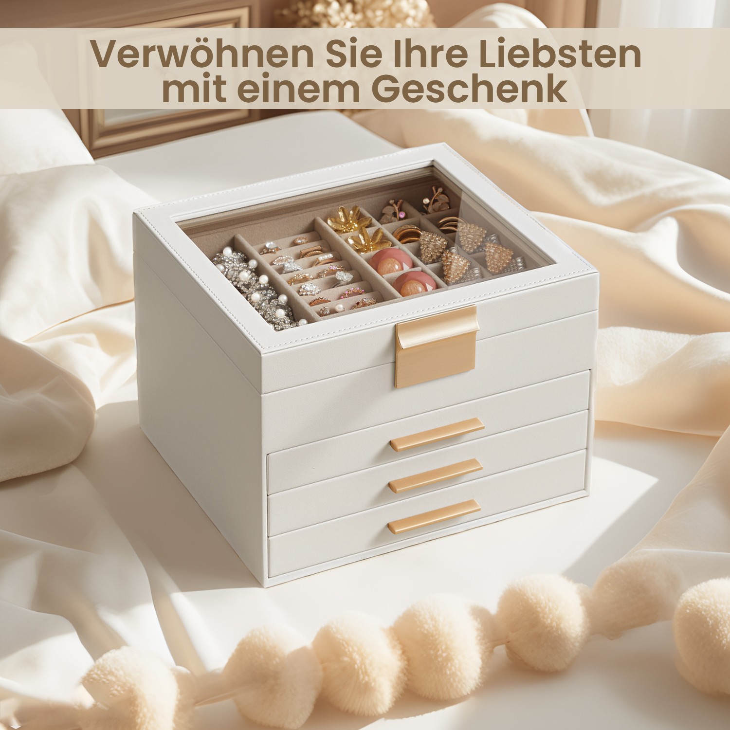 Korurasia, korulaatikko 3 tasoa, korurasia lasikannella, 2 laatikkoa, korujen säilytys, moderni, pilvinen valkoinen-kulta