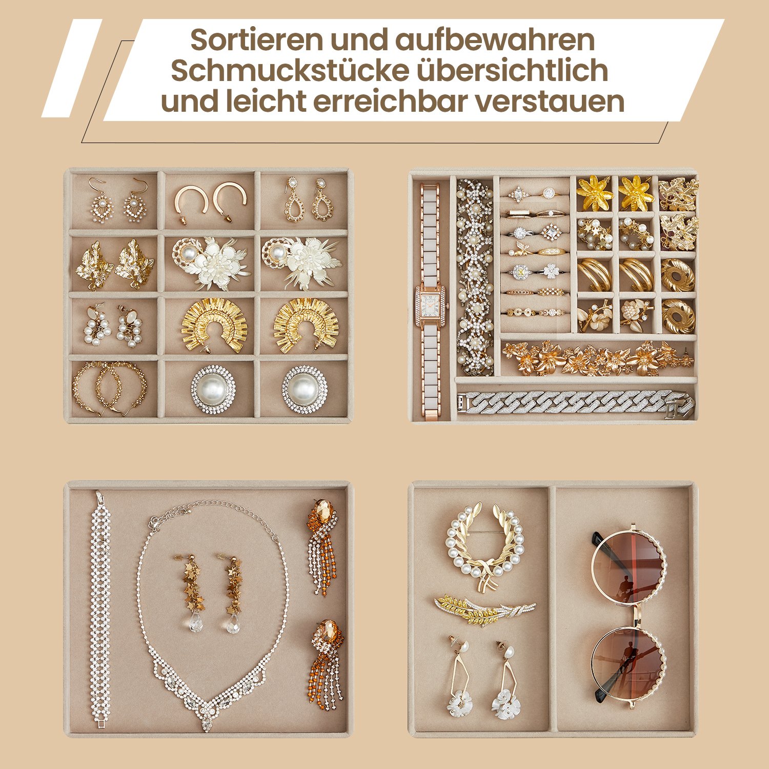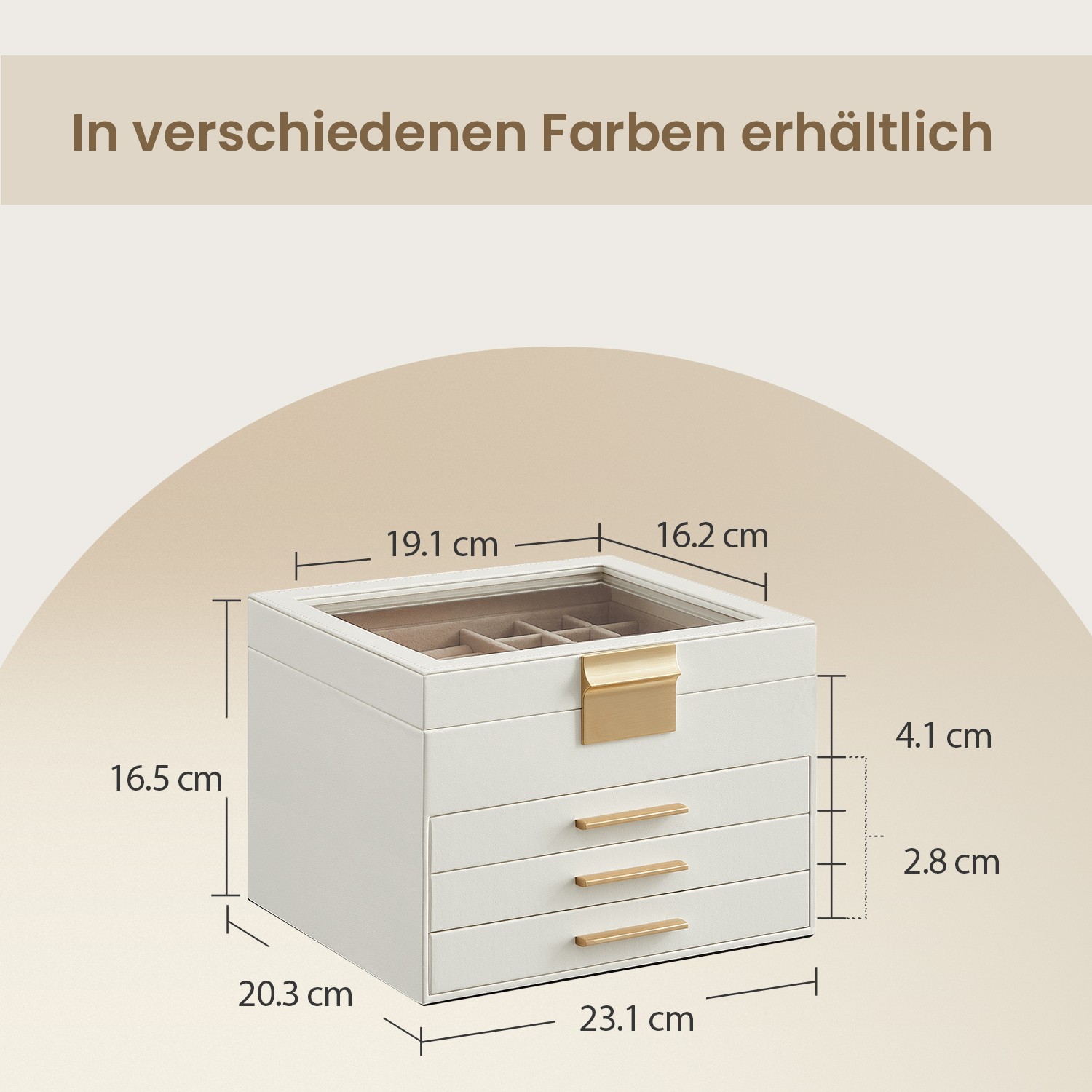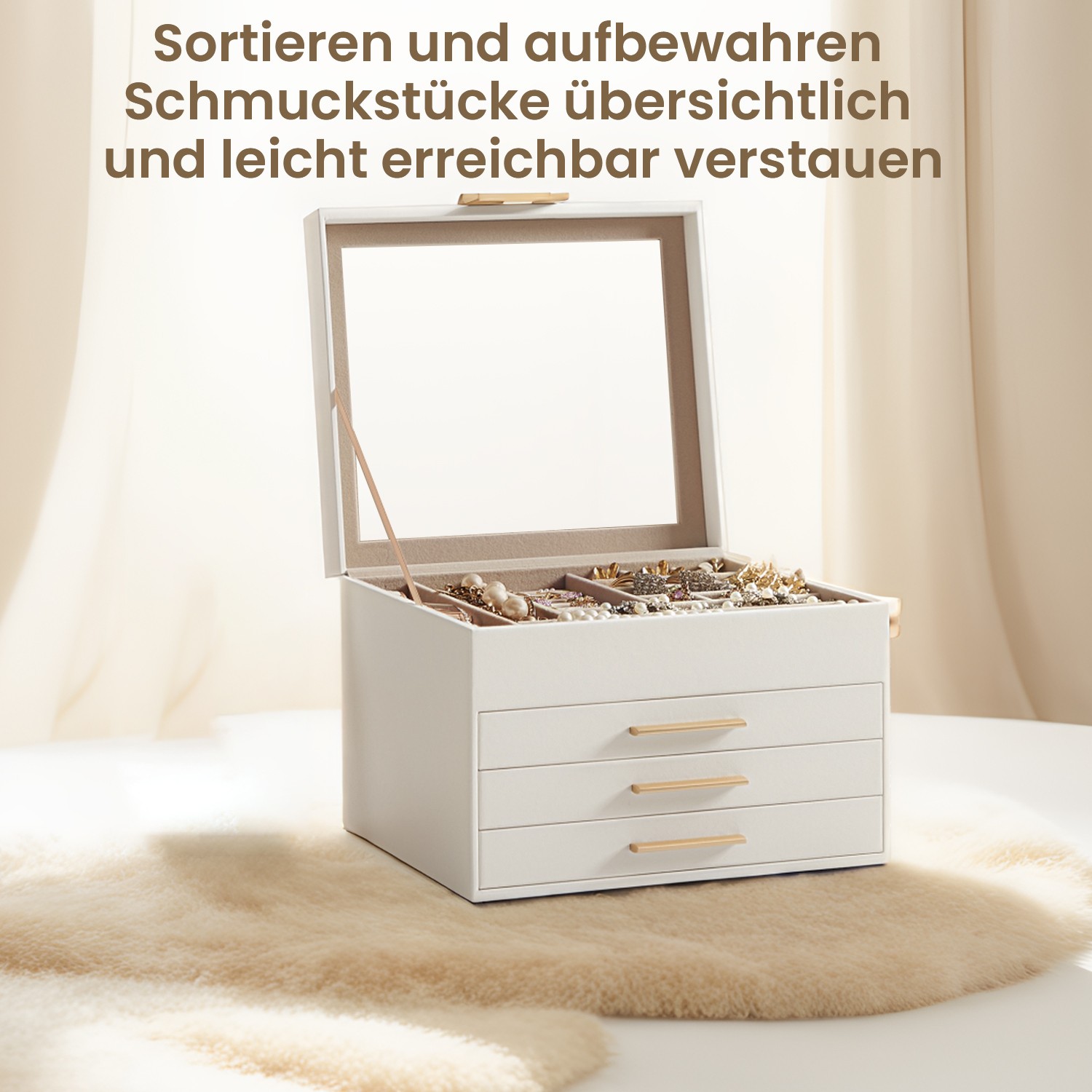 Korurasia, korulaatikko 3 tasoa, korurasia lasikannella, 2 laatikkoa, korujen säilytys, moderni, pilvinen valkoinen-kulta