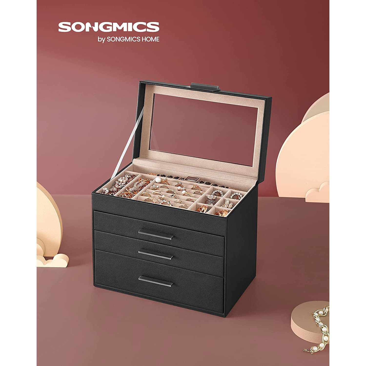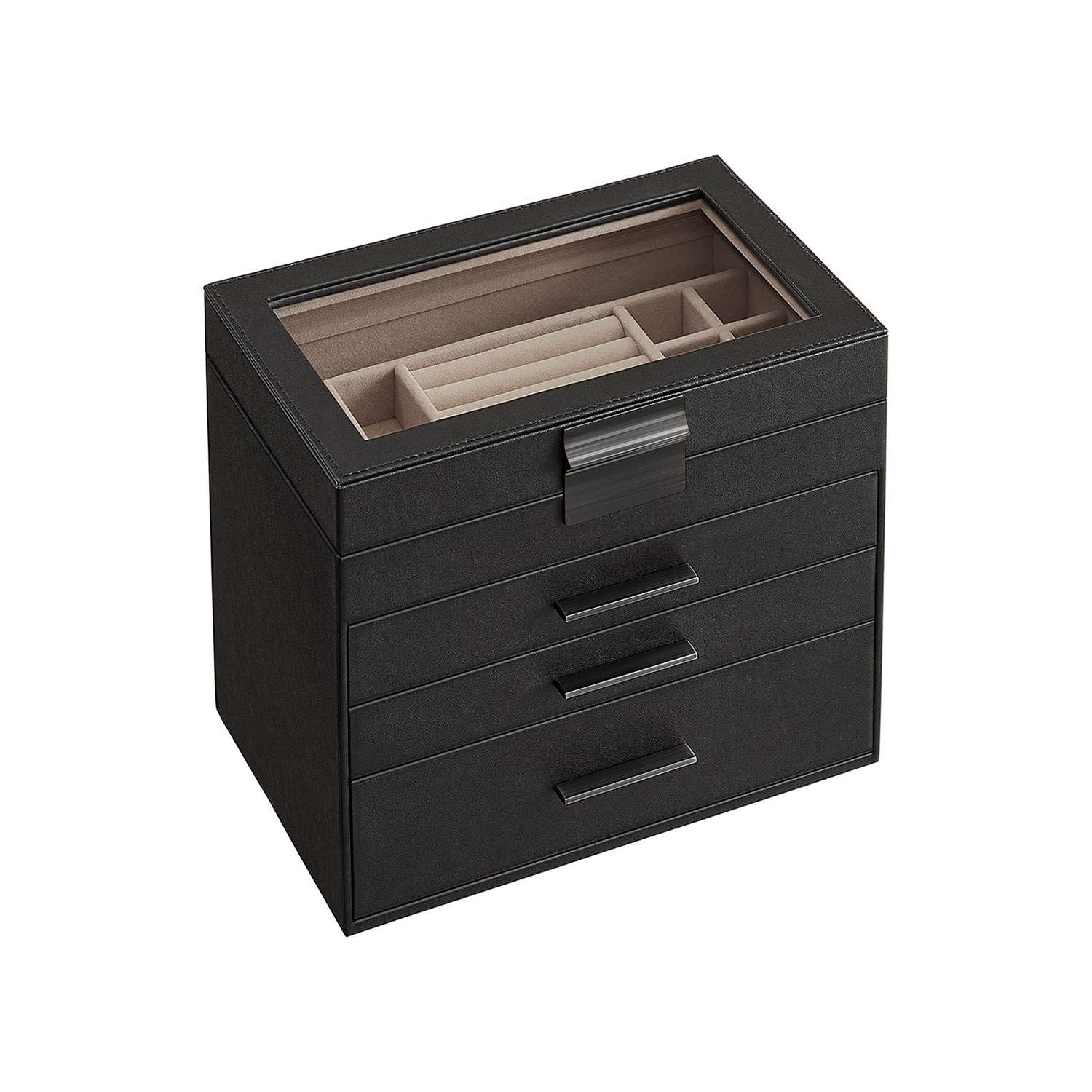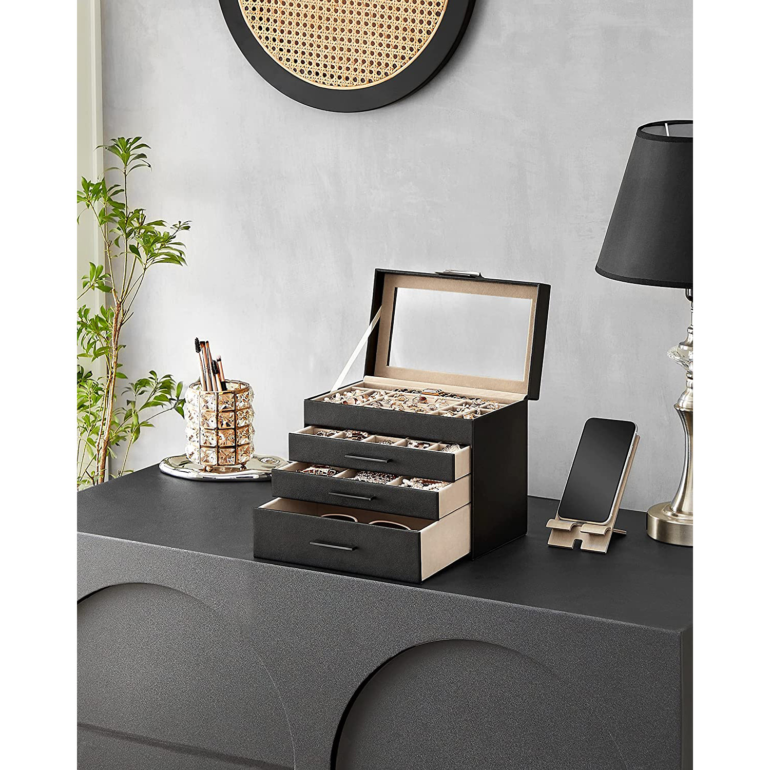 SONGMICS korurasia, 4-tasoinen korulaatikko, korurasia lasikannella, 3 laatikkoa, aurinkolaseille, suurille koruille, korujen säilytys, moderni, grafiitinmusta-kultainen JBC161B02
