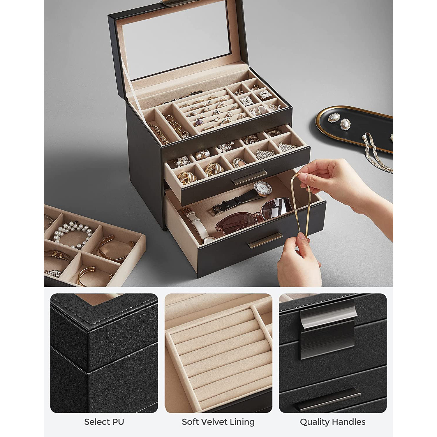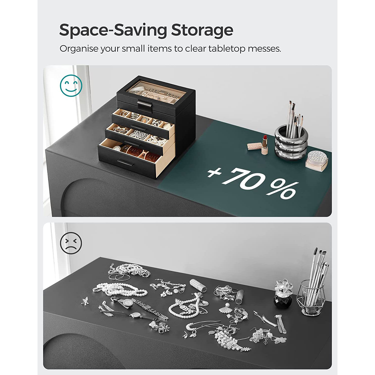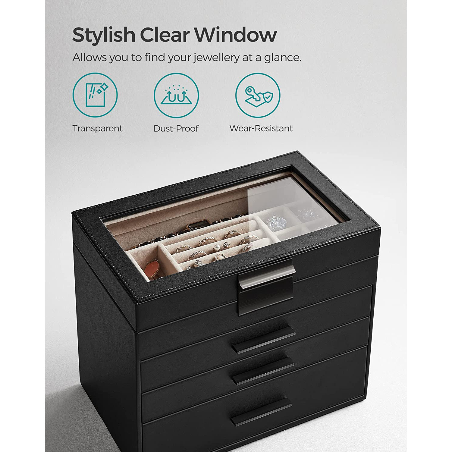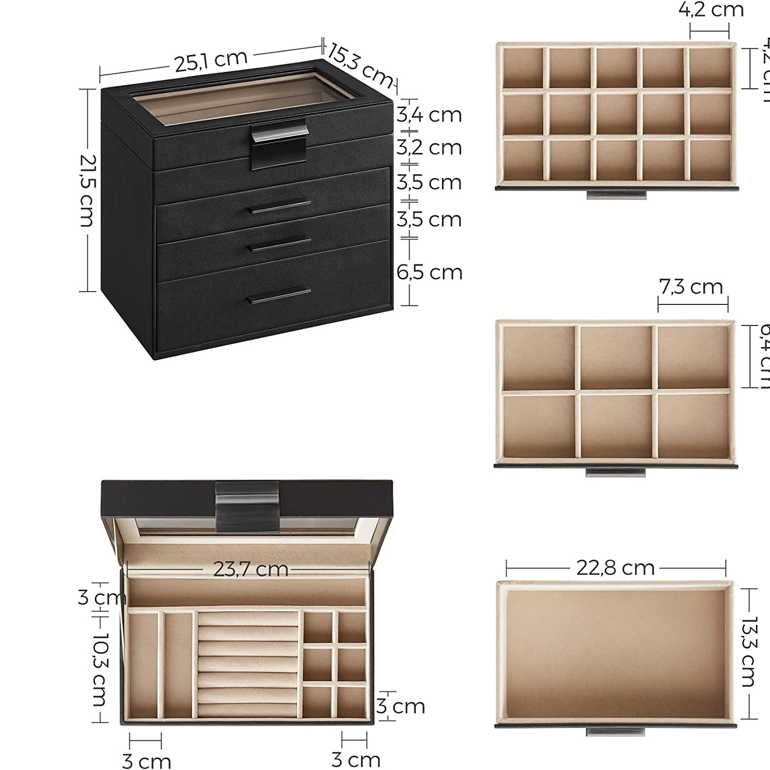 SONGMICS korurasia, 4-tasoinen korulaatikko, korurasia lasikannella, 3 laatikkoa, aurinkolaseille, suurille koruille, korujen säilytys, moderni, grafiitinmusta-kultainen JBC161B02