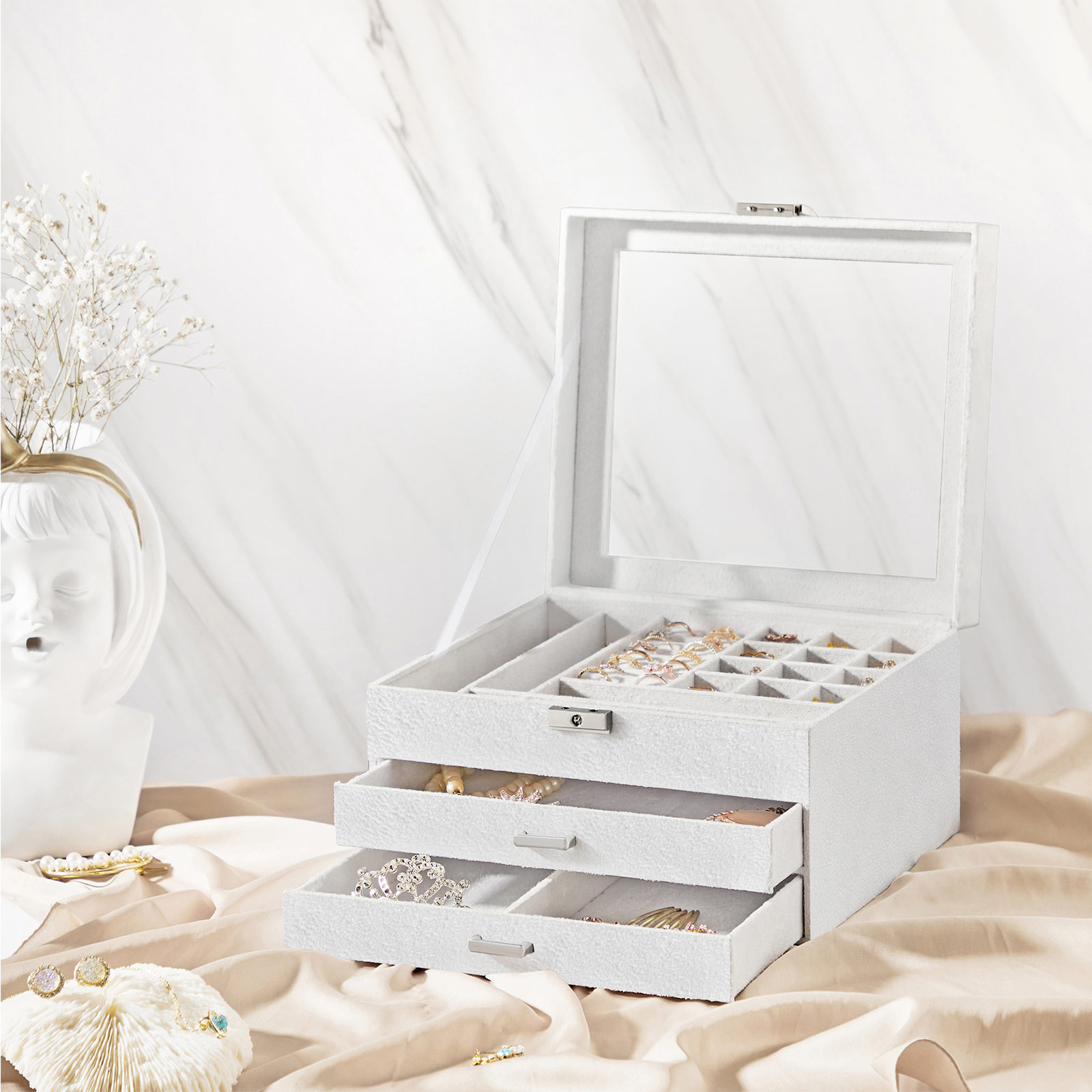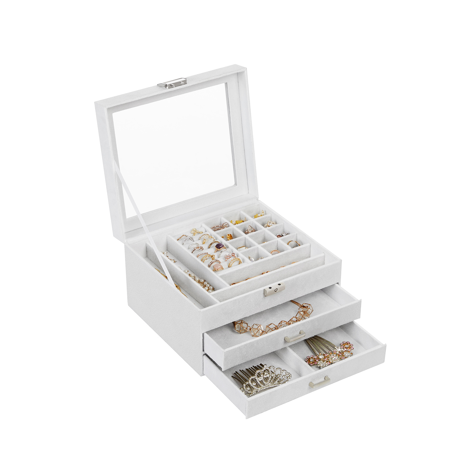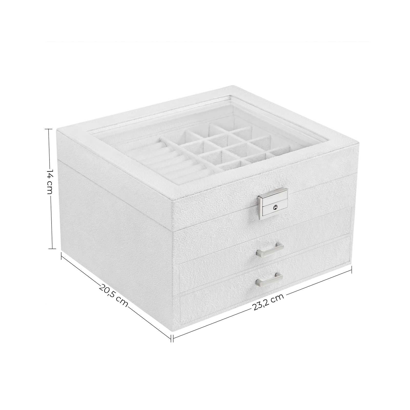 Hyviä uutisia korujen ystäville Ihailetko kaupan kimaltelevia koruja, mutta et voi viedä niitä kotiin, koska sinulla ei ole tilaa uusille koruille? Toinen korvakorusi on meikkipöydälläsi ja toinen on kadonnut selittämättömistä syistä? Tämä 3-tasoinen korurasia tulee apuusi. SONGMICS tietää, kuinka tärkeää on säilyttää korukokoelmasi siististi. Tämän korulaatikon kohokohdat: – Samettipäällinen ja -vuori; pehmeä ja kestävä – Tukeva puumateriaalirakenne – Läpinäkyvä lasikansi – Siististi viimeistellyt saumat; sinkkiseoksesta valmistetut kahvat – Valkoinen sävy – 2 laatikkoa, 8 rullatelineitä sormuksille, 12 neliönmuotoista lokeroa ja 4 kapeaa lokeroa Tuotetiedot:- Väri: valkoinen – Materiaali: MDF (keskitiheä kuitulevy), sametti – Koko: 23,2 x 20,5 x 14 cm (P x L x K) – Paino: 1,3 kg Toimitus sisältää: – 1 x korurasia – 1 x avain SONGMICS-huomautukset: – Avain on erittäin pieni. Säilytä se siksi lasten ulottumattomissa turvallisessa paikassa, jotta vältät terveysriskit, jotka voivat aiheutua avaimen hengittämisestä tai nielemisestä.