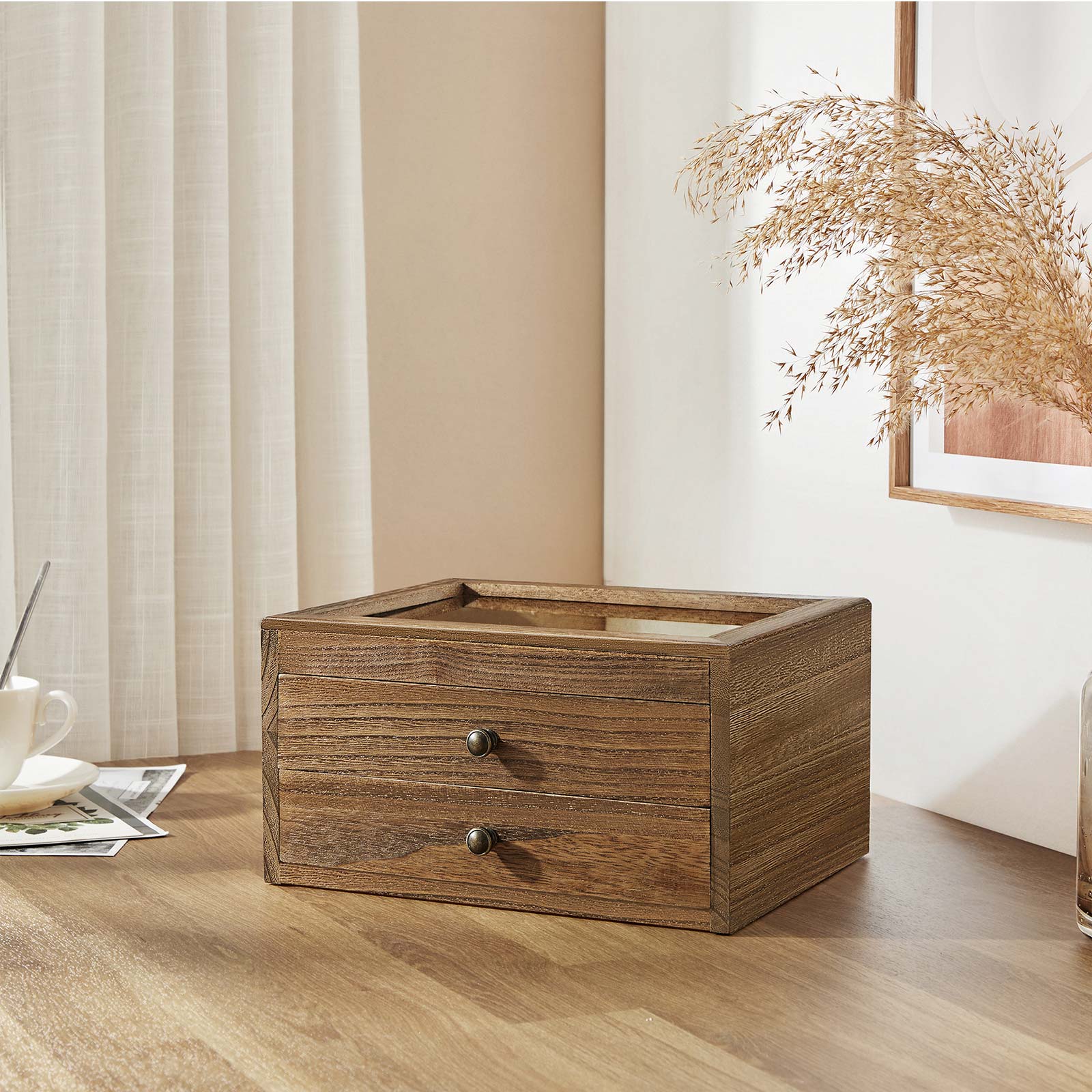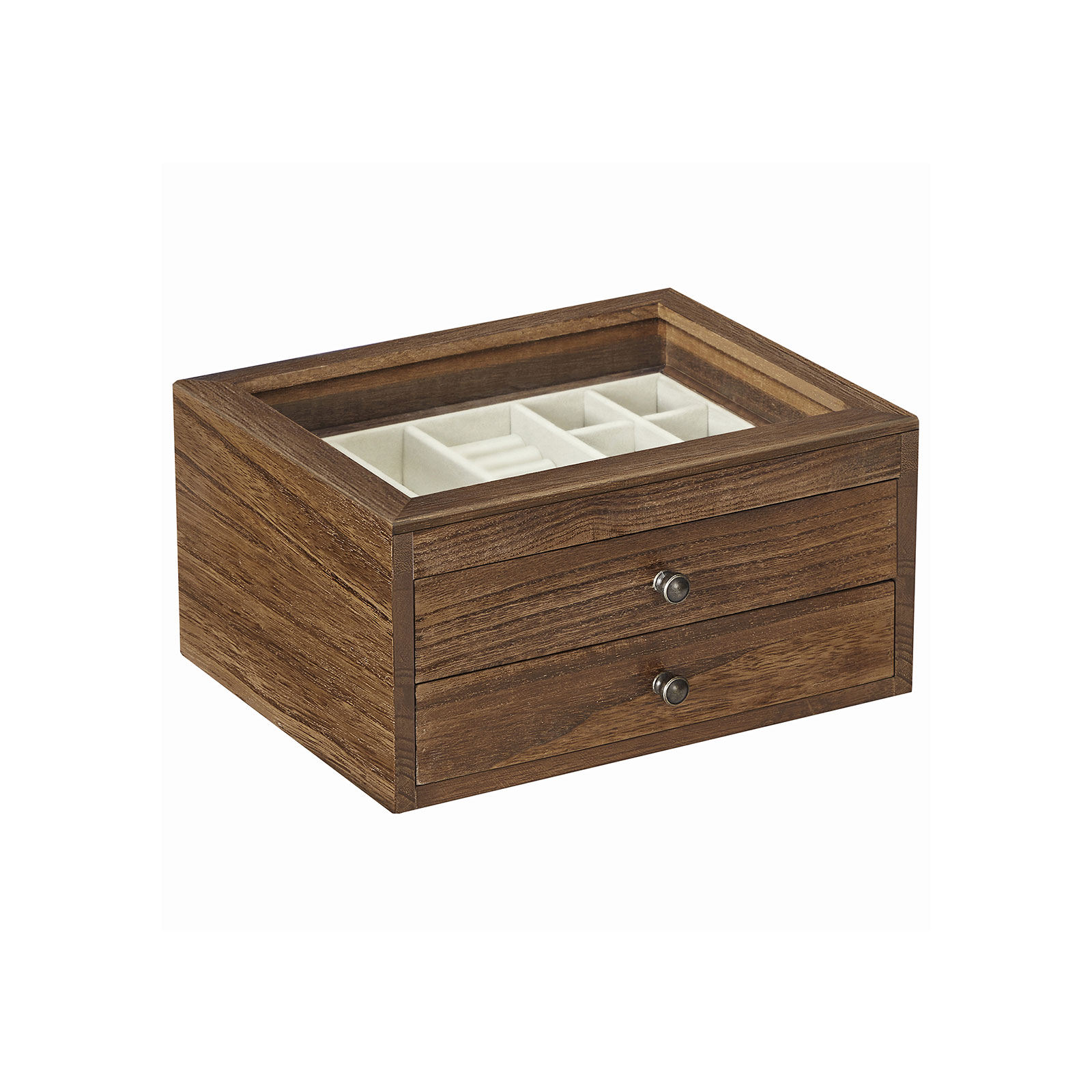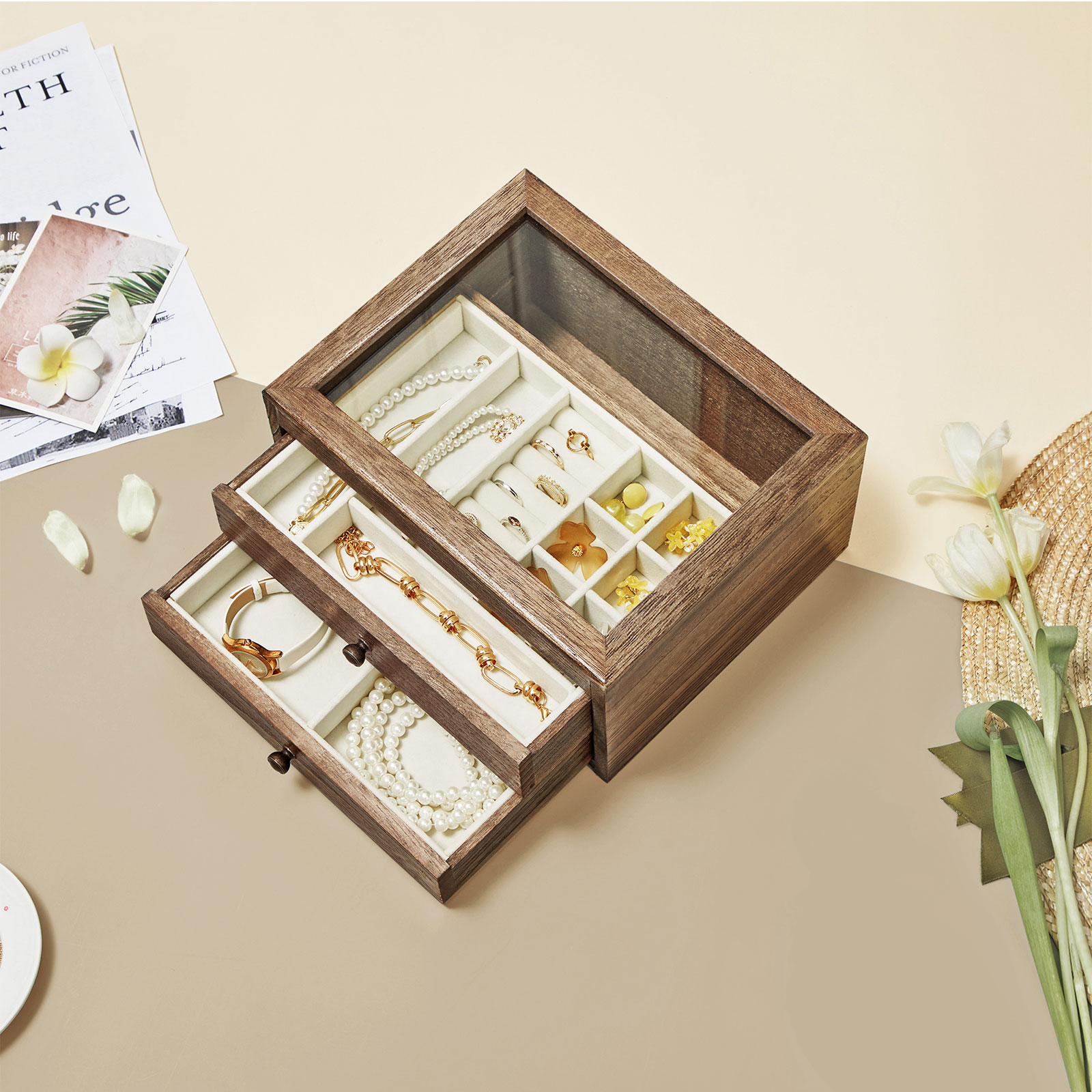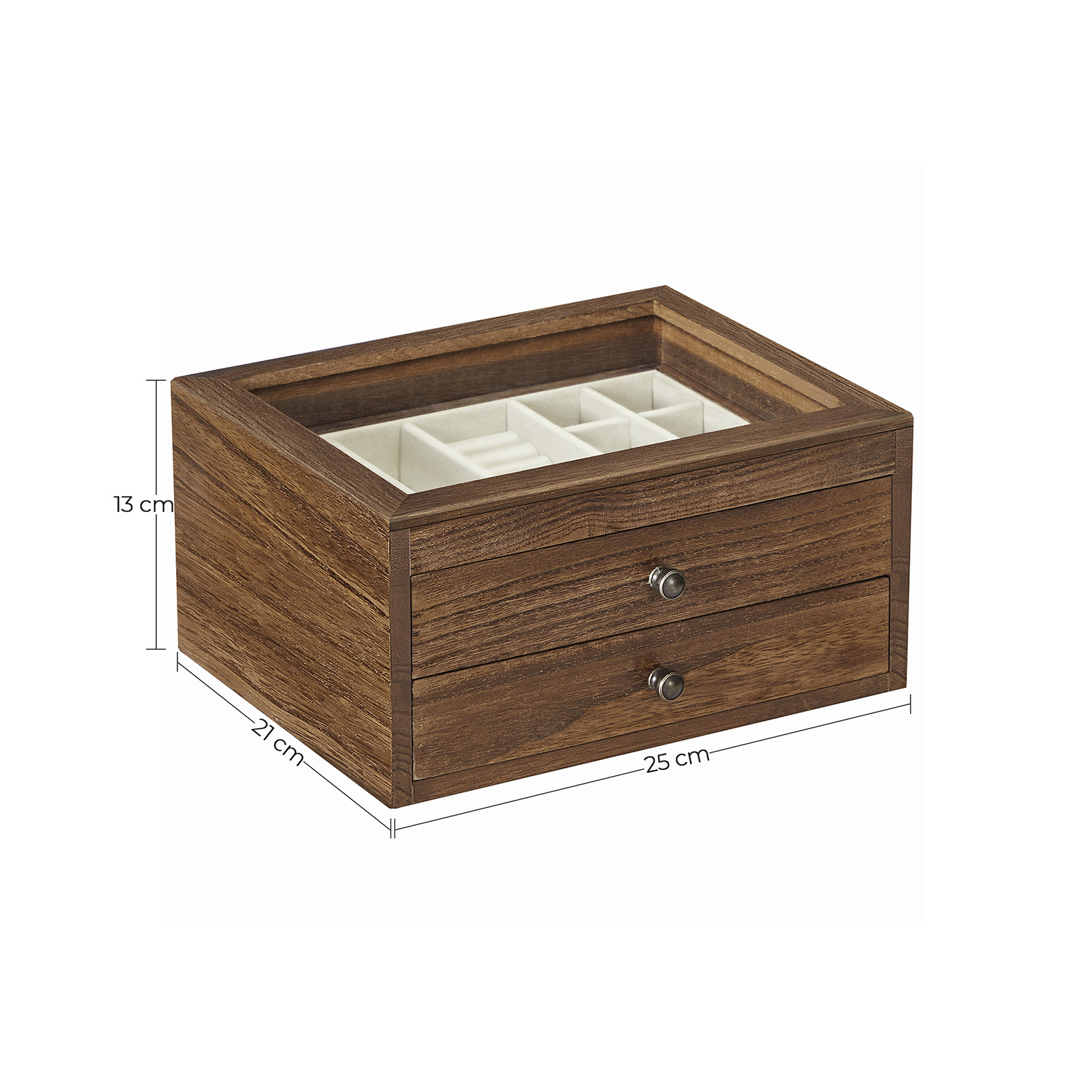 Hurraa! Kaikki on täällä! Rannekorut, kaulakorut, korvakorut ja sormukset löytävät uuden kodin tästä käytännöllisestä korurasia. Sinun ei enää tarvitse tuhlata aikaa korujen etsimiseen makuuhuoneesta – ne ovat suoraan silmiesi edessä! Hyvästi kaaos! Sano hyvästit kaoottisille ketjuille meikkipöydälläsi. Avaa tämä korurasia, vedä laatikot ulos ja laita erilaiset aarteesi siististi paikoilleen. Sopivien korujen valitseminen voi olla todella helppoa. Anna asullesi joka päivä viimeinen silaus. Tuotetiedot:- Väri: ruskea – Materiaali: paulownia-puu, sametti, lasi – Koko: 25 x 21 x 13 cm (P x L x K) – Paino: 1,3 kg Toimitus sisältää: – 1 x korurasia SONGMICS-ohjeet: – Älä aseta liian painavia esineitä tuotteen päälle. – Älä altista tuotetta suoralle auringonvalolle pitkäksi aikaa.