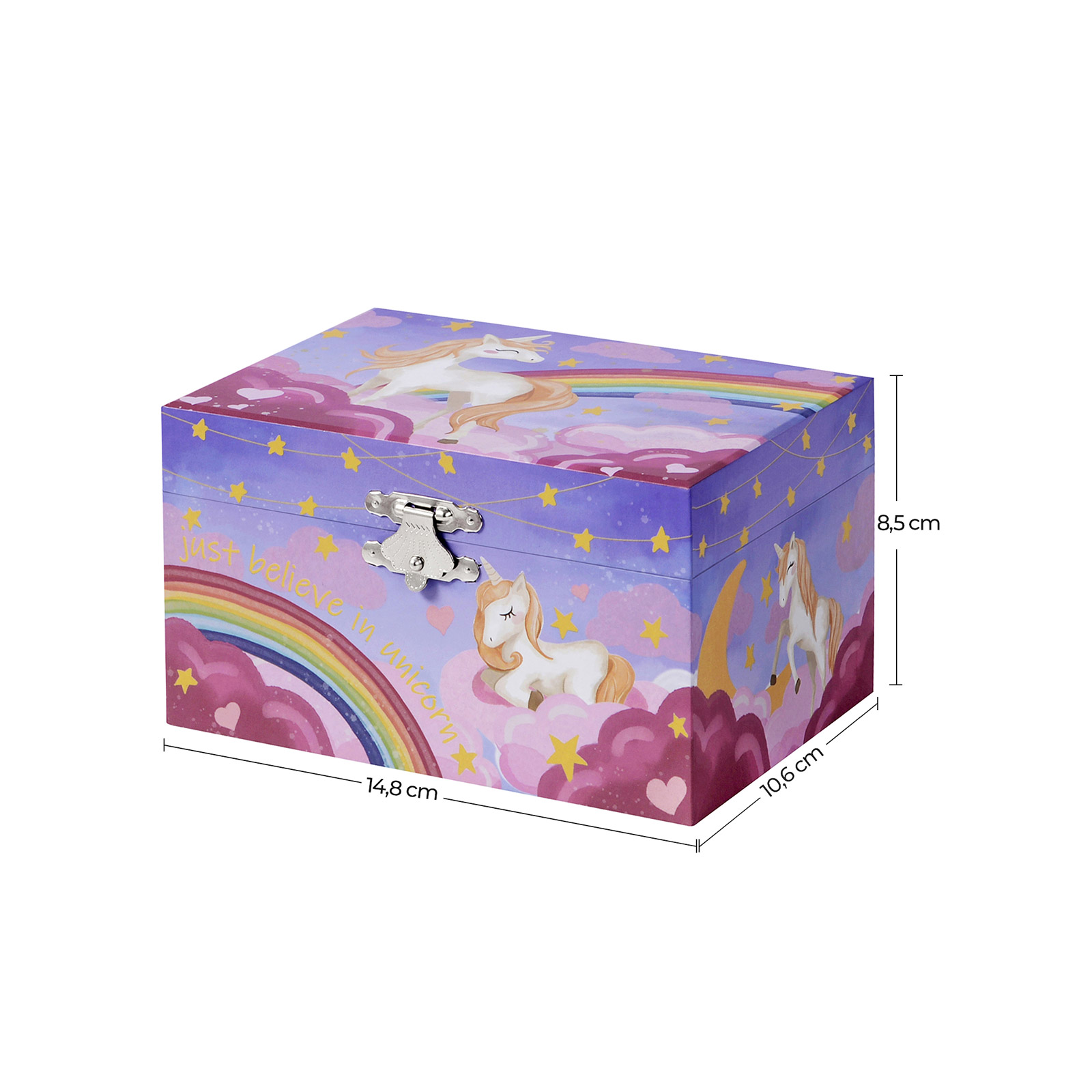 Mielikuvituksella ei ole rajoja: soittorasiamme on tarkoitettu ilahduttamaan sekä lapsia että vanhempia. Ballerina vie lapsesi lumoavaan satumaailmaan, jossa mielikuvituksella ei ole rajoja. Soittorasia sopii myös lasten aarteiden ja korujen säilytykseen ja siitä tulee yksi heidän lapsuutensa kauneimmista lahjoista. Tuotetiedot: Väri: Violetti Materiaali: MDF (keskitiheä kuitulevy), koristepaperi, sametti, ABS-peili Koko: 14,8 x 10,6 x 8,5 cm (P x L x K) Paino: 0,3 kg Melodia: Yksisarvinen Toimitus sisältää: 1 x soittorasia SONGMICS Huomautukset: Vedä soittorasiaa vain, kunnes se pysähtyy.Pidä tämä tuote poissa terävien tai terävien esineiden läheisyydestä. Älä altista tätä tuotetta voimakkaalle auringonvalolle tai kosteudelle pitkäksi aikaa.