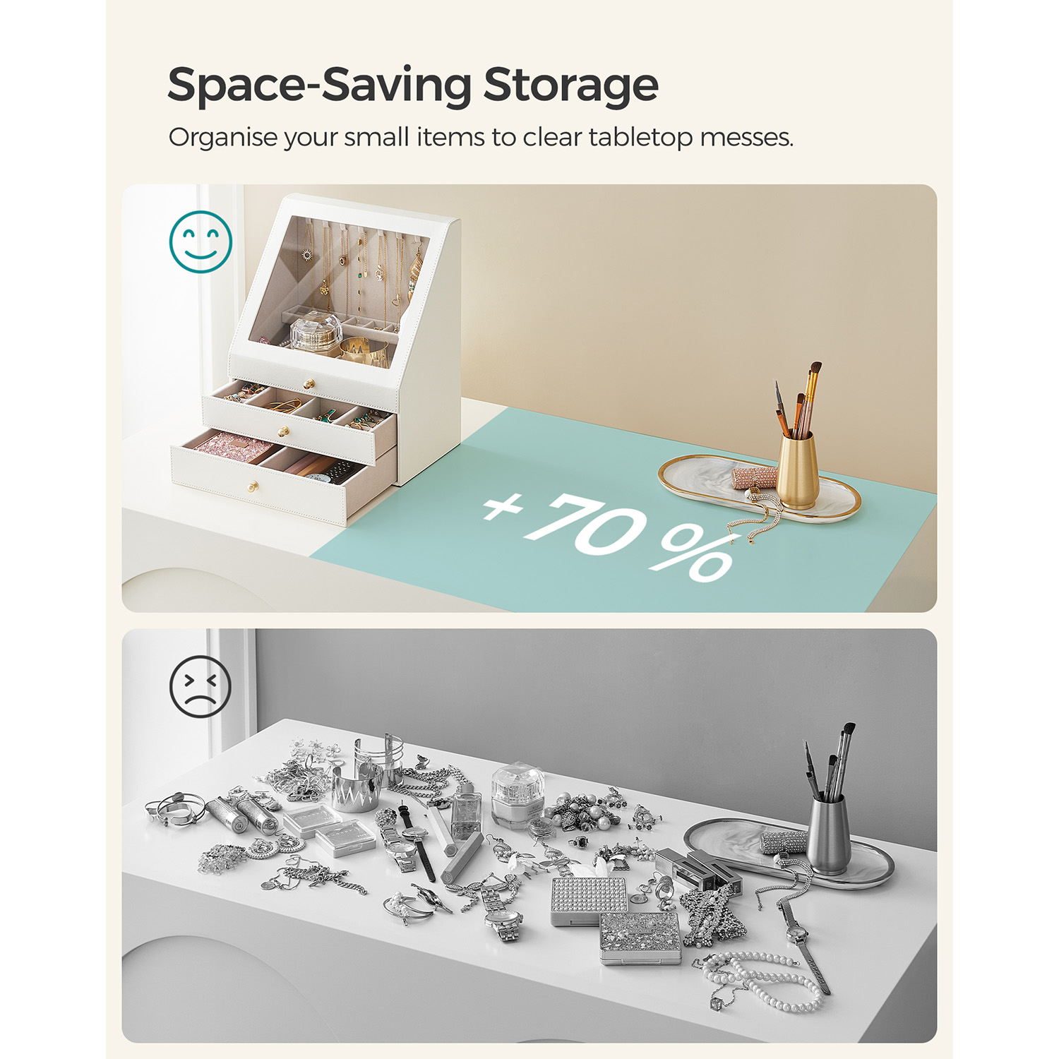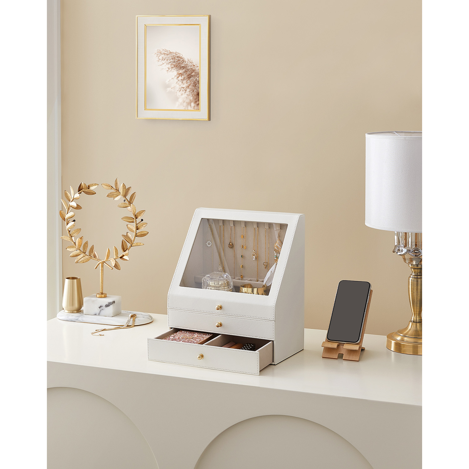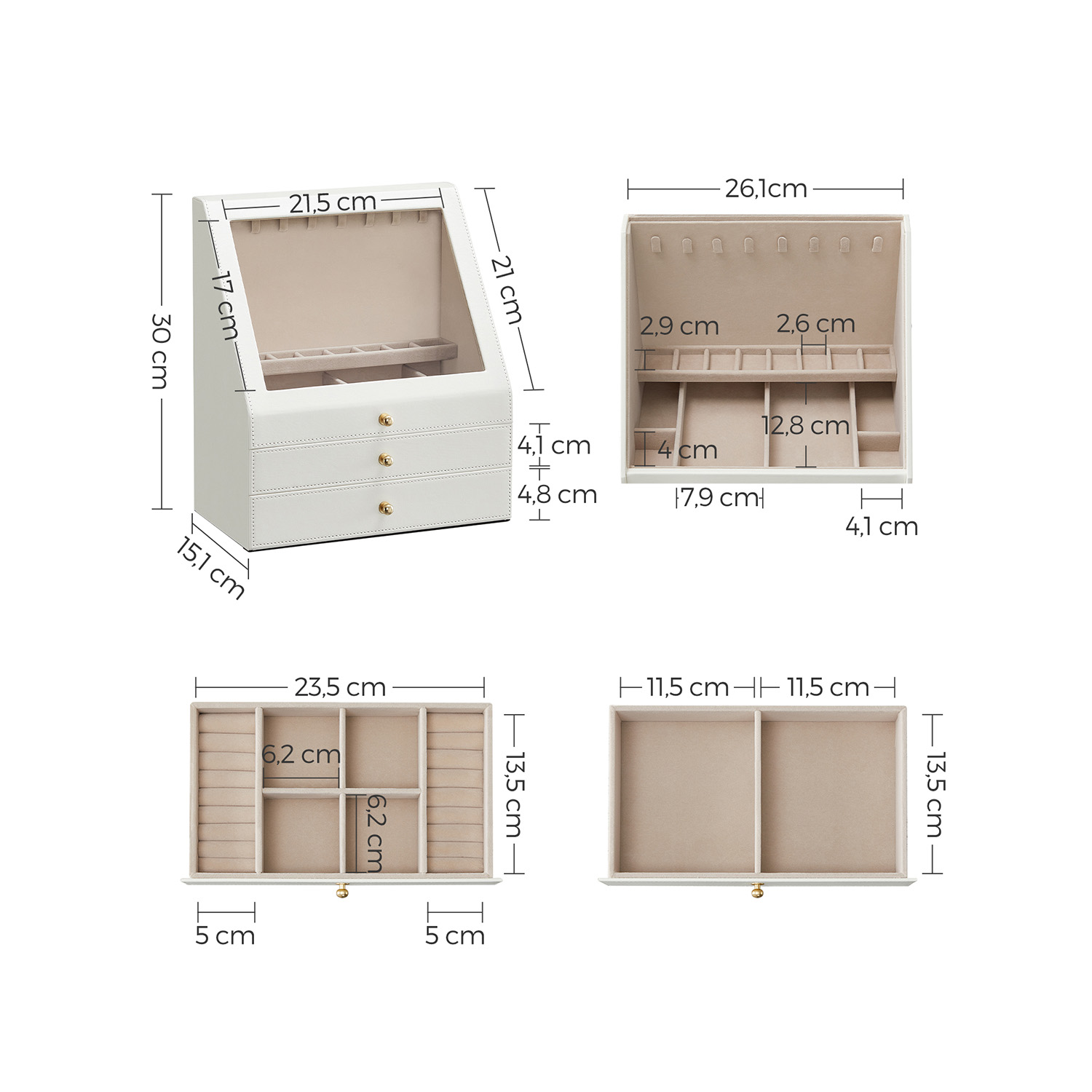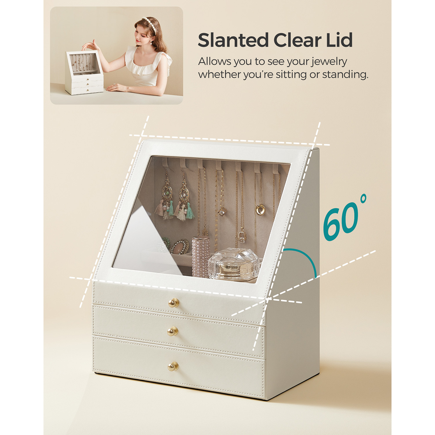 SONGMICS korurasia, 3-tasoinen korurasia, viisto lasi-ikkuna, 2 laatikkoa, korujen säilytys, moderni, näyteikkunaesittely, pilvinen valkoinen