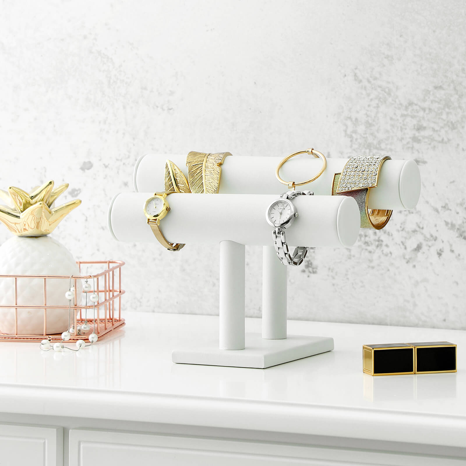 Kaunis, tyylikäs ja ajaton koruteline! Tämä hieno koruteline vakuuttaa paitsi tyylikkäällä muotoilullaan myös korkealla toiminnallisuudellaan. Hieno rannekoruteline tuo järjestystä rannekorujen sekasotkuun ja antaa rannekoruille arvokkaan ja tyylikkään ilmeen. Pakollinen hankinta kaikille korujen ystäville! Materiaali: PVC-putki + PU + keskitiheä puukuitulevy (MDF) Rullien halkaisija: 4 cm Nettopaino: 326 g Väri: Valkoinen Säilytys ja hoito: Sijoita koruteline tuuletettuun tilaan ja vältä jättämästä telinettä pitkäksi aikaa auringonvaloon tai kosteaan tilaan. Sopiva lämpötila: 10–40 ℃. Pinnan tahrat voidaan pyyhkiä pois hieman kostutetulla liinalla.Käytä säännöllisesti erityistä nahkahuoltotuotetta, jotta nahka säilyttää kiiltonsa pitkään. Suojaa koruteline varastoinnin aikana puristukselta. Älä säilytä korutelinettä kemikaalien kanssa. Toimitus sisältää: 1 x koruteline (ilman koruja)