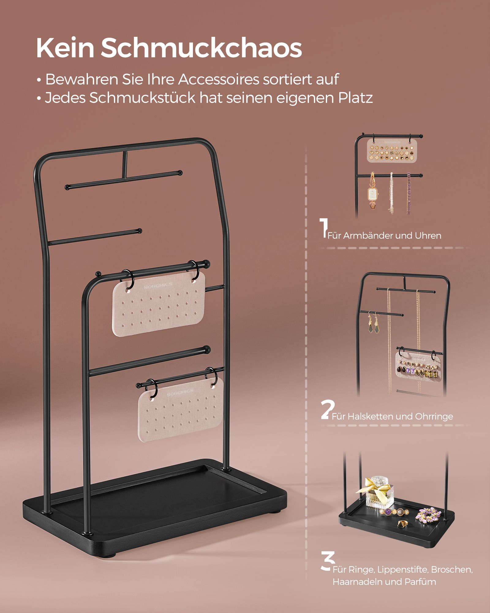 SONGMICS koruteline, koruteline, korujen säilytys, metallikehys, 2 pientä korvakorujen järjestäjää, 6 ripustustankoa, kaulakoruille, korvakoruille, rannekoruille, sormuksille