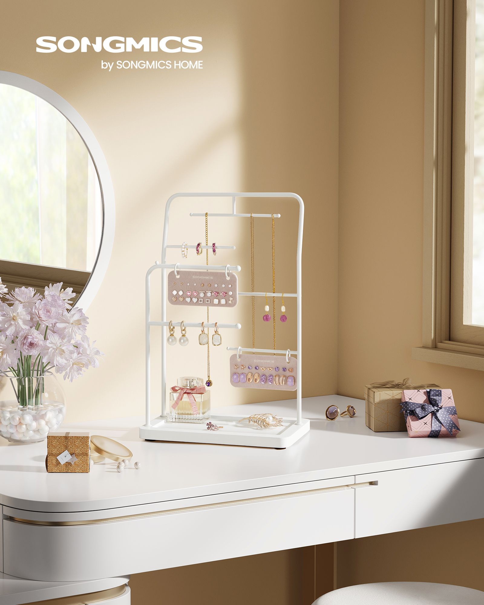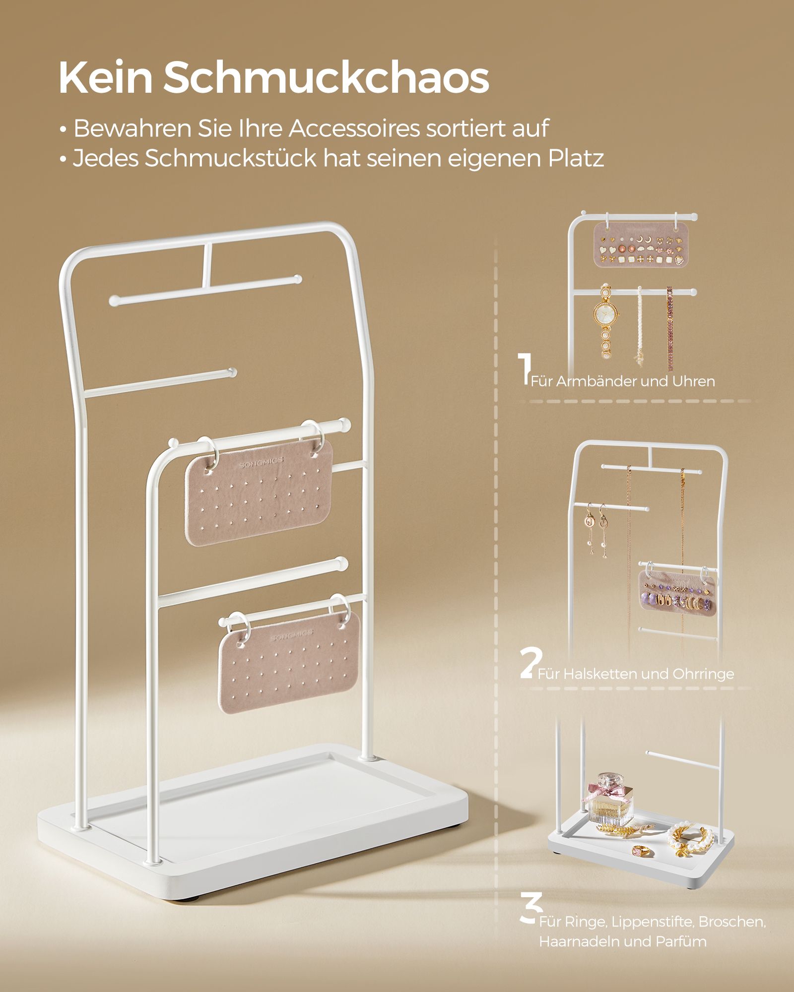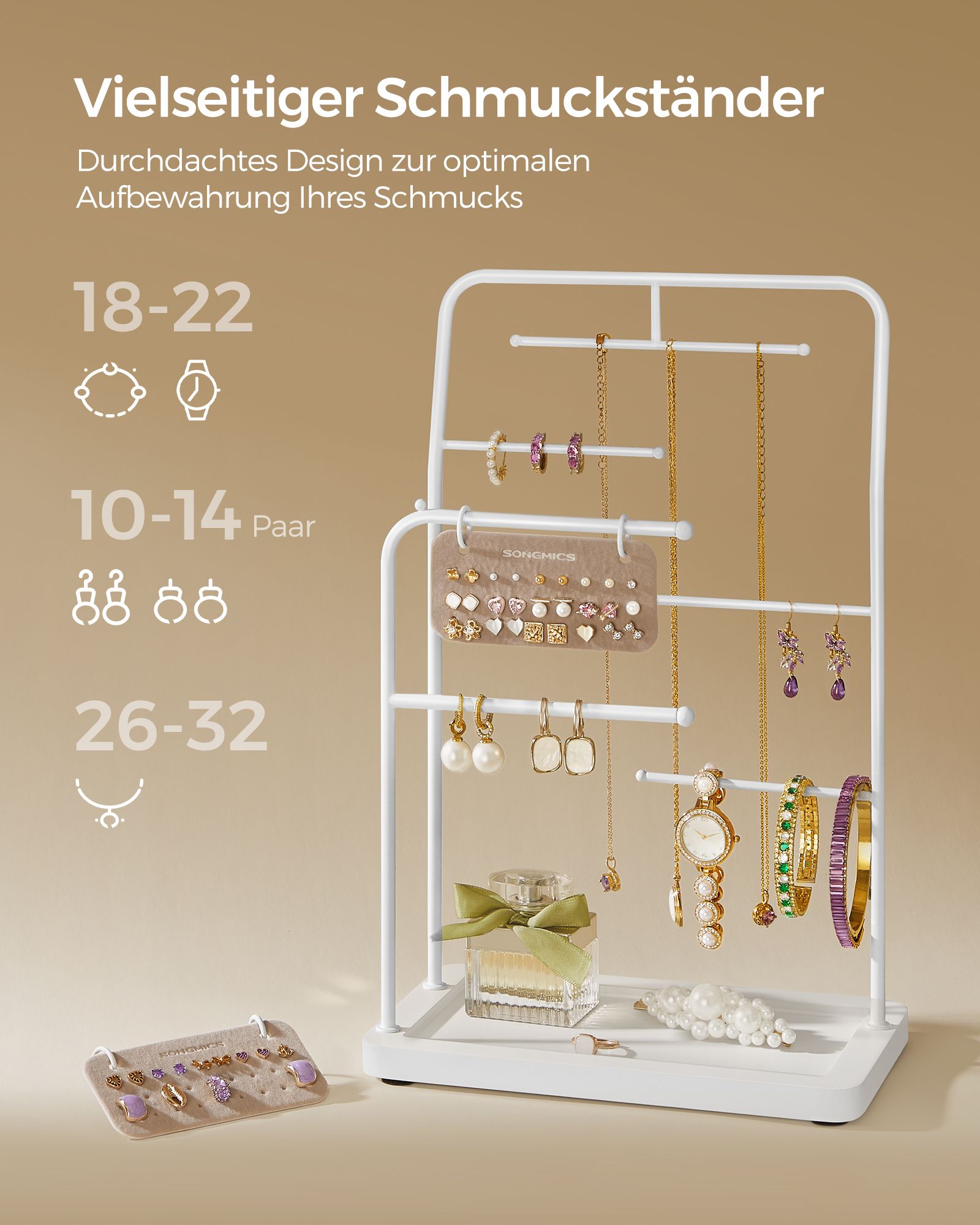 SONGMICS koruteline, koruteline, korujen säilytys, metallikehys, 2 pientä korvakorujen järjestäjää, 6 ripustustankoa, kaulakoruille, korvakoruille, rannekoruille, sormuksille