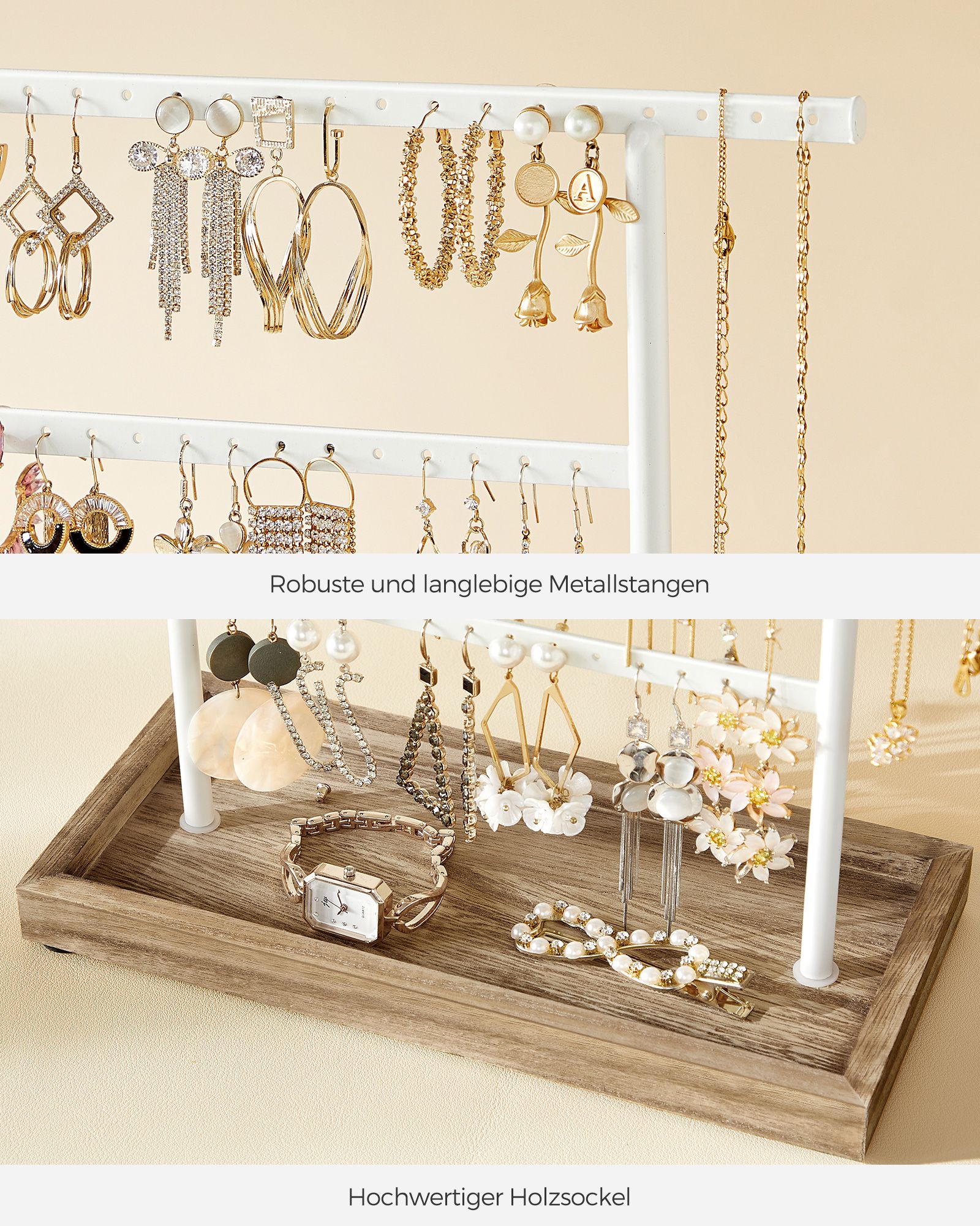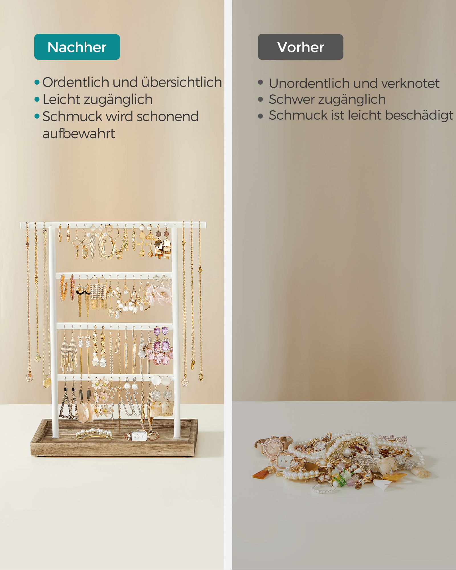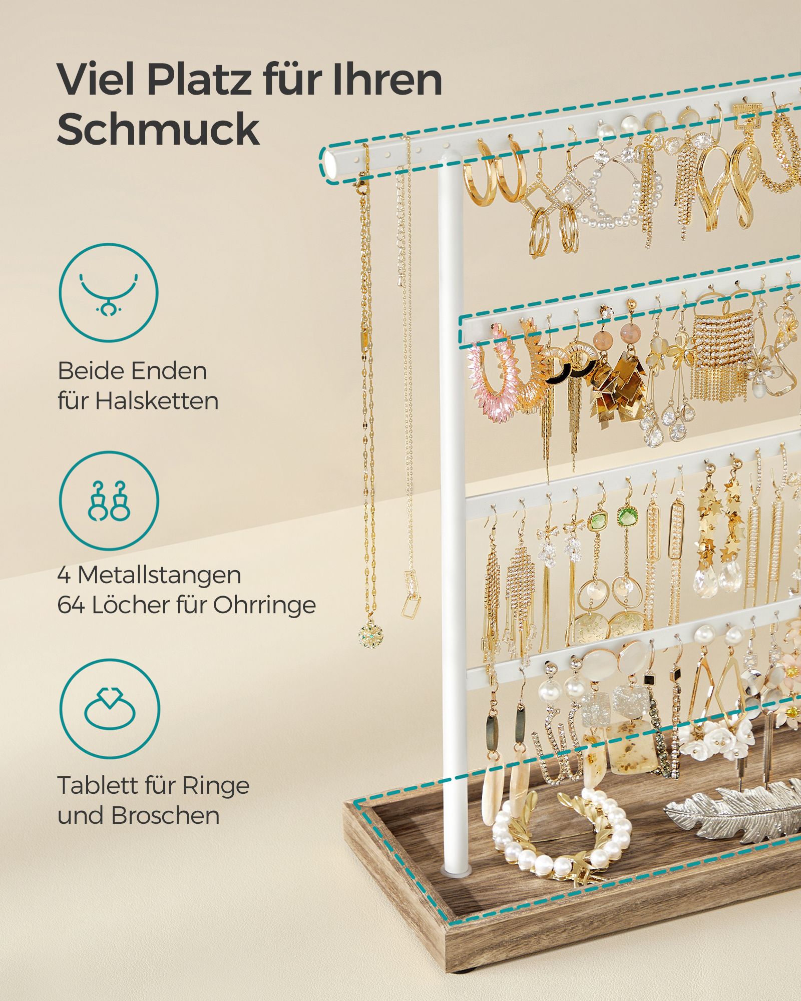 SONGMICS koruteline, koruteline korutelineellä, 4 tankoa, ketjuteline, puinen jalusta, korujen säilytyskorvakorut, nappikorvakorut, vintage-tyyli