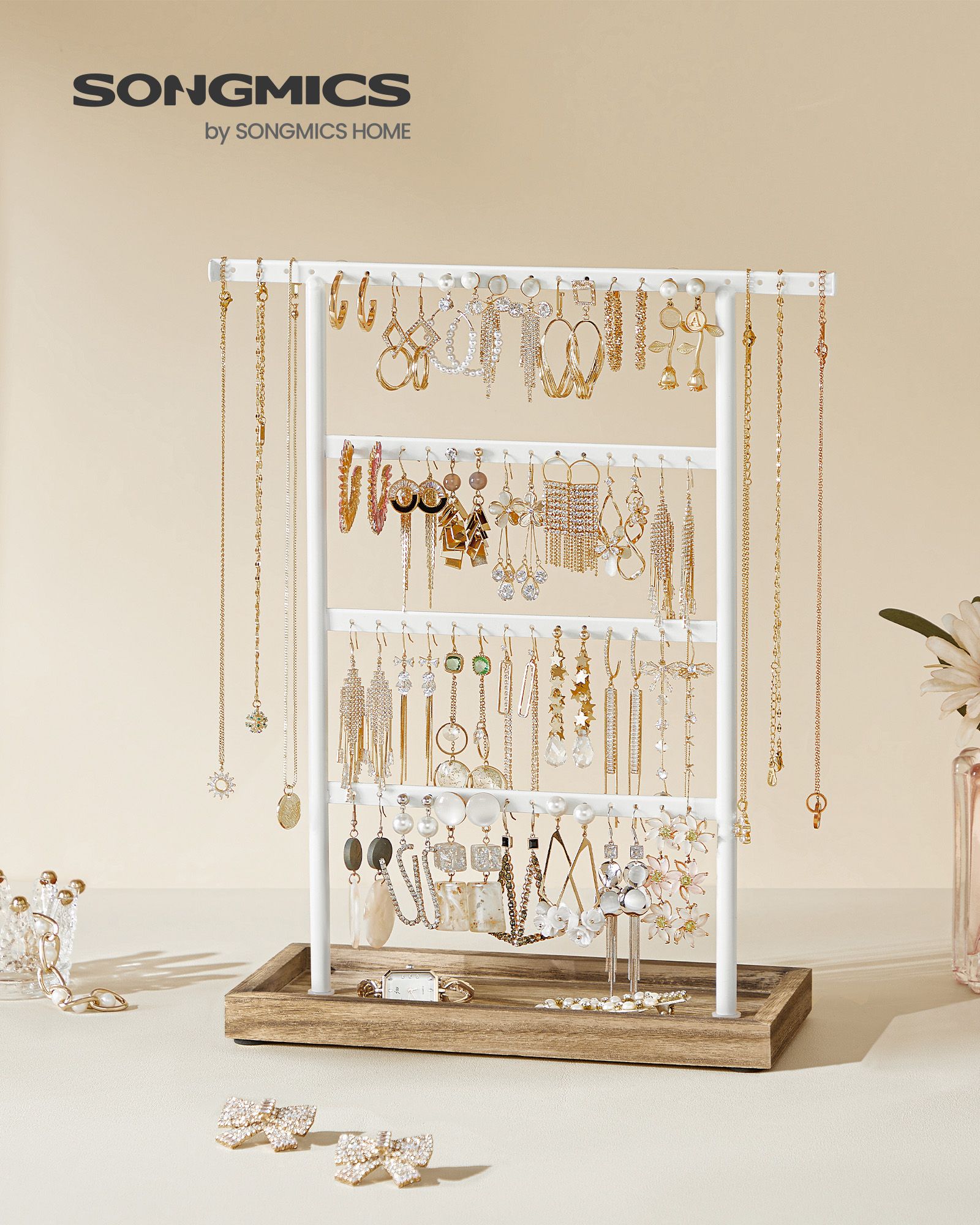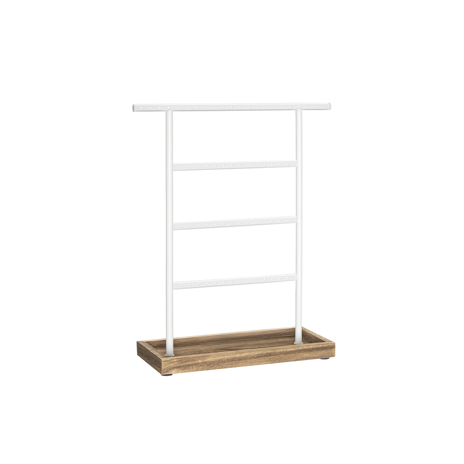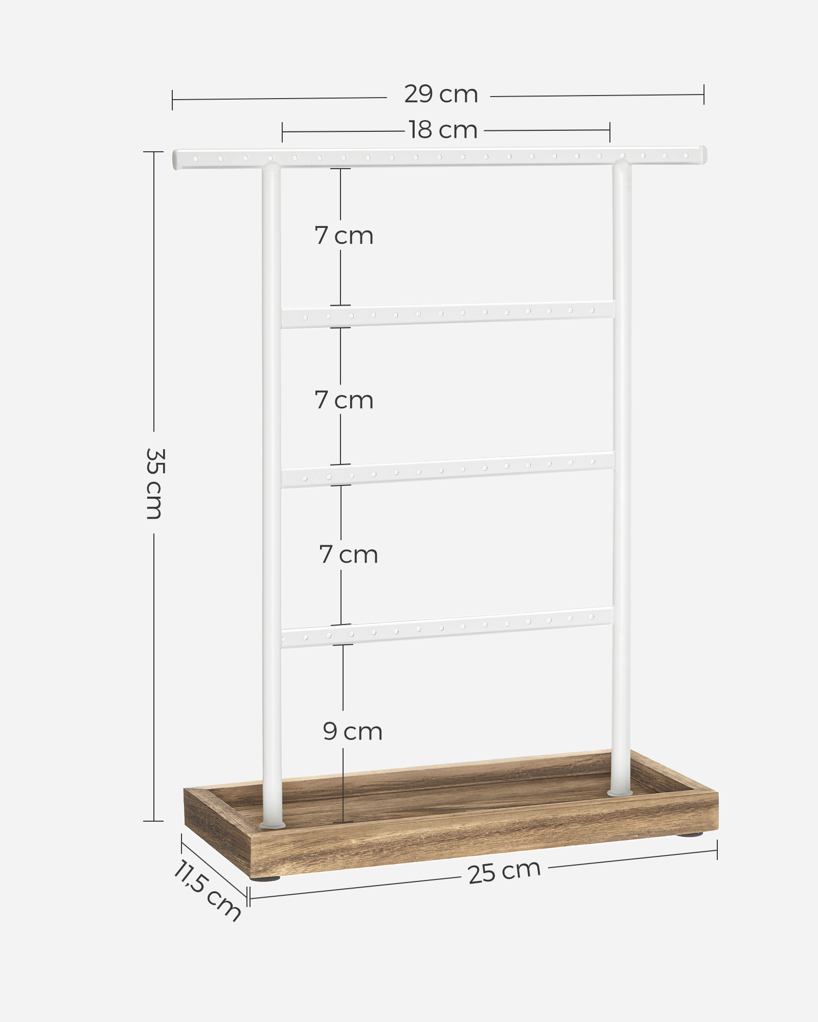 SONGMICS koruteline, koruteline korutelineellä, 4 tankoa, ketjuteline, puinen jalusta, korujen säilytyskorvakorut, nappikorvakorut, vintage-tyyli