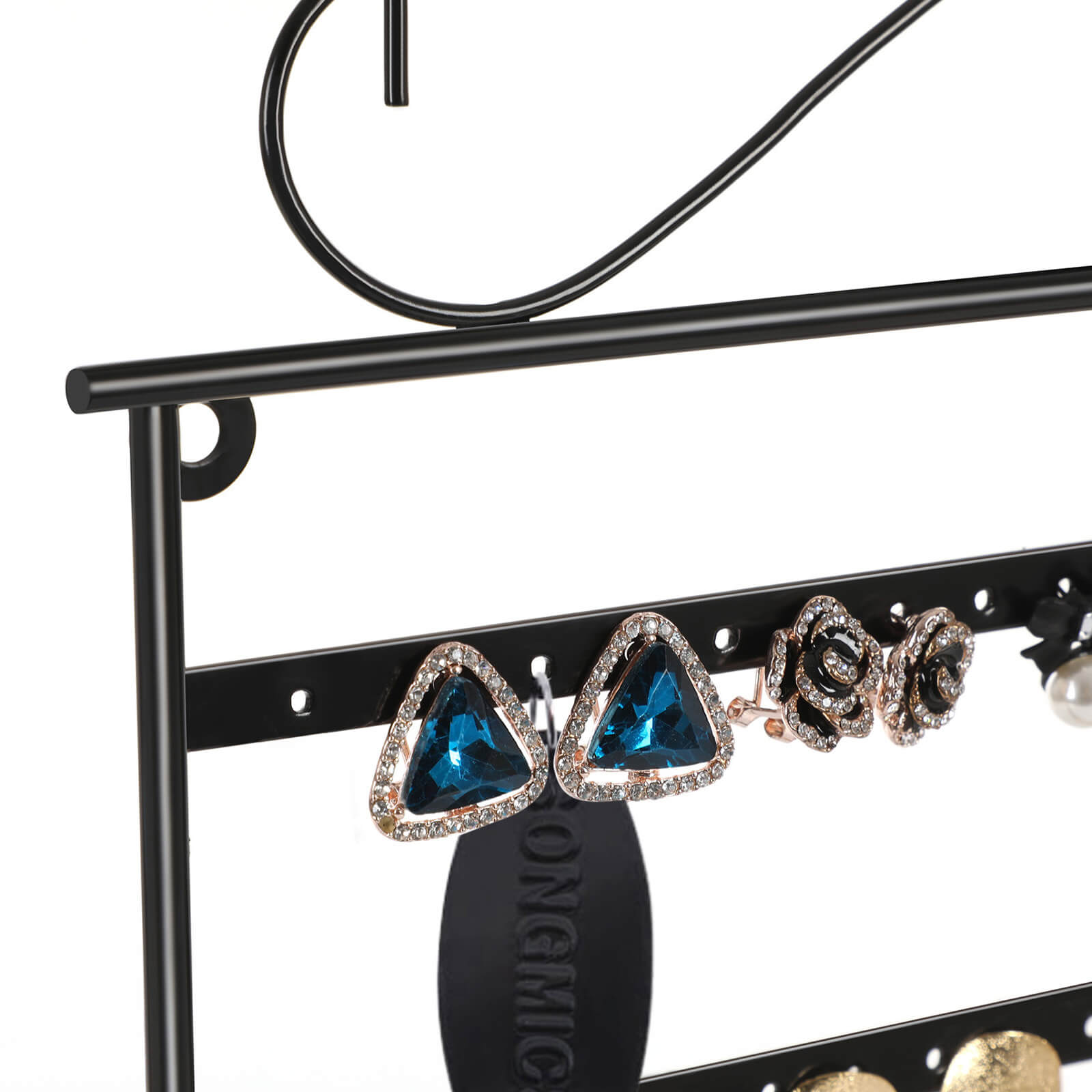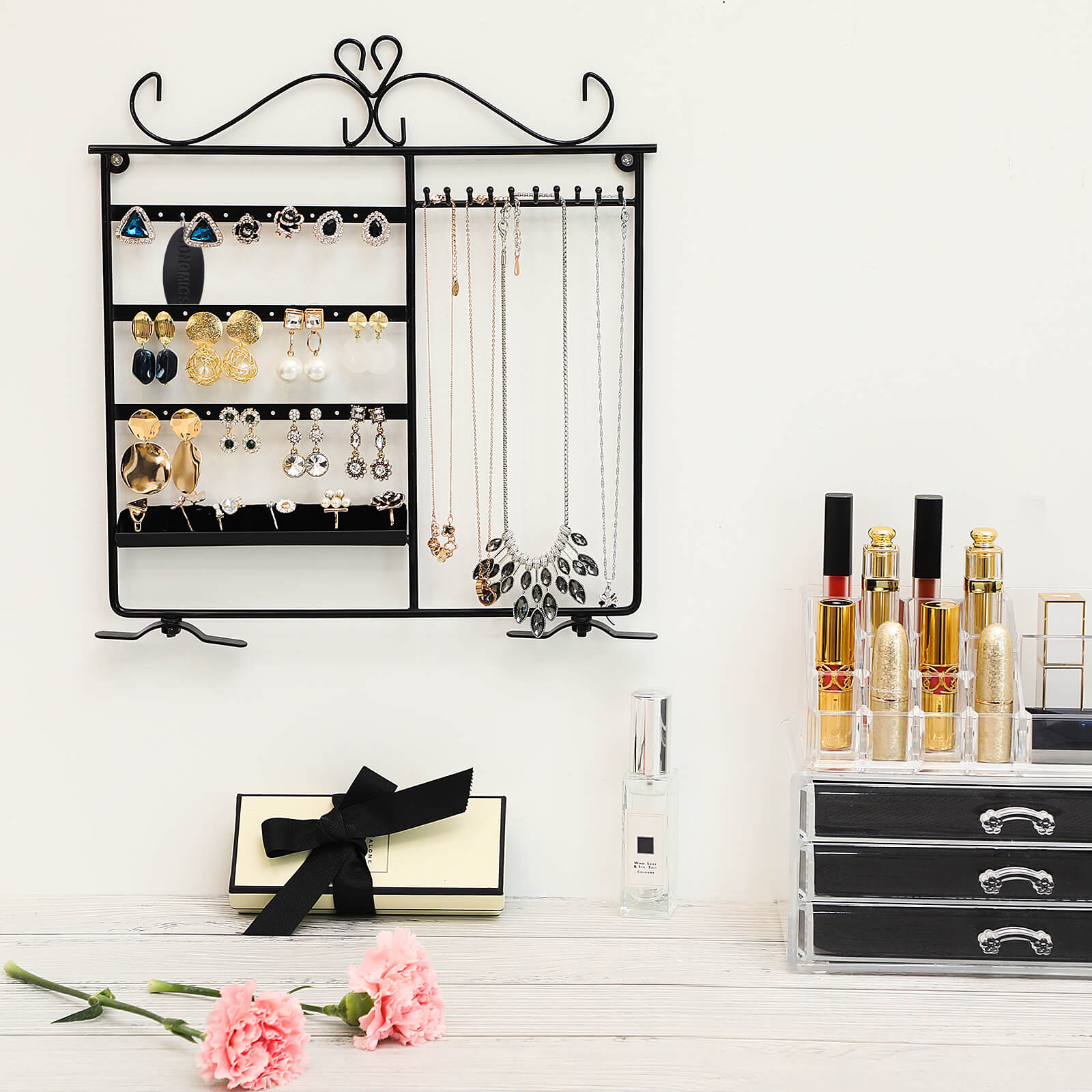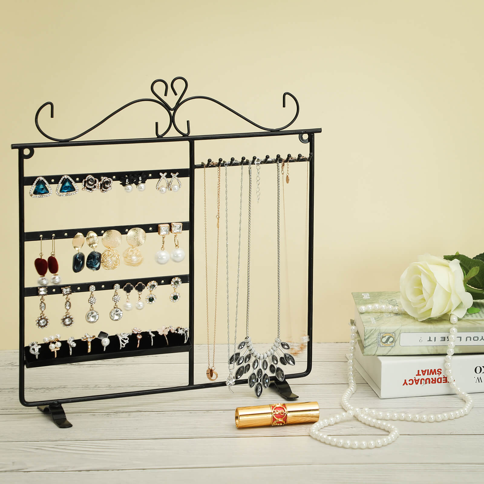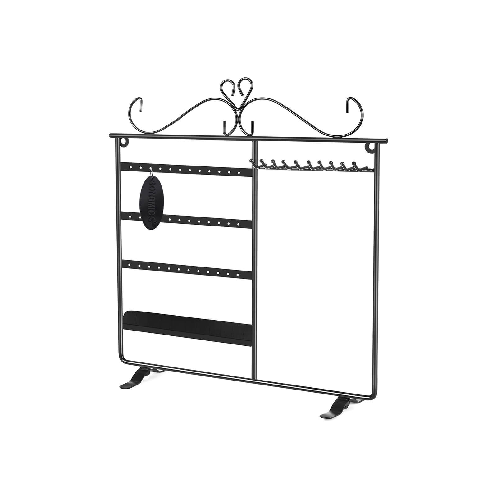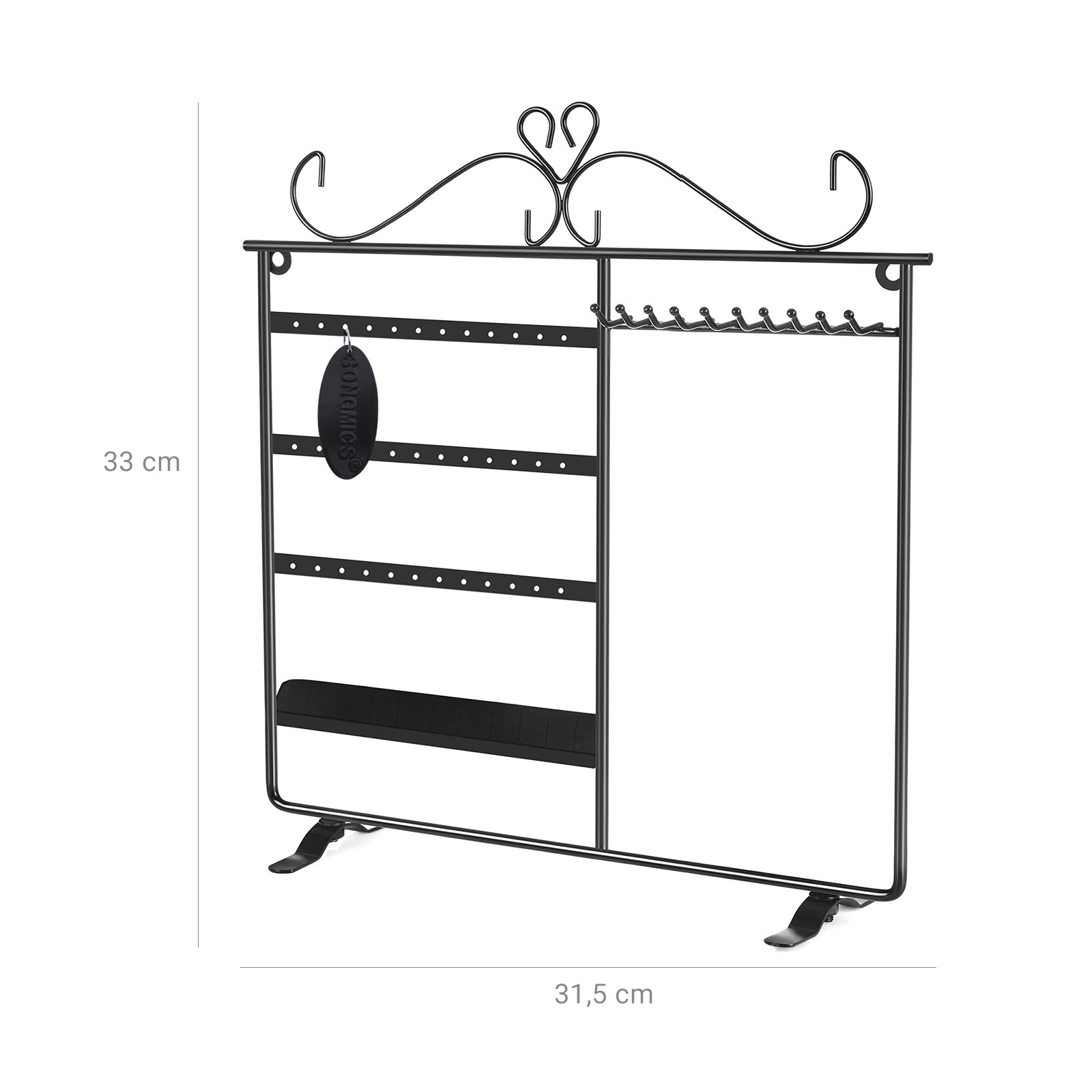 Korvakorut ja kaulakorut lojuvat ympäriinsä? Eikö oikeita koruja löydy koskaan, kun niitä tarvitaan? Songmics-koruteline on ihanteellinen ratkaisu tällaisiin ongelmiin. Se on valmistettu tukevasta raudasta, ja sen pinta on jauhemaalattu, joten se on sileä ja suojaa alla olevaa metallia kestävästi. Siihen voi ripustaa jopa 18 paria korvakoruja ja 10 kaulakorua. Sormuksillesi on myös oma paikkansa. Lisäksi voit asettaa telineen pöydälle tai ripustaa seinälle. Songmics-korutelineen avulla korusi ovat kauniisti järjestyksessä, ja se toimii myös sisustuksena. Tuotetiedot: – Materiaali: rauta – Väri: musta – Mitat: 31,5 x 33 cm (L x K) – Jalan mitat: 11 x 1,8 cm – Kahden reikärivin välinen etäisyys: 5,5 cm – Kahden reiän/koukun välinen vaakasuora etäisyys: 1 cm – Koukun ja alareunan välinen etäisyys: 24,5 cm – Koukun pituus: 3 cm Toimitus sisältää: – 1x korukotelo