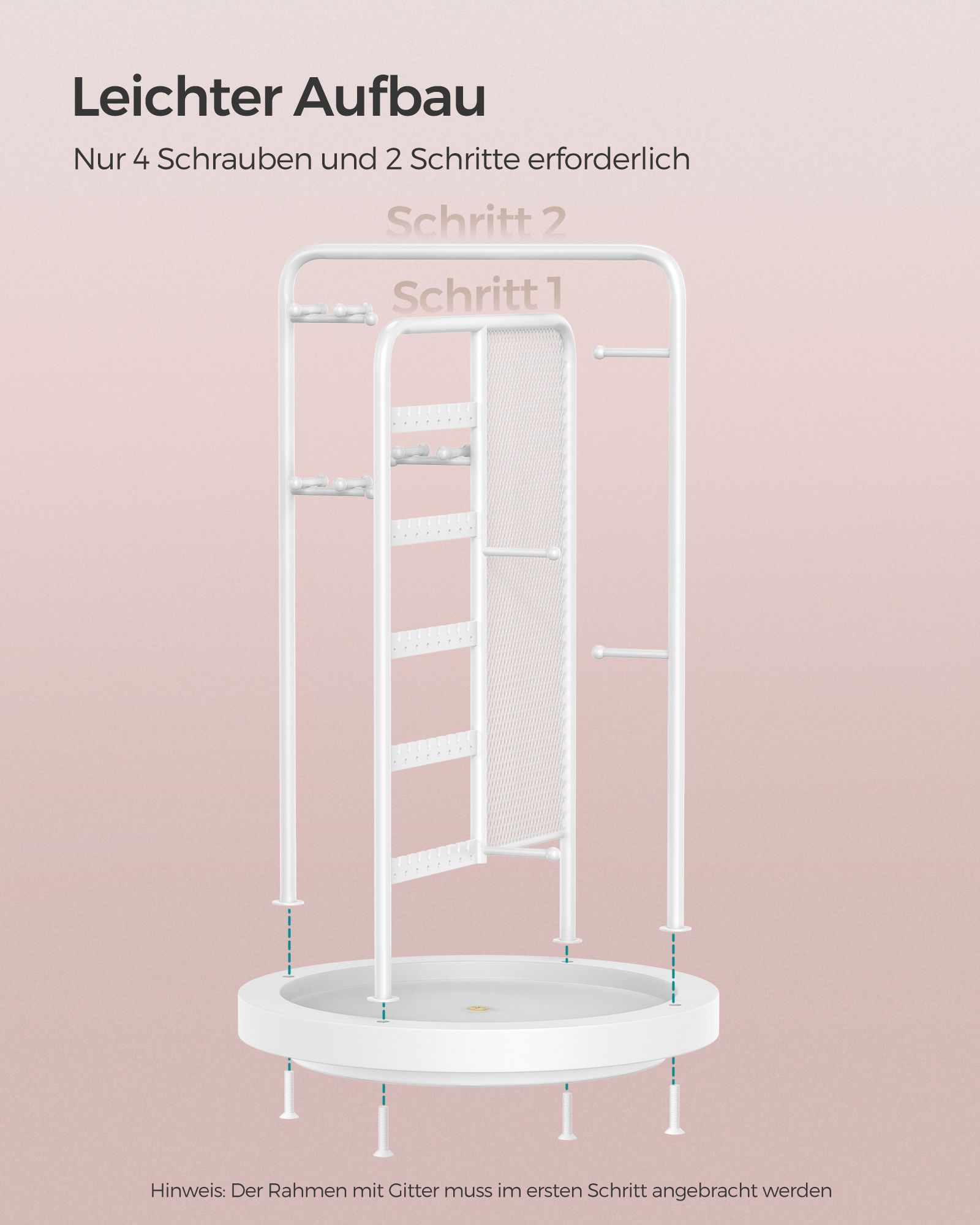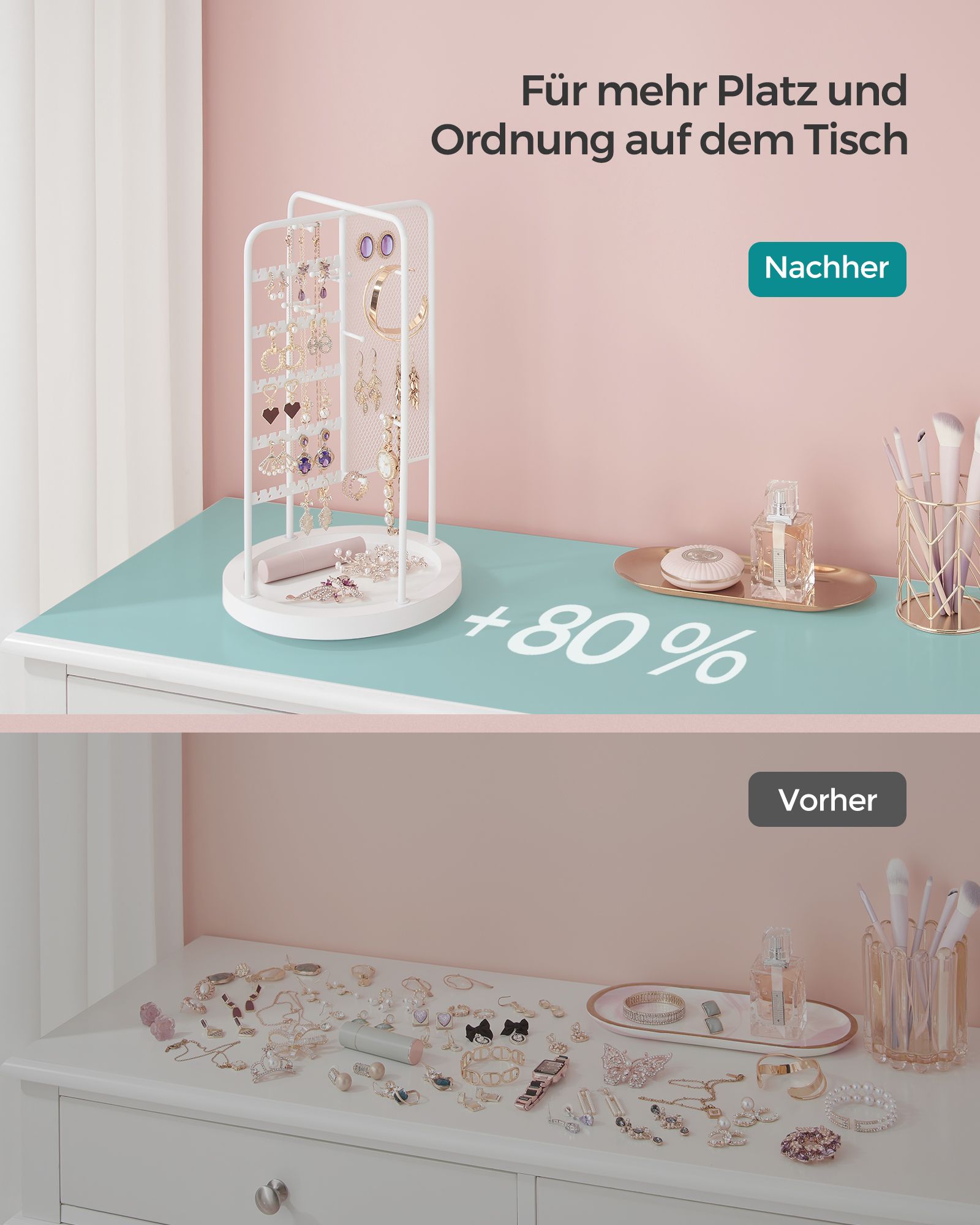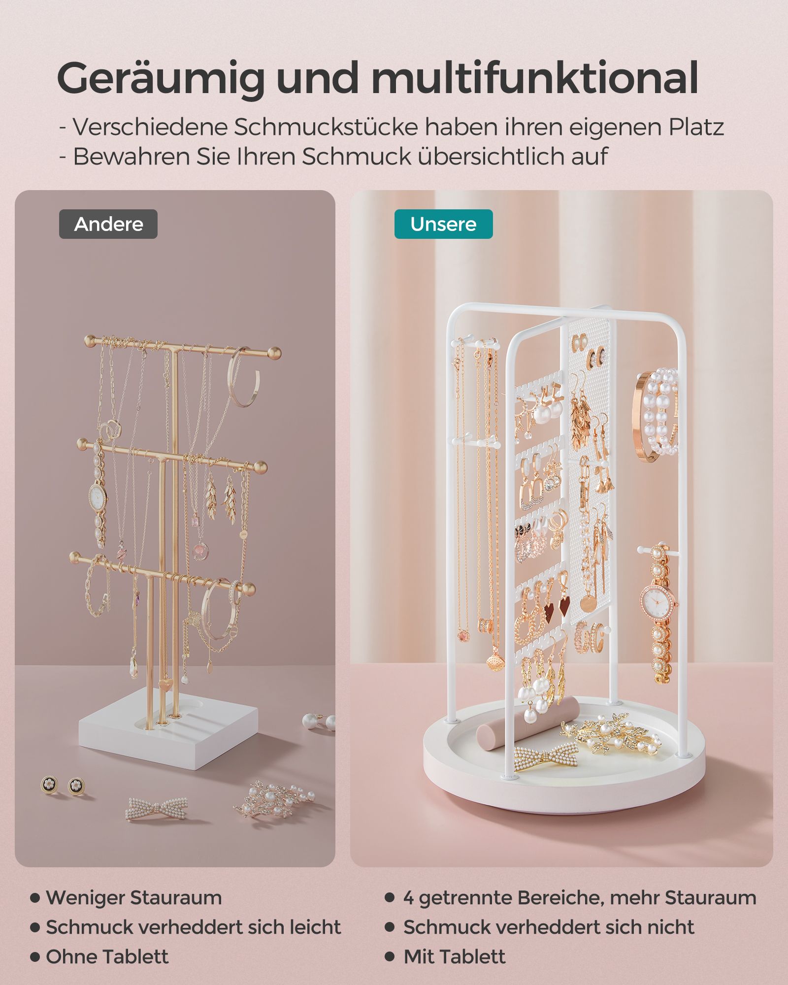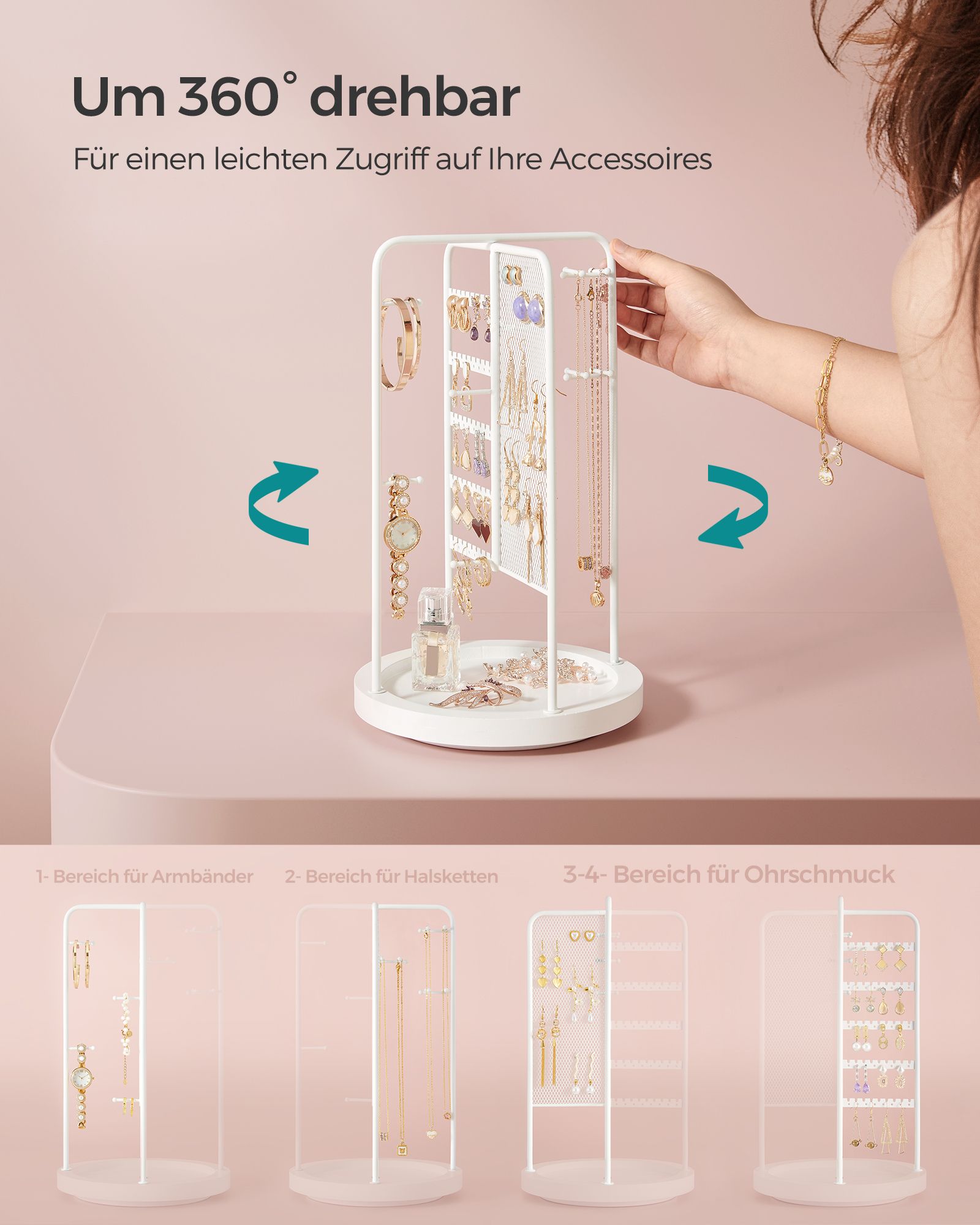 SONGMICS koruteline, käännettävä koruteline, 4 erillistä osastoa, metallirunko, korujen säilytys kaulakoruille, rannekoruille, korvakoruille, nappikorvakoruille, sormuksille, lahjaidea