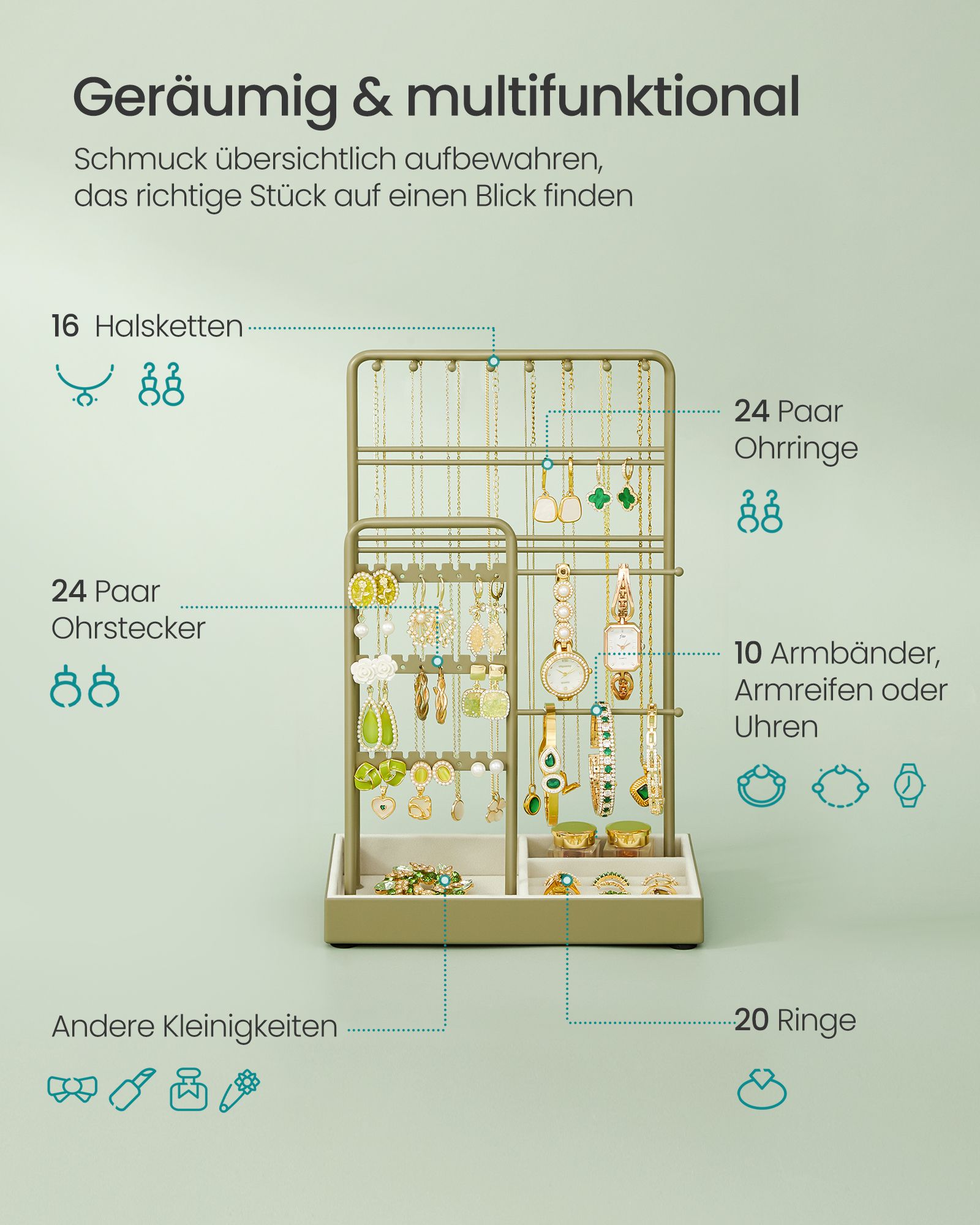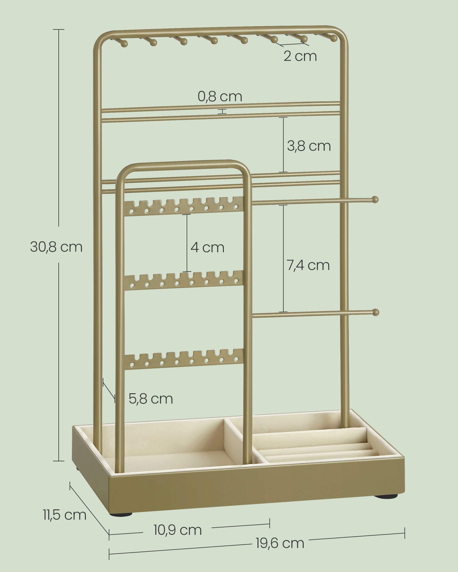 SONGMICS koruteline, koruteline, metallikehys, koruteline sametti, korujen säilytys kaulakoruille, rannekoruille, korvakoruille, nappikorvakoruille, sormuksille