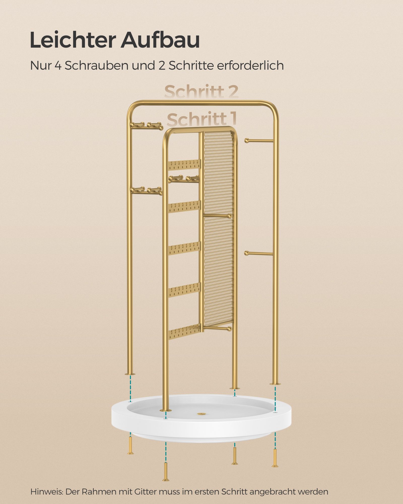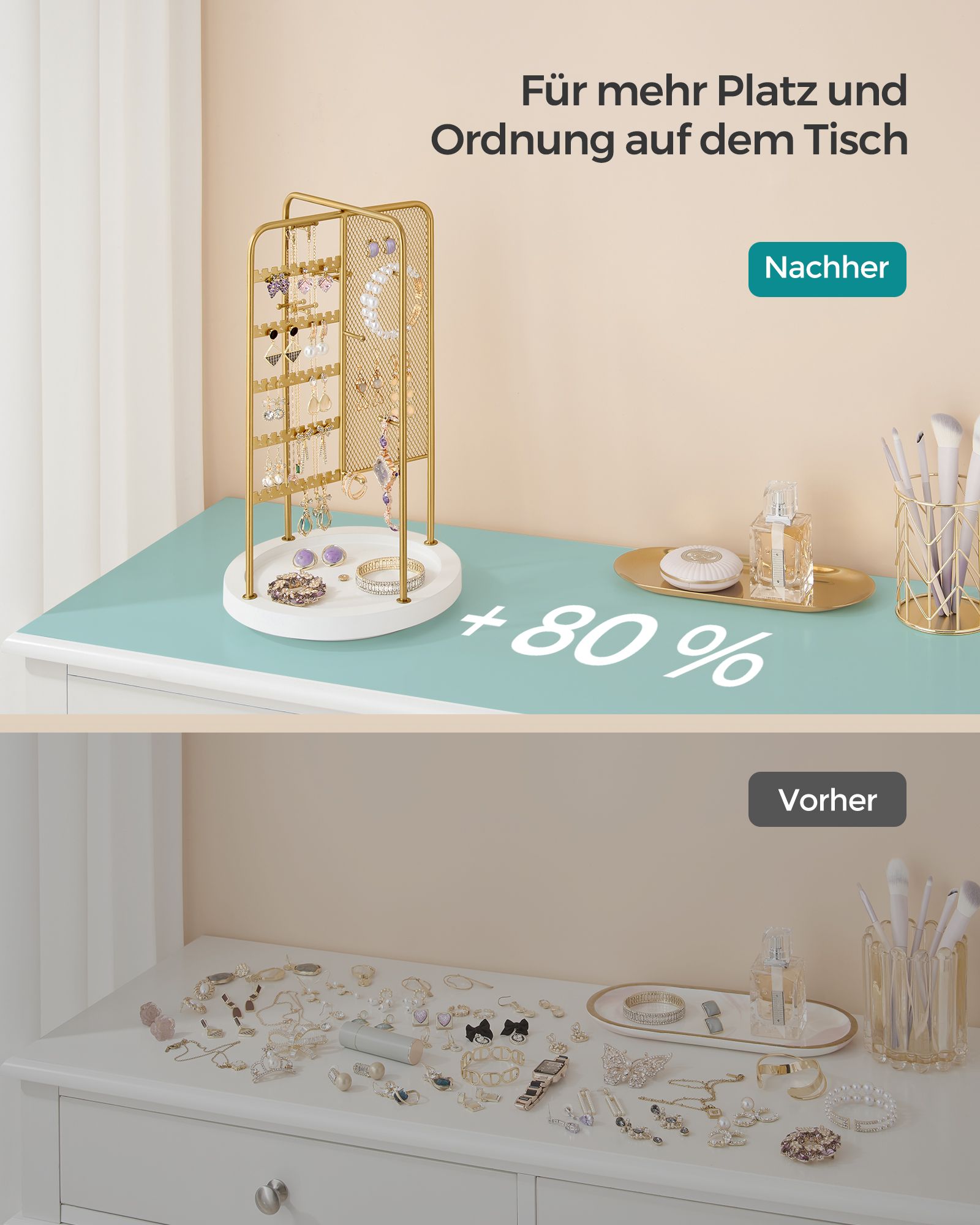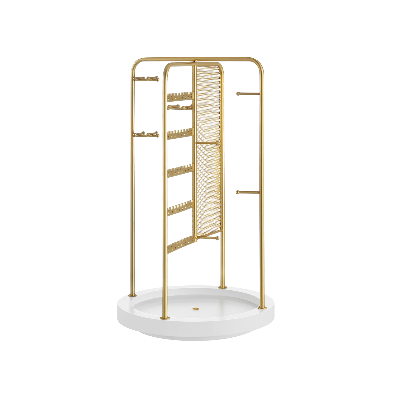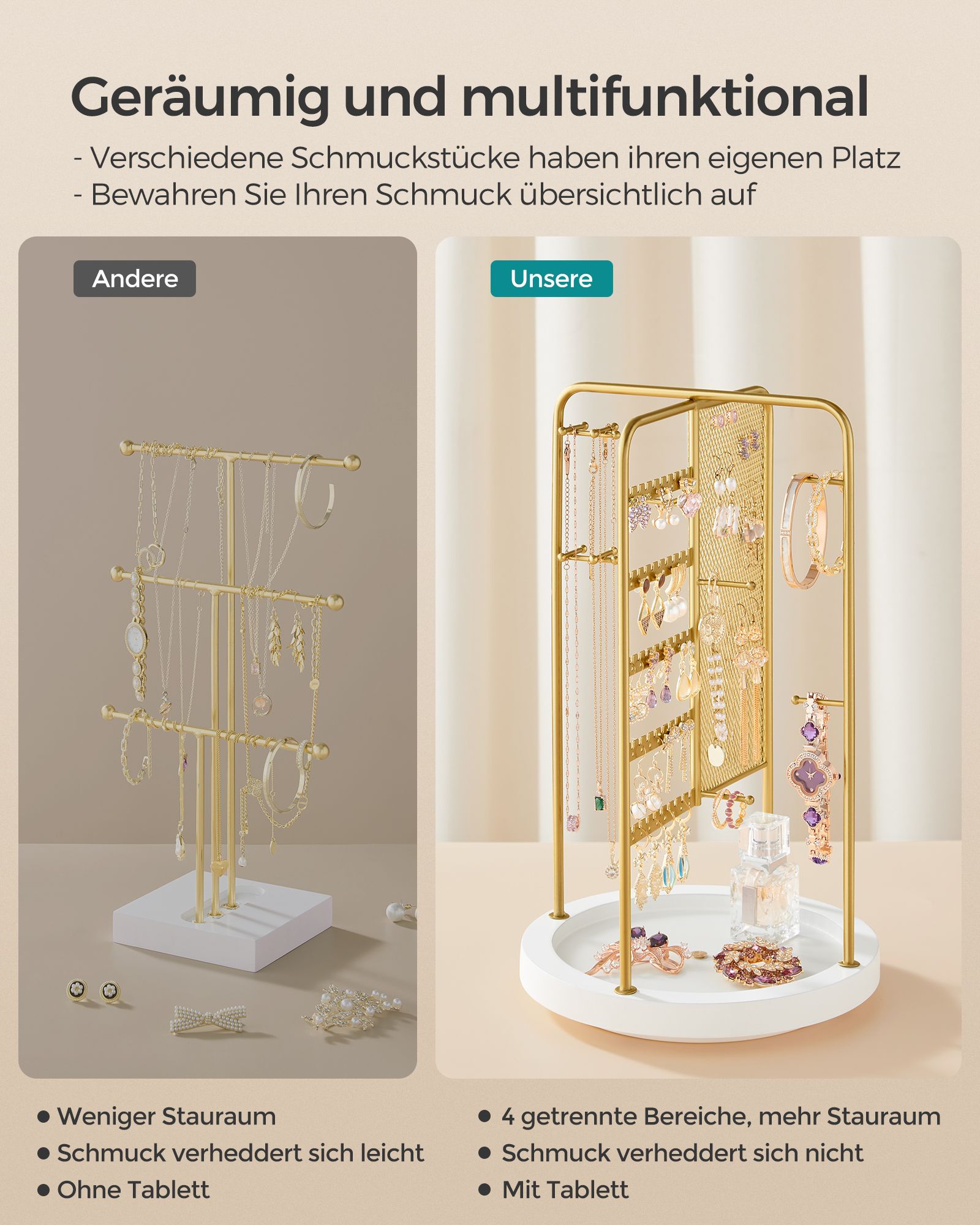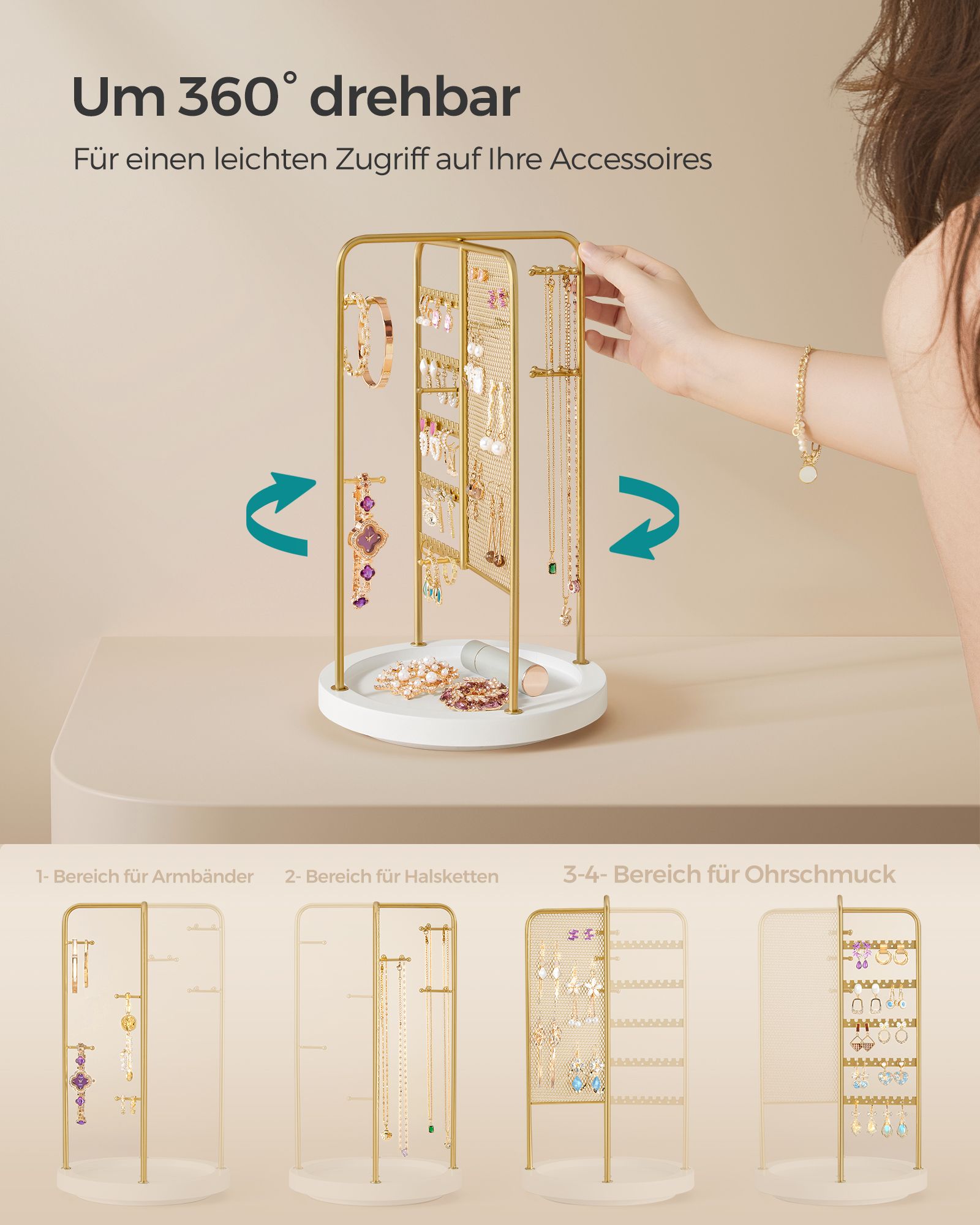 SONGMICS koruteline, käännettävä koruteline, 4 erillistä osastoa, metallirunko, korujen säilytys kaulakoruille, rannekoruille, korvakoruille, nappikorvakoruille, sormuksille, lahjaidea