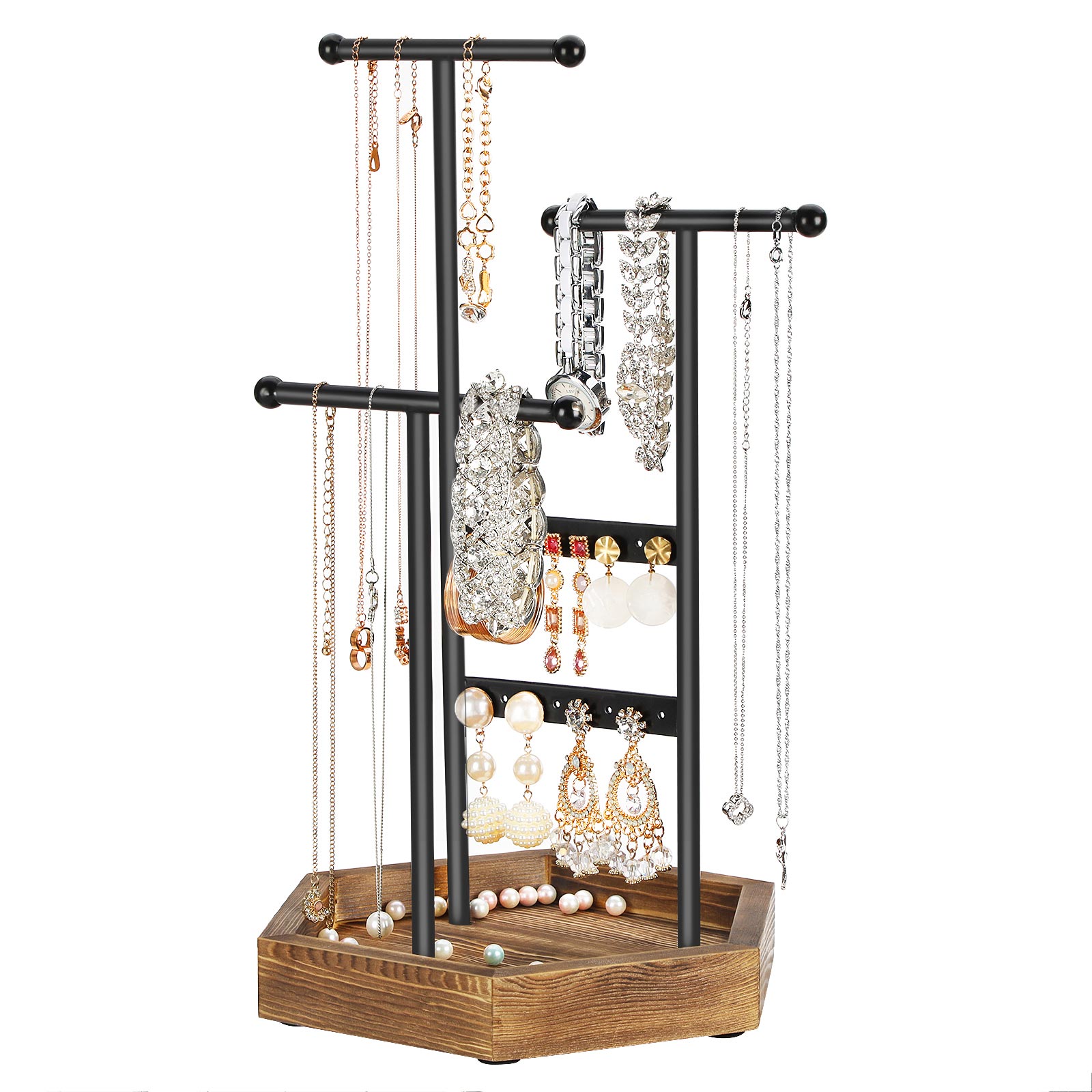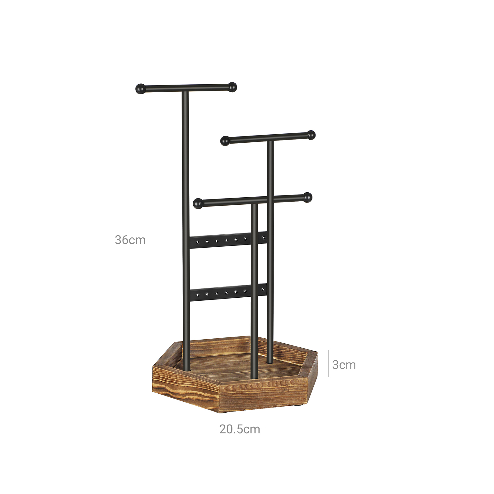Järjestä korusi vaivattomasti: ei enää tarvetta kaivella korujasi sotkuisista laatikoista tai pahvilaatikoista! Pidä korusi näkyvillä, hyvin järjestettyinä ja helposti saatavilla tällä SONGMICS-korutelineellä. Kätevä ja koristeellinen koruteline: 2 tankoa ja 3 pylvästä tarjoavat runsaasti tilaa, ja pallopäät estävät koruja liukumasta. Mustan ja luonnollisten puun värien yhdistelmä luo esteettisen korutelineen. Ihanteellinen yksityiseen ja kaupalliseen käyttöön: tämä korupuu voi säilyttää kaulakoruja, rannekoruja, korvakoruja, nappikorvakoruja ja sormuksia kotona. Se toimii kuitenkin yhtä hyvin myös esittelytelineenä kaupassa tai salonkissa.Tuotetiedot: Väri: musta, ruskea/vintage Materiaali: rautakehys, massiivipuupohja Koko: 20,5 x 18 x 36 cm (P x L x K) Paino: 0,51 kg Toimitus sisältää: 1 x koruteline SONGMICS-ohjeet: Aseta tangot ja tiiviste oikeaan asentoon ja kiristä sitten ruuvit. Liiallinen voima voi vahingoittaa puupohjaa. Rautakehys voi vääntyä kuljetuksen aikana, mutta sen voi säätää käsin. Älä sijoita tuotetta kosteisiin paikkoihin, jotta se ei väänny.