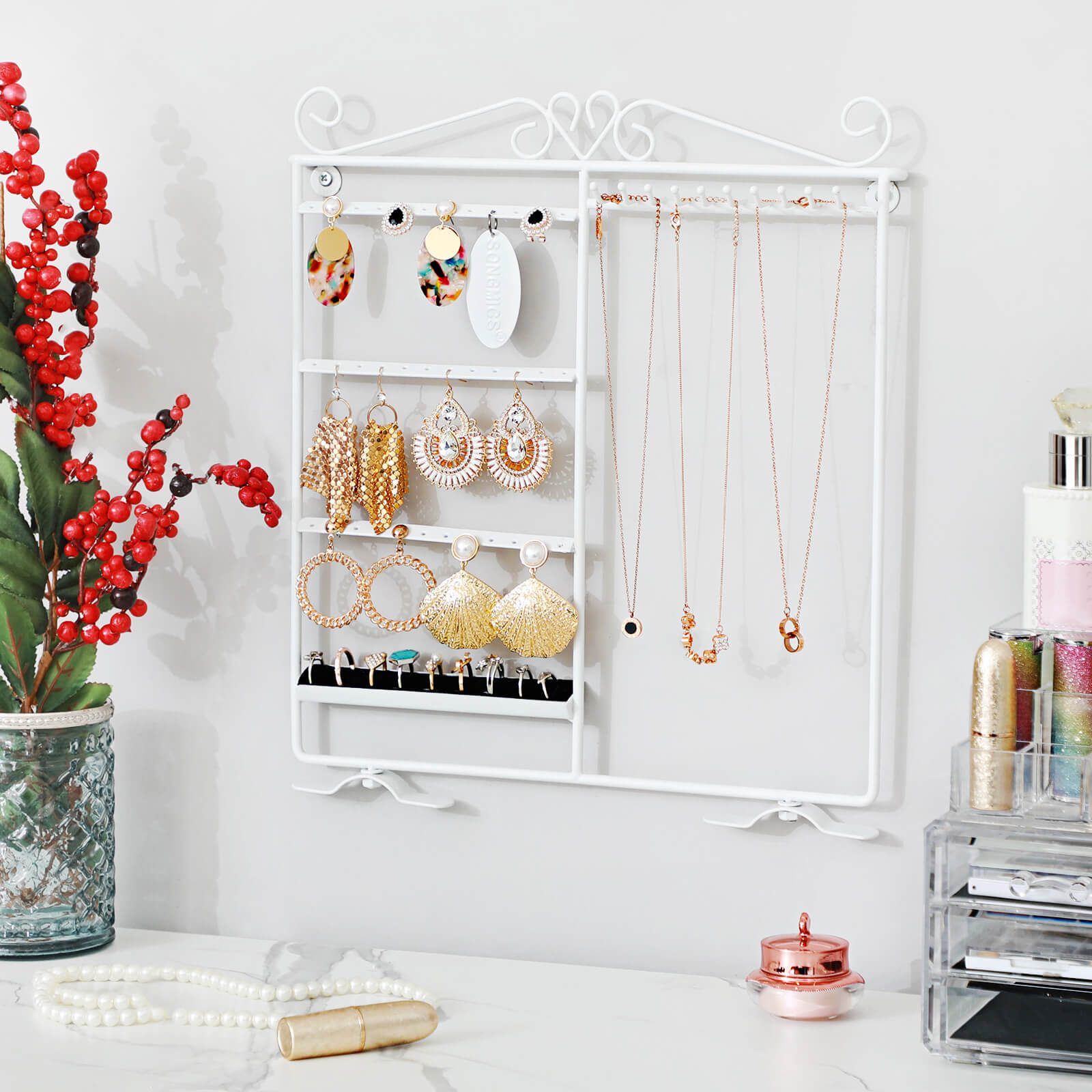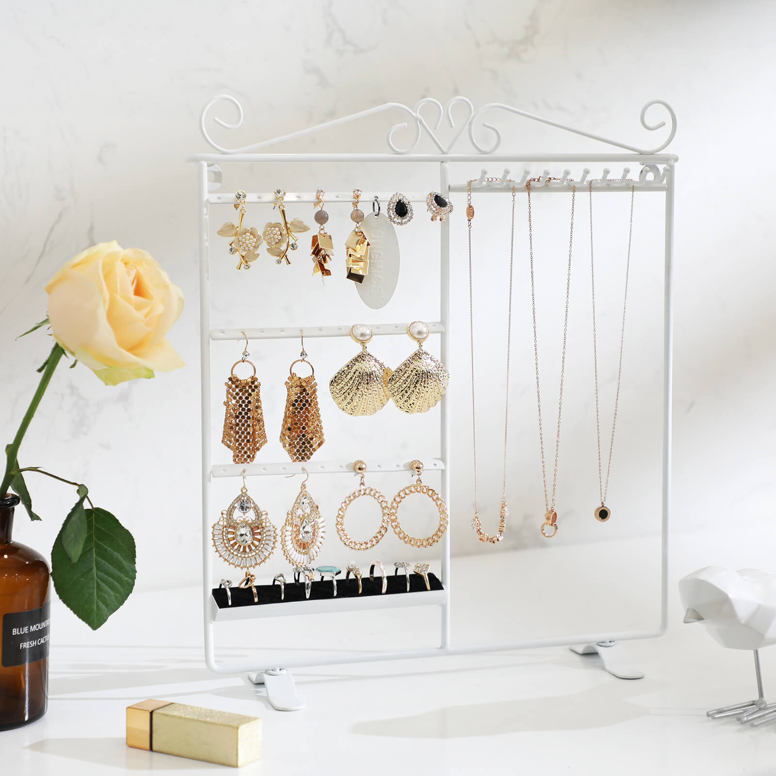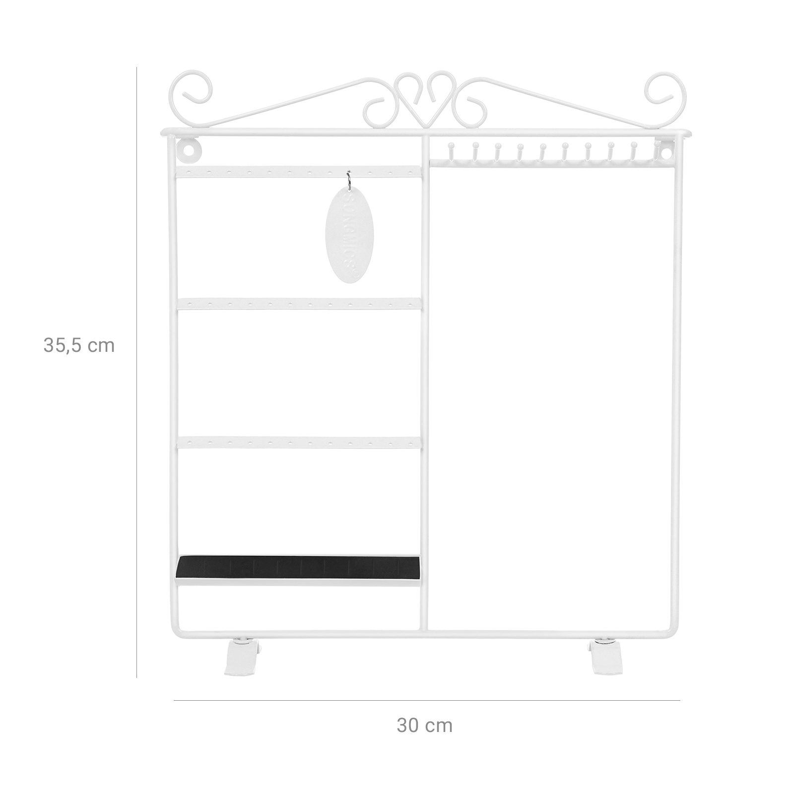 Korvakorut ja kaulakorut lojuvat ympäriinsä? Eikö oikeita koruja löydy koskaan, kun niitä tarvitaan? Songmics-koruteline on ihanteellinen ratkaisu tällaisiin ongelmiin. Se on valmistettu tukevasta raudasta, ja sen pinta on jauhemaalattu, joten se on sileä ja suojaa alla olevaa metallia kestävästi. Siihen voi ripustaa jopa 18 paria korvakoruja ja 10 kaulakorua. Sormuksillesi on myös oma paikkansa. Lisäksi voit asettaa sen pöydälle tai ripustaa seinälle. Songmics korutelineen avulla korusi ovat kauniisti järjestyksessä, ja se toimii myös sisustuksena. Tuotetiedot: – Materiaali: rauta – Väri: valkoinen – Mitat: 31,5 x 33 cm (L x K) – Jalan mitat: 11 x 1,8 cm – Kahden reikärivin välinen etäisyys: 5,5 cm – Kahden reiän/koukun välinen vaakasuora etäisyys: 1 cm – Koukun ja alareunan välinen etäisyys: 24,5 cm – Koukun pituus: 3 cm Toimitus sisältää: – 1x korukotelo