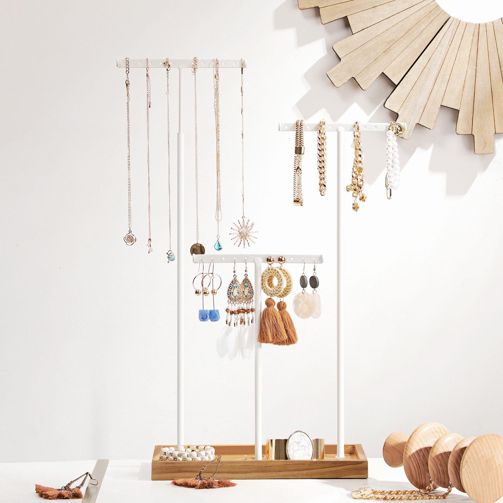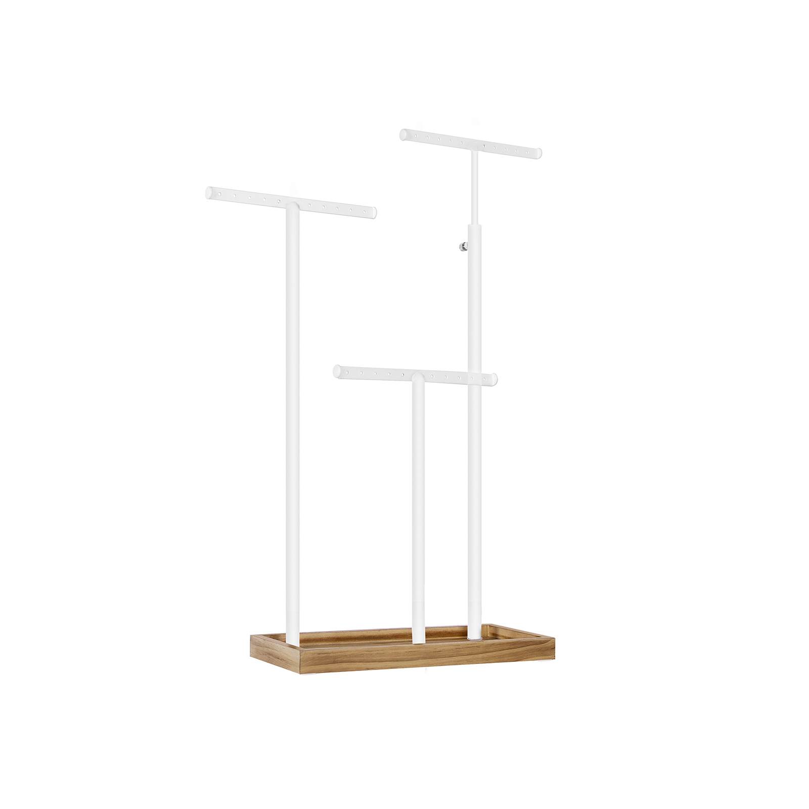 Tuo korusi oikeaan valoon Kasvaako korukokoelmasi koko ajan? Kertyvätkö sormuksesi, kaulakorusi, rannekorusi ja korvakorusi laatikkoon? Tämä fiksu 2-in-1-koruteline tarjoaa sinulle enemmän apua kuin muut. Säilytä lukuisia aarteitasi tangoilla ja tarjottimella! Hyvät materiaalit puhuvat puolestaan Valkoiset metallitangot ovat vakaita ja kestäviä ja pitävät aarteesi tukevasti paikoillaan. Laadukasta mäntypuuta oleva tarjotin alaosassa takaa pitkän käyttöiän, ja pohjassa olevat tyynyt tekevät korutelineestä liukumattoman. Tuotetiedot:- Väri: vintage-ruskea-valkoinen – Materiaali: mäntypuuta, metallia – Koko: 25 x 11,8 x (41,5-56,5) cm (P x L x K) – Säädettävän tangon korkeus (ilman tarjottimen korkeutta): 40-54 cm – Paino: 0,7 kg Toimitus sisältää:- 1 x koruteline – 1 x ohjeet (DE, EN, FR, ES, IT) SONGMICS-ohjeet: – Jos haluat säätää tangon korkeutta, sinun on ensin löysättävä pystytangon ruuvia.