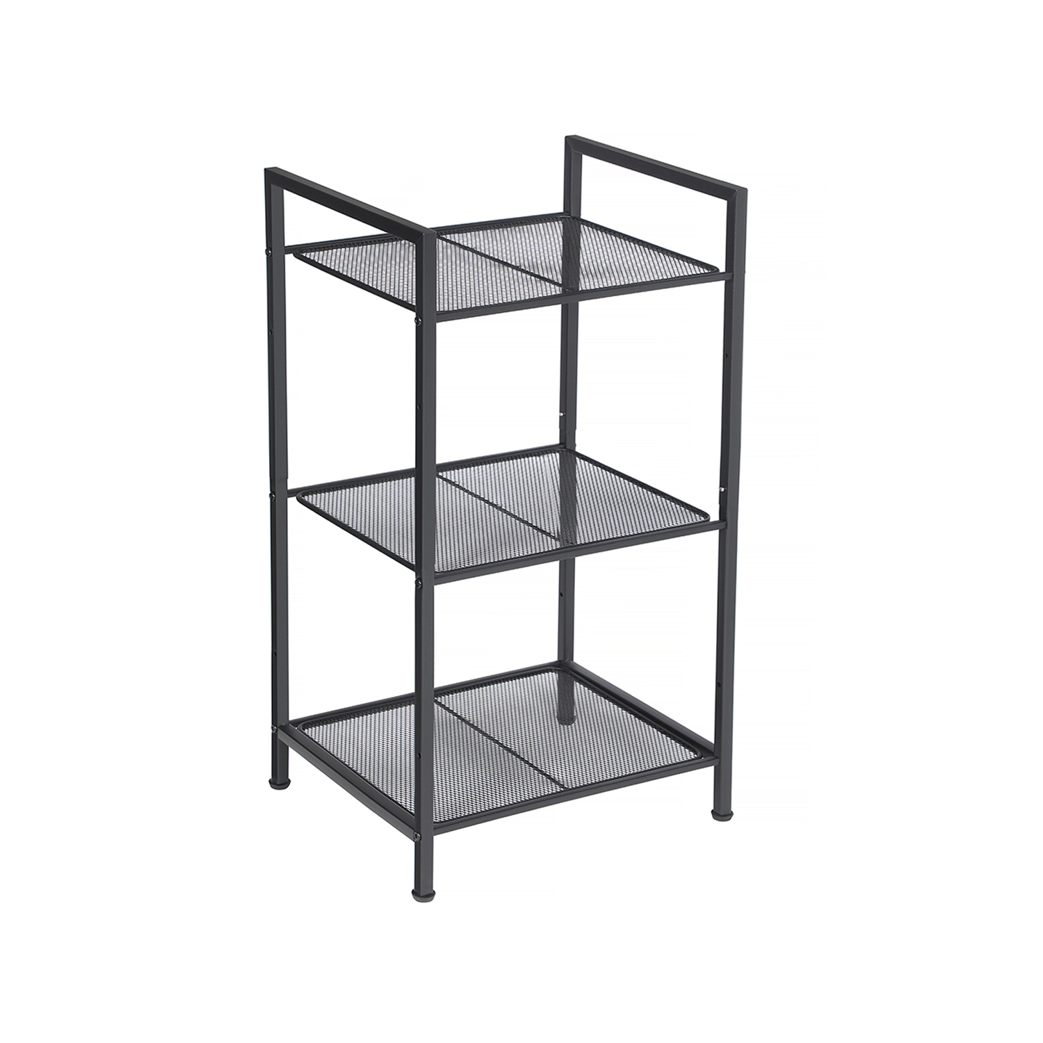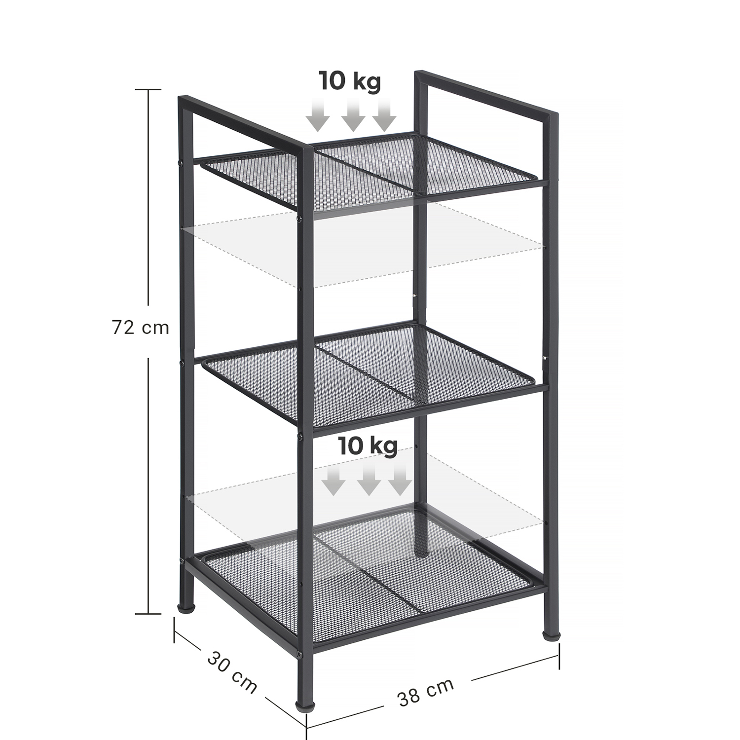 Tämän kylpyhuonehyllyn tärkeimmät ominaisuudet: – Korkeussäädettävien hyllyjen ansiosta voit säilyttää hyllyllä erikokoisia esineitä. – Voit yhdistää useita hyllyjä toisiinsa saadaksesi lisää säilytystilaa. – Tämä kompakti keittiöhylly vie vain vähän lattiatilaa. – Jokainen tämän kasvihyllyn hylly kestää jopa 10 kg:n painon.- Tiheäverkkoiset hyllyt antavat kylpyhuonehyllylle hyvän vakauden ja kantavuuden. – Säädettävät jalat tasoittavat pienet epätasaisuudet lattiassa. – Yksinkertaiset, ymmärrettävät ohjeet ja selkeästi merkityt osat helpottavat tämän hyllyn kokoamista. – Tämä hylly on tyylikäs ja käytännöllinen ja sopii eri huoneisiin. Tuotetiedot:- Väri: musta – Materiaali: teräs – Koko: 38 x 30 x 72 cm (P x L x K) – Paino: 2,1 kg – Maks. staattinen kantavuus per taso: 10 kg Toimitus sisältää: – 1 x kylpyhuonehylly – 1 x lisävarustepaketti – 1 x kaatumissuoja – 1 x ohjeet SONGMICS Huomautukset:- Jokaisen hyllyn asennuksessa sivurungon neljän reiän tulee olla samalla korkeudella.