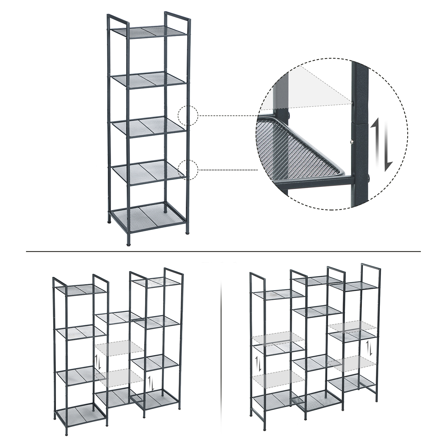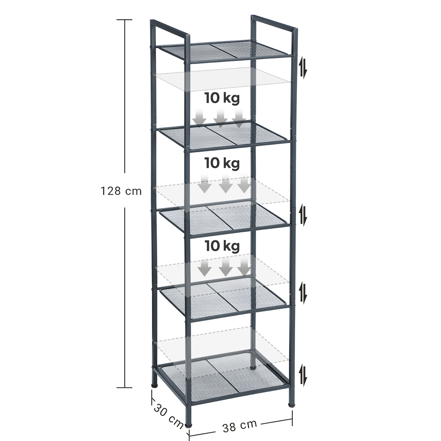 Tämän kylpyhuonehyllyn tärkeimmät ominaisuudet: – Korkeussäädettävien hyllyjen ansiosta voit säilyttää hyllyllä erikokoisia esineitä. – Voit yhdistää useita näitä hyllyjä toisiinsa saadaksesi lisää säilytystilaa. – Tämä kompakti keittiöhylly vie vain vähän lattiatilaa. – Jokainen tämän kasvihyllyn hylly kestää jopa 10 kg:n painon.- Tiheäverkkoiset hyllyt antavat kylpyhuonehyllylle hyvän vakauden ja kantavuuden. – Säädettävät jalat tasoittavat pienet epätasaisuudet lattiassa. – Yksinkertaiset, ymmärrettävät ohjeet ja selkeästi merkityt osat helpottavat tämän hyllyn kokoamista. – Tämä hylly on tyylikäs ja käytännöllinen ja sopii eri huoneisiin. Tuotetiedot:- Väri: musta – Materiaali: teräs – Koko: 38 x 30 x 128 cm (P x L x K) – Paino: 3,3 kg – Maks. staattinen kantavuus per taso: 10 kg Toimitus sisältää: – 1 x kylpyhuonehylly – 1 x lisävarustepaketti – 1 x kaatumissuoja – 1 x ohjeet SONGMICS Huomautukset:- Jokaisen hyllyn asennuksessa sivurungon neljän reiän tulee olla samalla korkeudella.