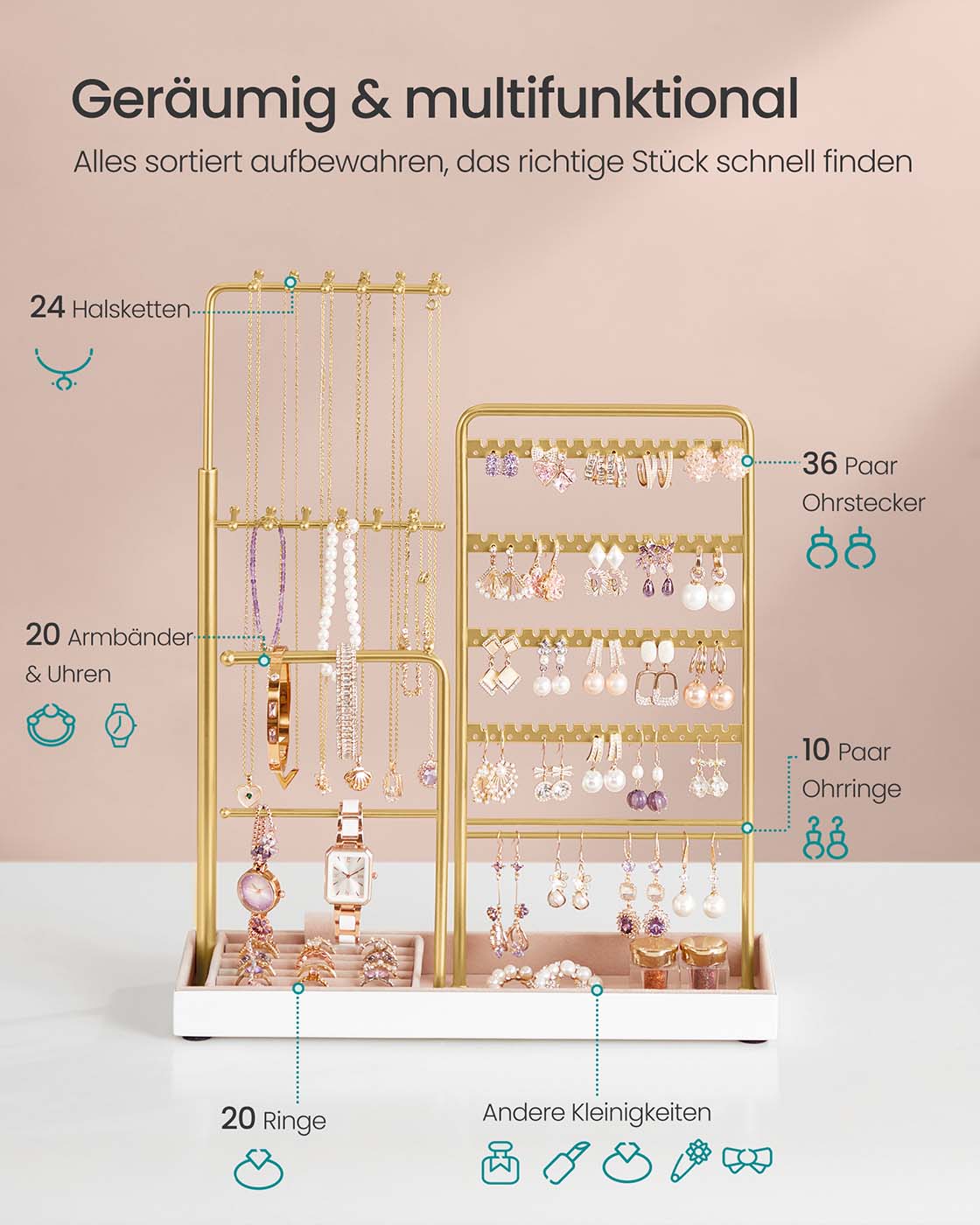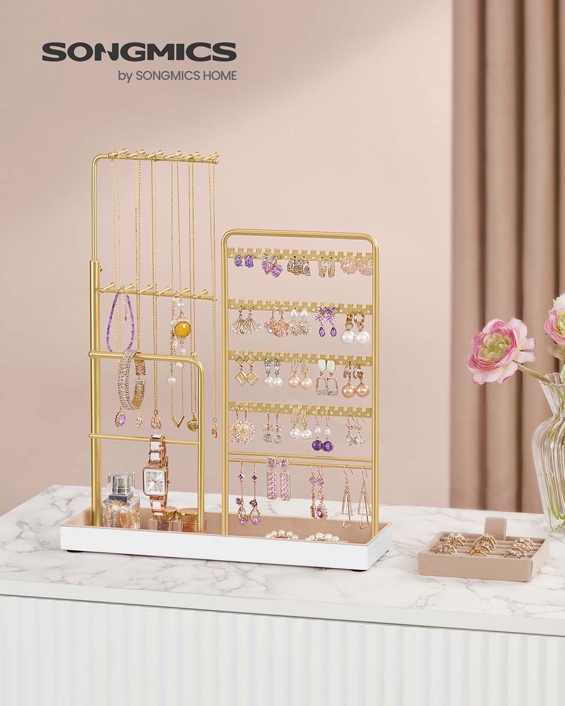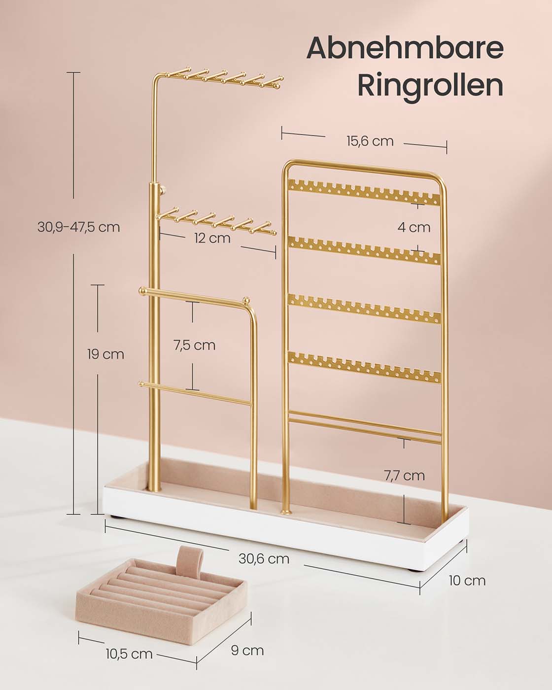 SONGMICS koruteline, koruteline, metallikehys, koruteline samettia, ulosvedettävä ketjupidike, korkeus 30,9–47,5 cm, korujen säilytys, vaaleankultainen JJS026A01