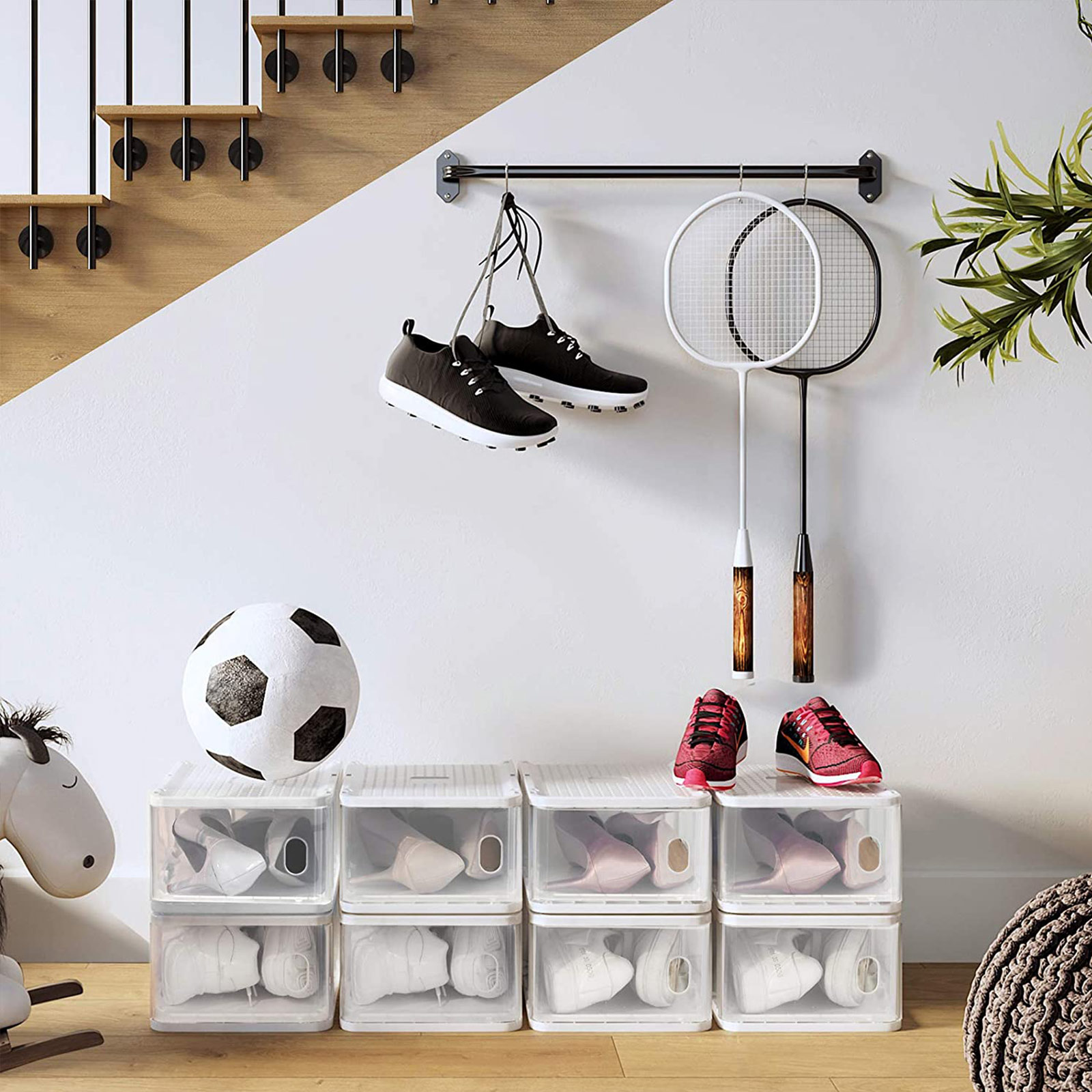 Nämä SONGMICS:n pinottavat kenkälaatikot auttavat sinua paitsi pitämään kenkäsi siististi järjestyksessä, myös näkemään kaikki laatikoihin säilötyt kengät yhdellä silmäyksellä ja pääsemään niihin nopeasti käsiksi. Säilytä kaikki kenkäsi näissä SONGMICS:n muovilaatikoissa, jotta et enää kompastu eteisessäsi kaoottisesti hajallaan oleviin kenkiin!Pinoa laatikot ja kengät päällekkäin: Valmistettu kestävästä PP-muovista, nämä kenkäorganisaattorit lupaavat pitkän käyttöiän ja suojaavat kenkäsi pölyltä ja kosteudelta. Älykkään muotoilun ansiosta, jossa laatikoiden ylä- ja alaosat sopivat tarkasti toisiinsa, useita muovilaatikoita voidaan pinota vakaasti päällekkäin. Näin saat tilaa säästävän kenkäkaapin. Sopii kengille, joiden koko on enintään 41: Sisämitat 19,5 x 27,5 x 10,5 cm, joten kenkälaatikkomme ovat riittävän suuria kengille, joiden koko on enintään 41. Lisäksi nämä laatikot ovat monikäyttöisiä ja sopivat esimerkiksi kenkävoiteiden tai -harjojen säilytykseen. Tuotetiedot: Väri: läpinäkyvä, valkoinen Materiaali: PP-muovi (polypropeeni) Koko per laatikko: 21,5 x 32,5 x 13,5 cm (P x L x K) Sisämitat per laatikko: 19,5 x 27,5 x 10,5 cm (P x L x K) Paino: 3,8 kg Toimitus sisältää: 8 x kenkälaatikko SONGMICS Huomautukset: Mittaa kenkäsi ennen ostamista ja tarkista, että ne mahtuvat näihin kenkälaatikoihin.