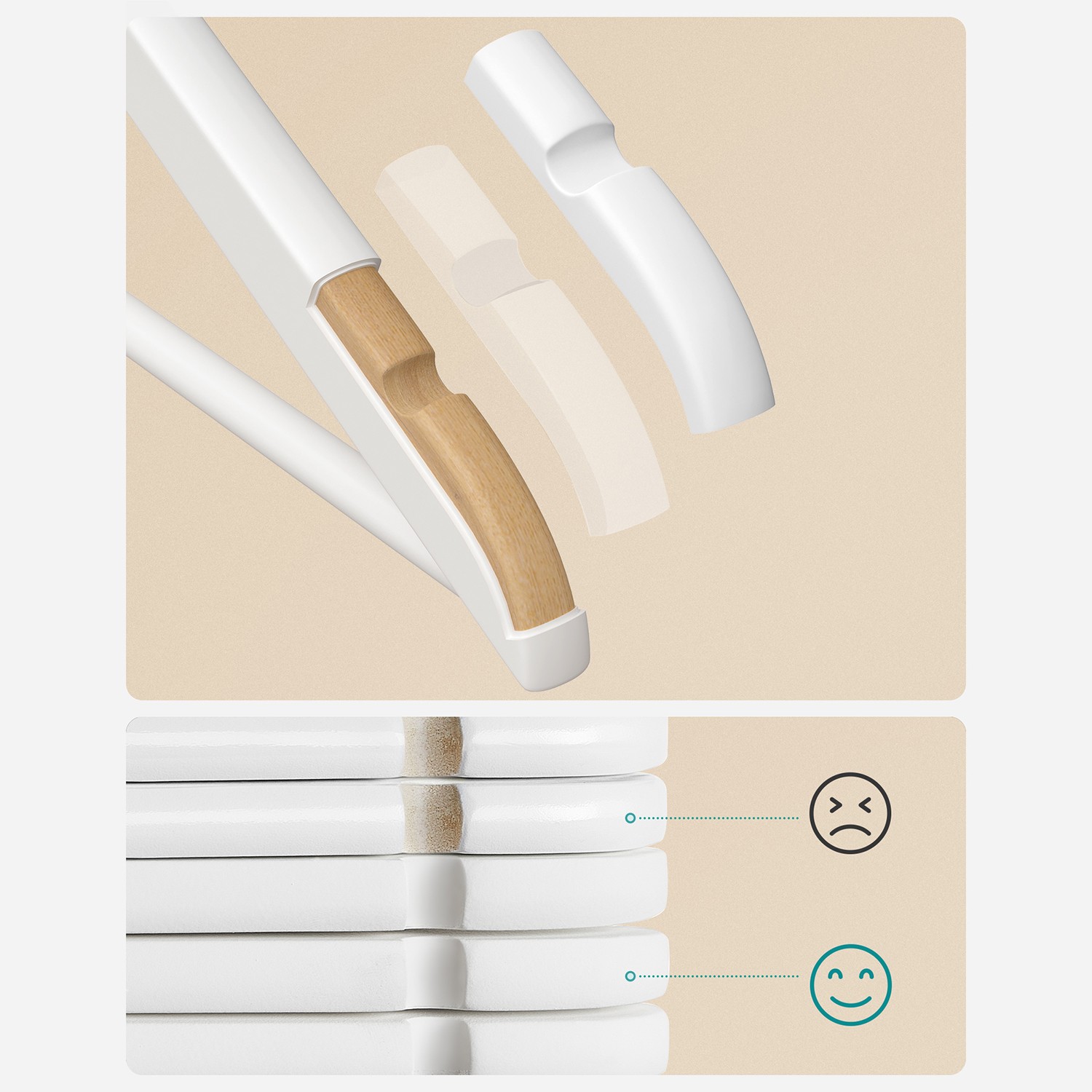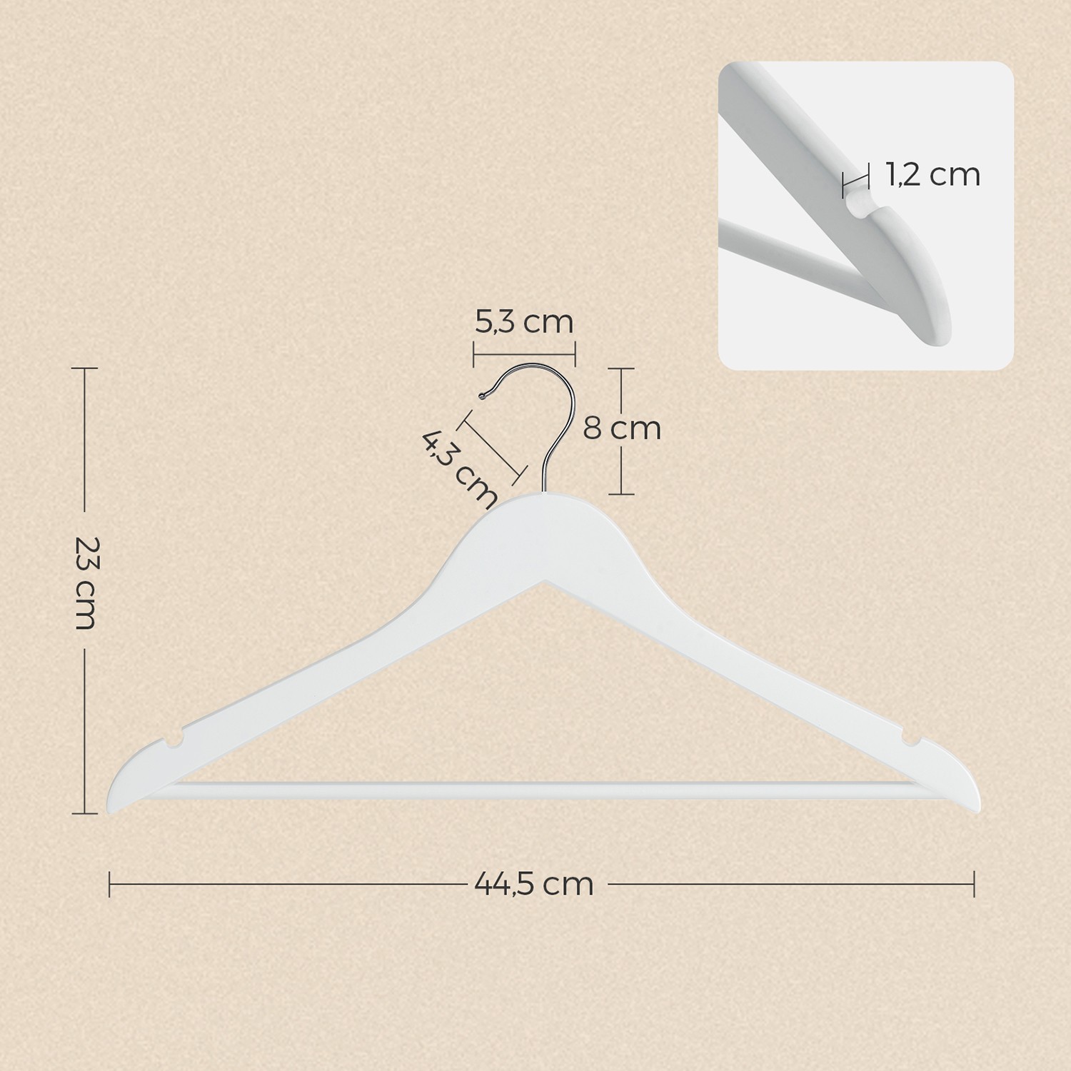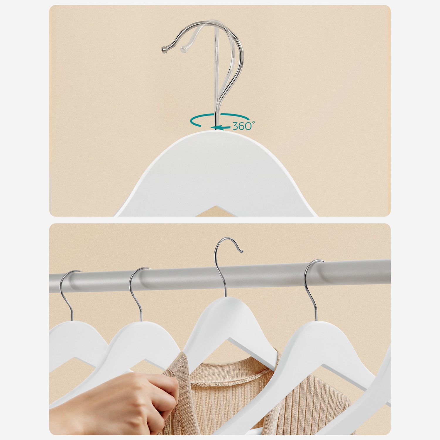 Kumipinnoite tekee eron: näiden henkareiden pinta on kumipinnoitettu ja tuntuu miellyttävän sileältä. Siksi nämä henkarit sopivat täydellisesti hienojen vaatteiden ripustamiseen ja suojaavat niitä hellävaraisesti. Erinomaisen luistamattomuutensa ansiosta ne pitävät jopa silkkipuseroita tukevasti paikoillaan. Lisäksi puiset henkarit antavat vaatekaapillesi tyylikkään ilmeen yksinkertaisen muodon, mattavärin ja modernin ulkonäön ansiosta.Tuotetiedot: Väri: valkoinen Materiaali: massiivipuu, kumipinnoite, kromattu metallikoukku Koko per henkari: 44,5 x 1,2 x 23 cm (P x L x K) Paino 20 henkarille: 2,5 kg Maks. staattinen kantavuus per henkari: 5 kg Toimitus sisältää: 20 x henkari SONGMICS Huomautukset:Henkarin enimmäiskuormituskyky on 5 kg. Älä ylitä tätä enimmäispainoa. Älä käytä näitä henkareita kuivausrummussa.