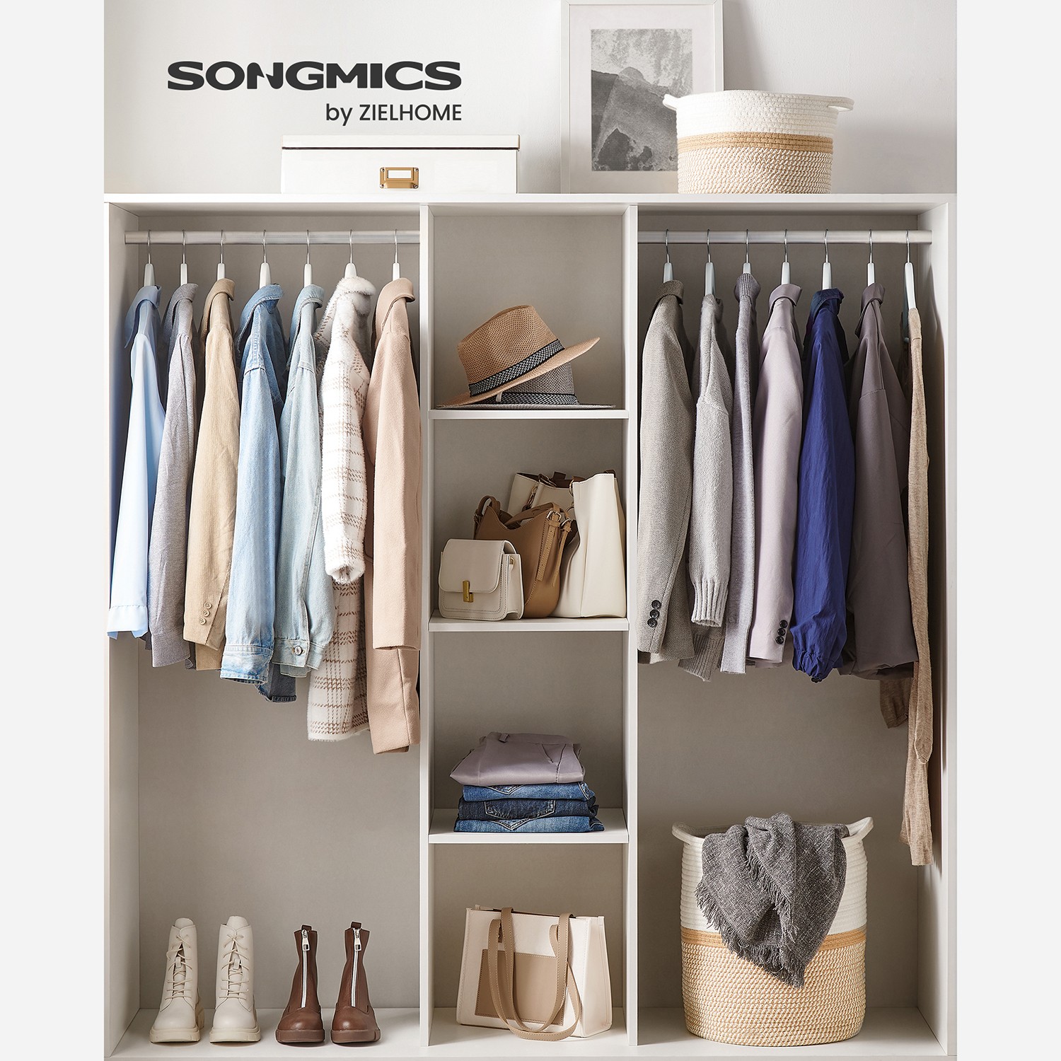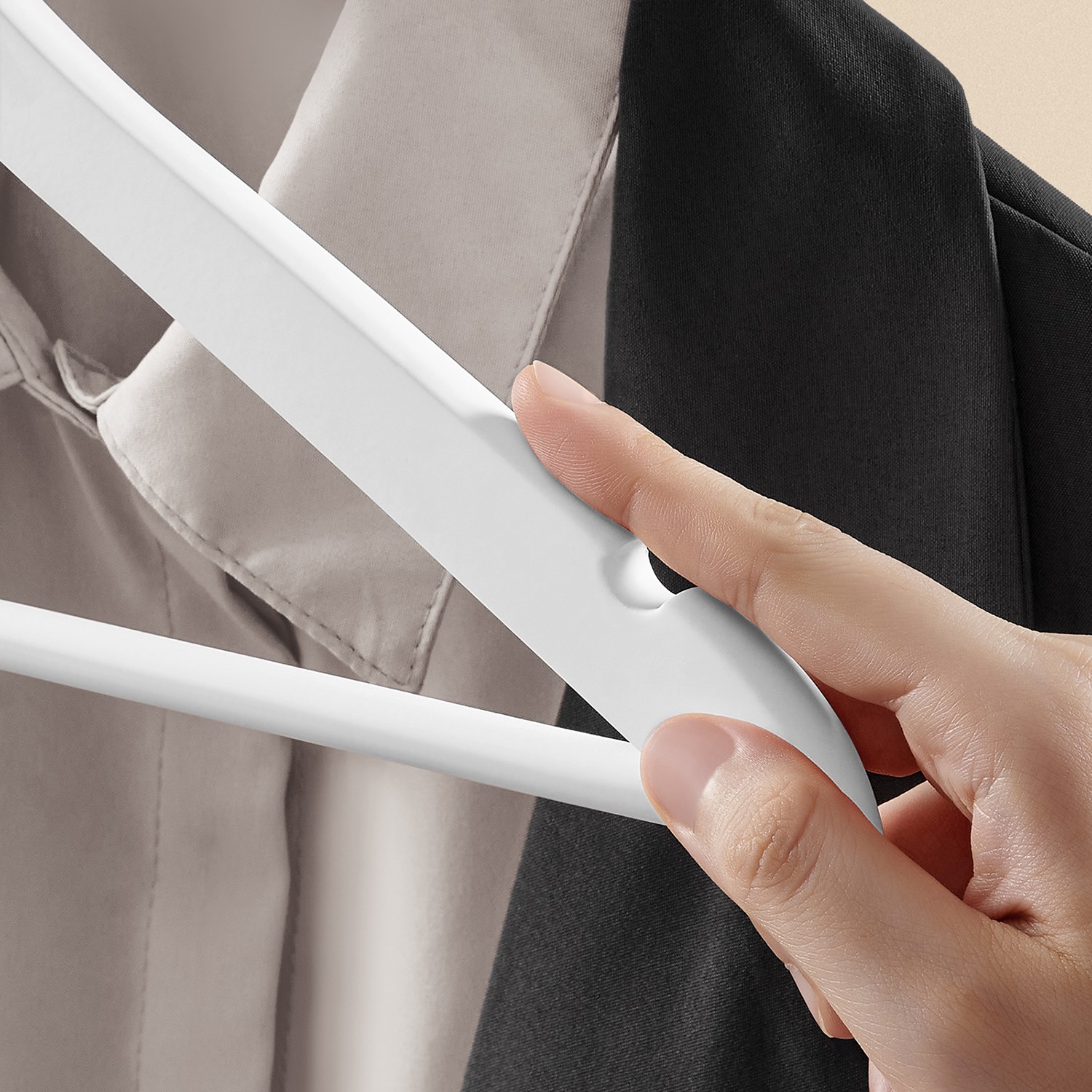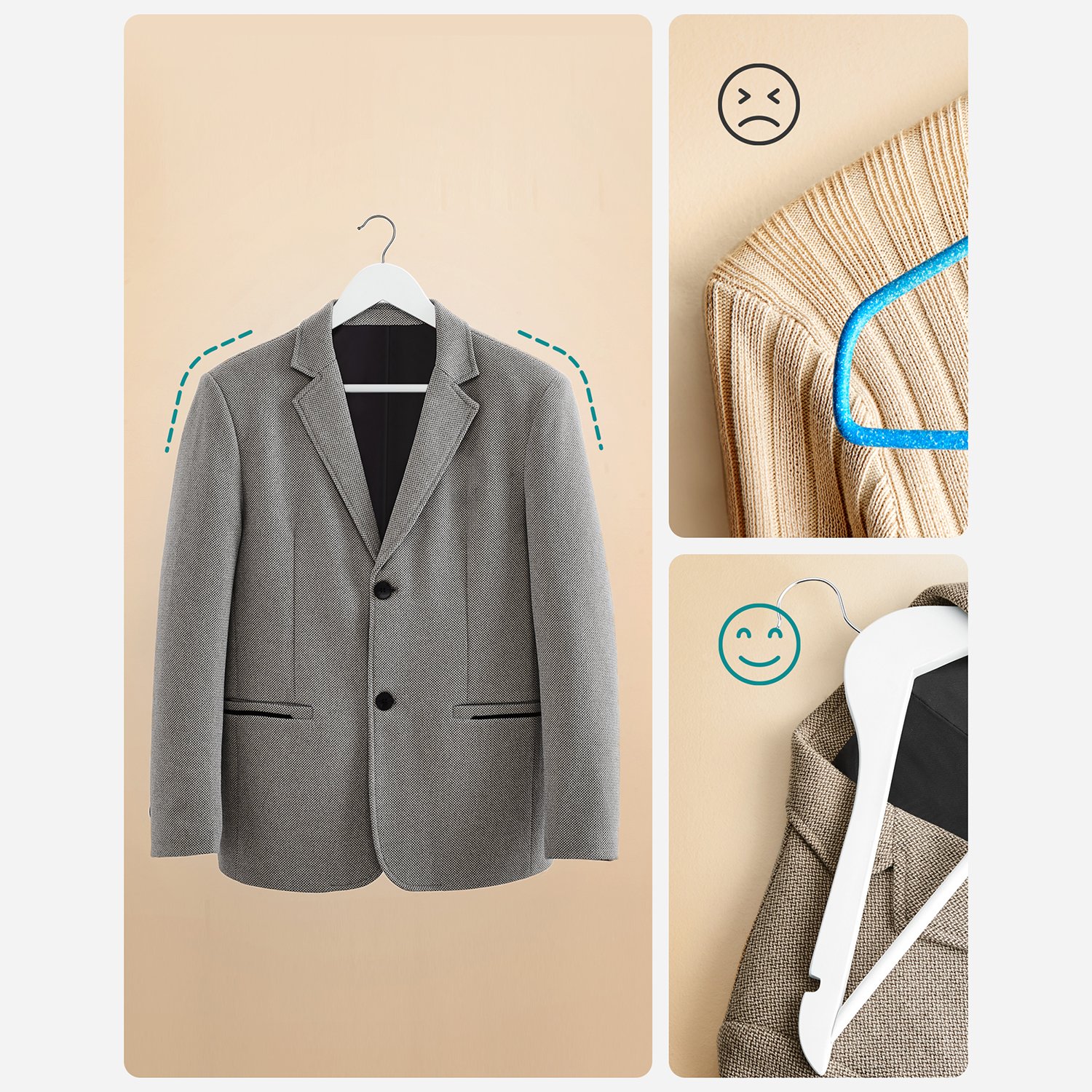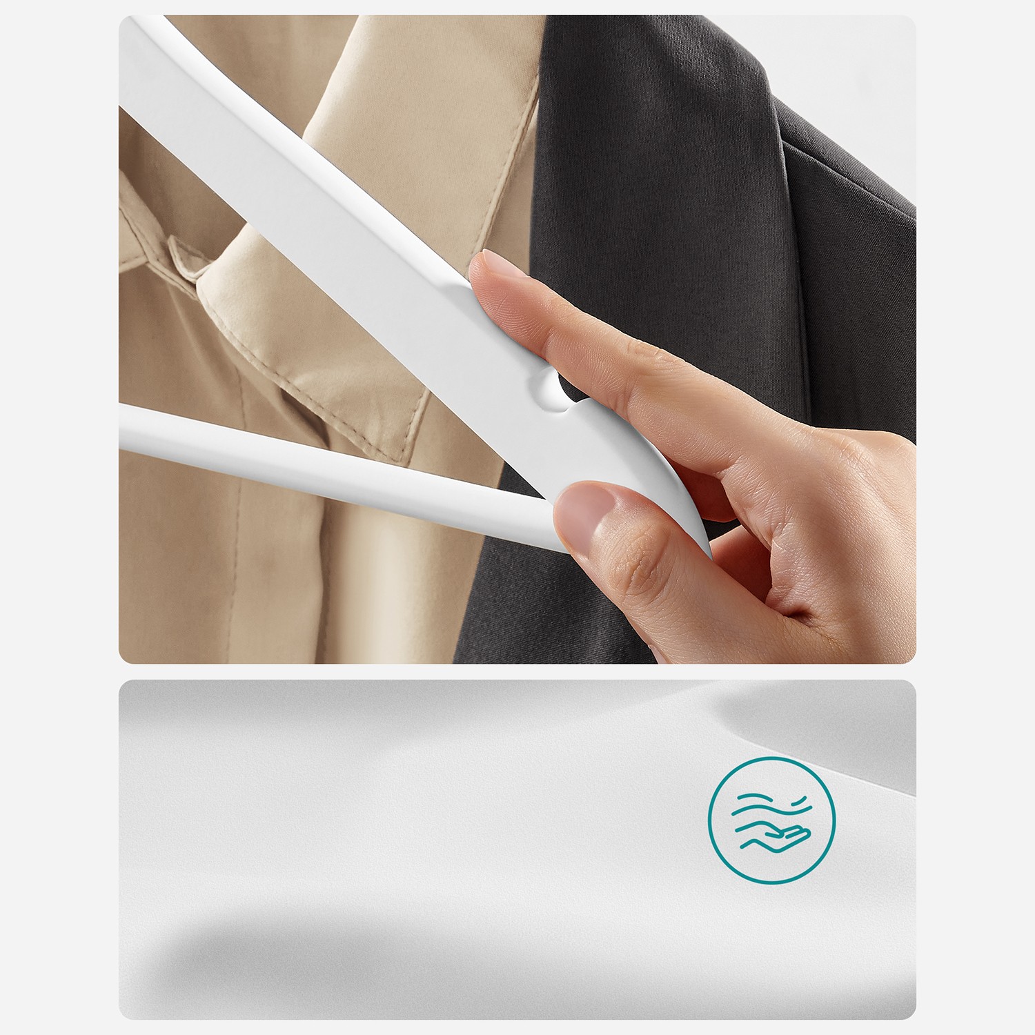 Kumipinnoite tekee eron: näiden henkareiden pinta on kumipinnoitettu ja tuntuu miellyttävän sileältä. Siksi nämä henkarit sopivat täydellisesti hienojen vaatteiden ripustamiseen ja suojaavat niitä hellävaraisesti. Erinomaisen luistamattomuutensa ansiosta ne pitävät jopa silkkipuseroita tukevasti paikoillaan. Lisäksi puiset henkarit antavat vaatekaapillesi tyylikkään ilmeen yksinkertaisen muodon, mattavärin ja modernin ulkonäön ansiosta.Tuotetiedot: Väri: valkoinen Materiaali: massiivipuu, kumipinnoite, kromattu metallikoukku Koko per henkari: 44,5 x 1,2 x 23 cm (P x L x K) Paino 20 henkarille: 2,5 kg Maks. staattinen kantavuus per henkari: 5 kg Toimitus sisältää: 20 x henkari SONGMICS Huomautukset:Henkarin enimmäiskuormituskyky on 5 kg. Älä ylitä tätä enimmäispainoa. Älä käytä näitä henkareita kuivausrummussa.