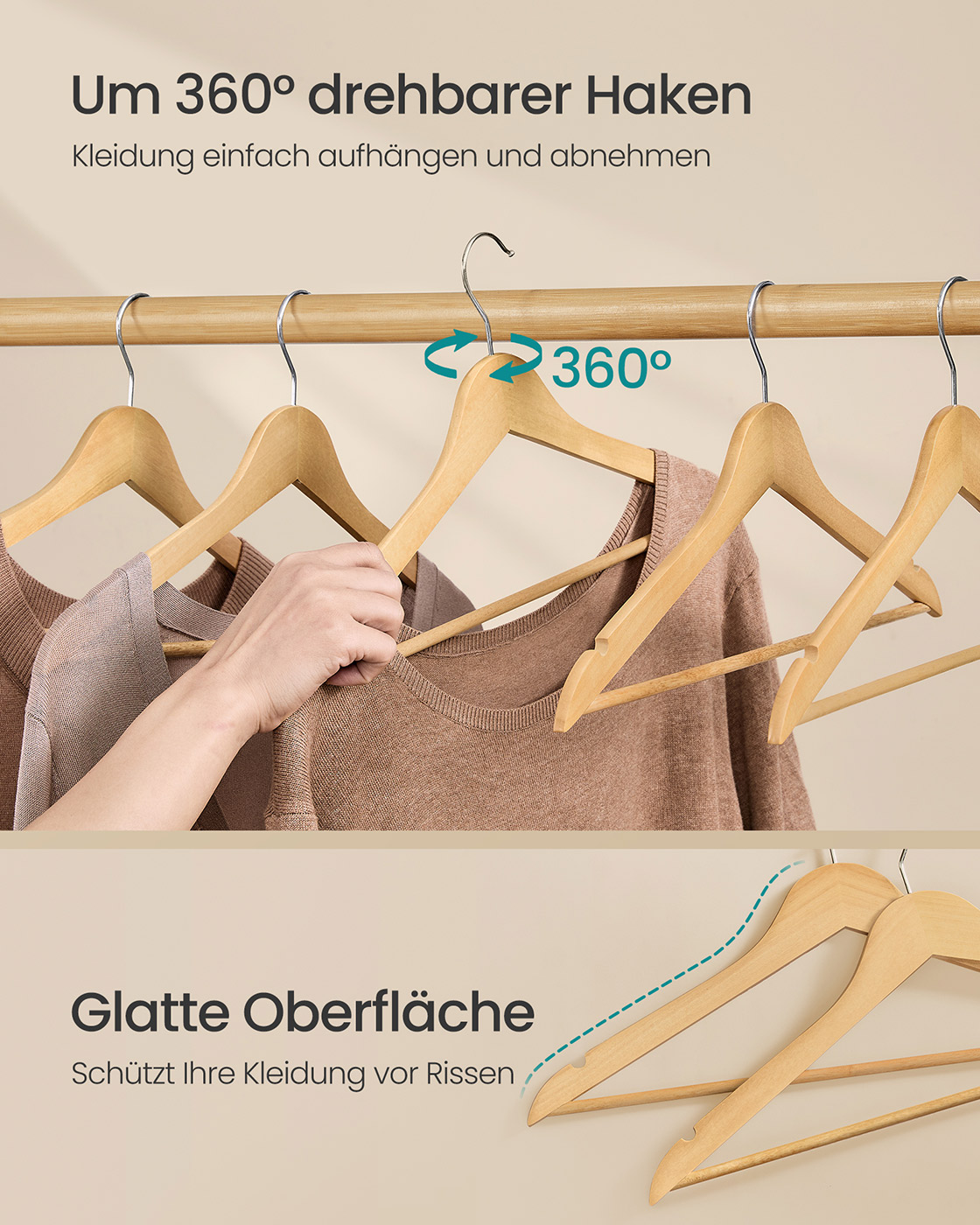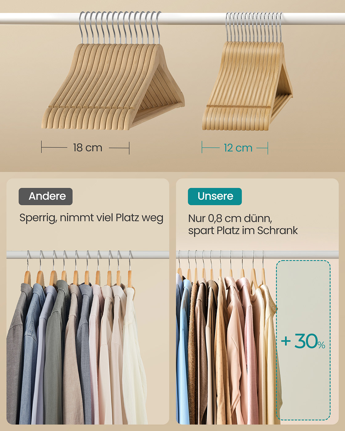SONGMICS puinen vaateripustin, 30 kpl:n sarja, kapea puinen ripustin, ripustin, olkapääalueella lovet, housujen ripustin, 360° kääntyvä koukku, koivupuu, olkaimille ja takkeille, musta CRW030B01