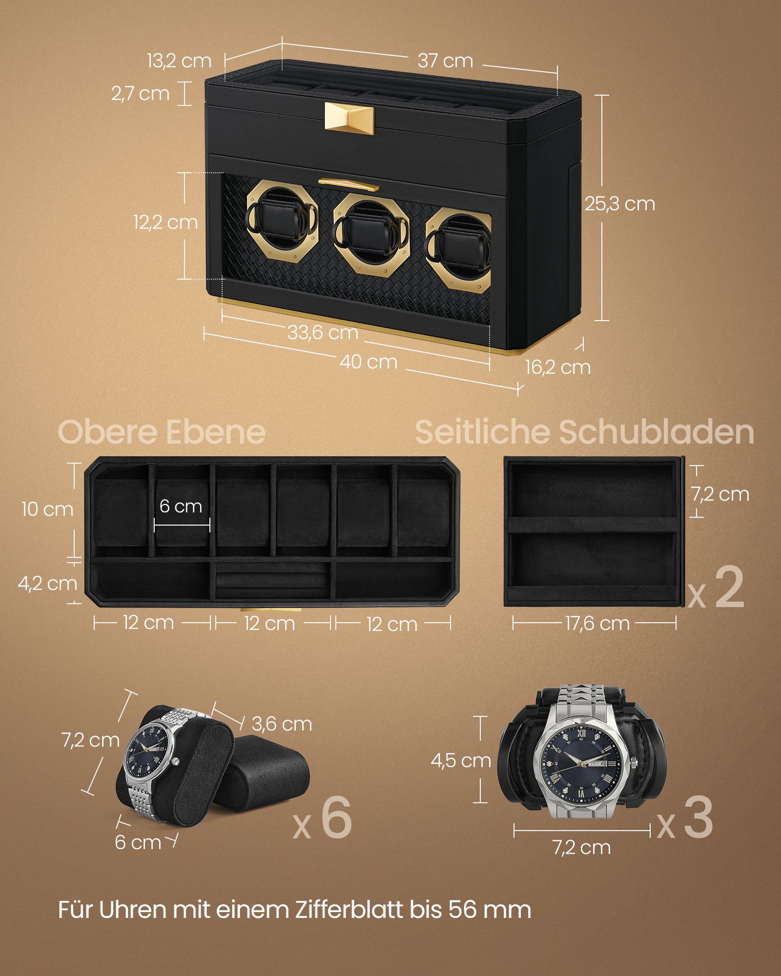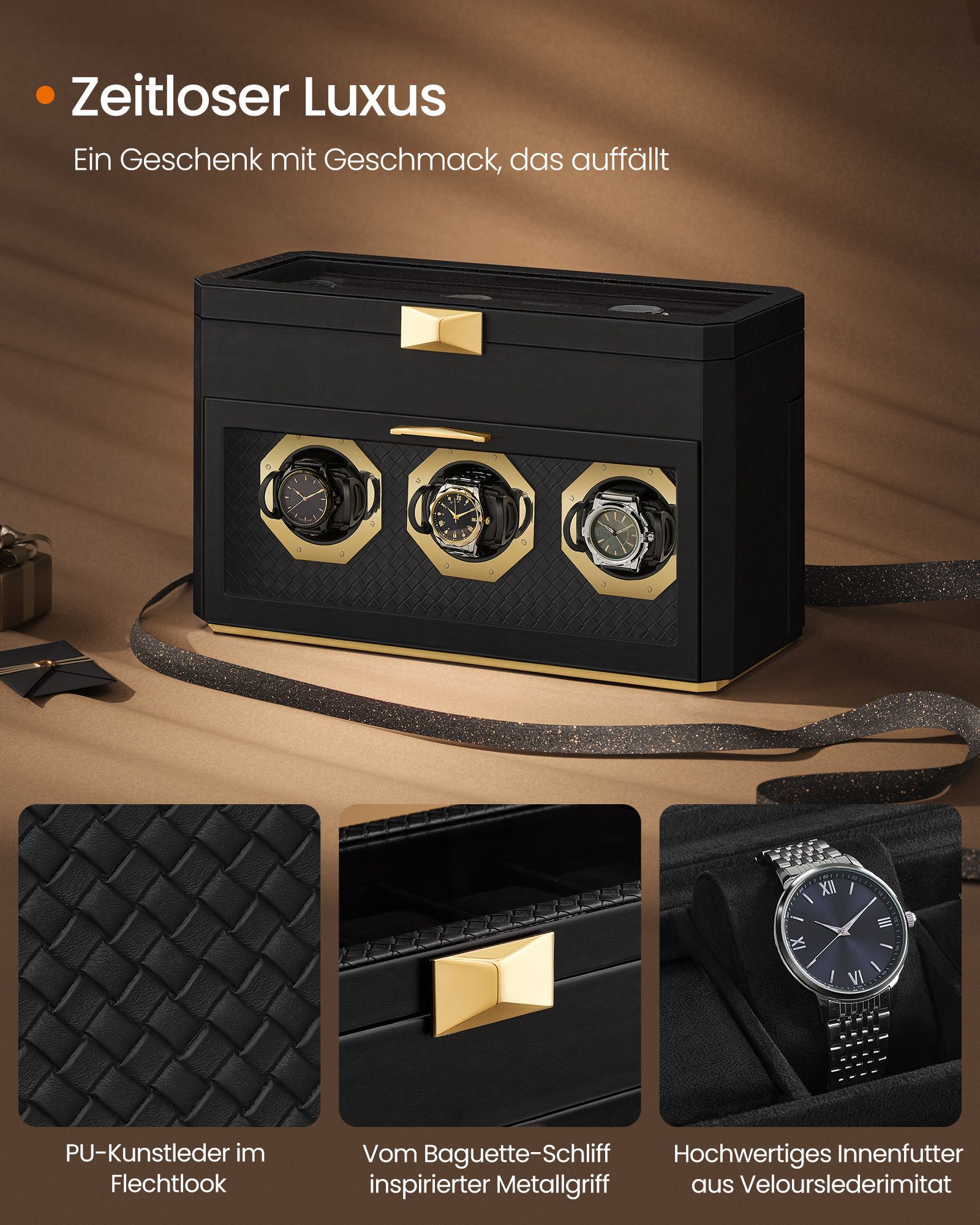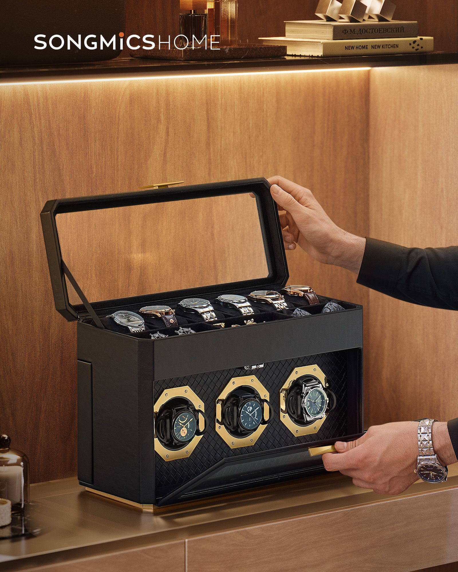 SONGMICS HOME RONNE -kokoelma – kellolaatikko 9 kellolle, lasi-ikkuna ylä- ja etupuolella, säädettävät kellotelineet, PU-keinonahka punottu, leijailu-efekti, lahjaidea, musta JWB026B01