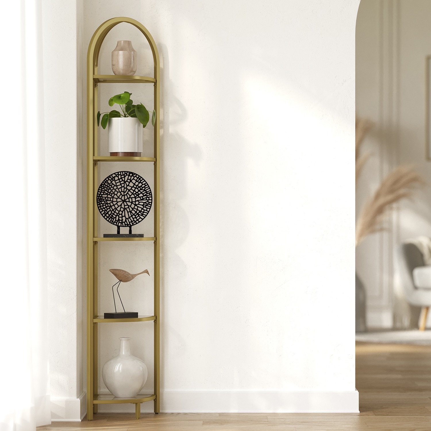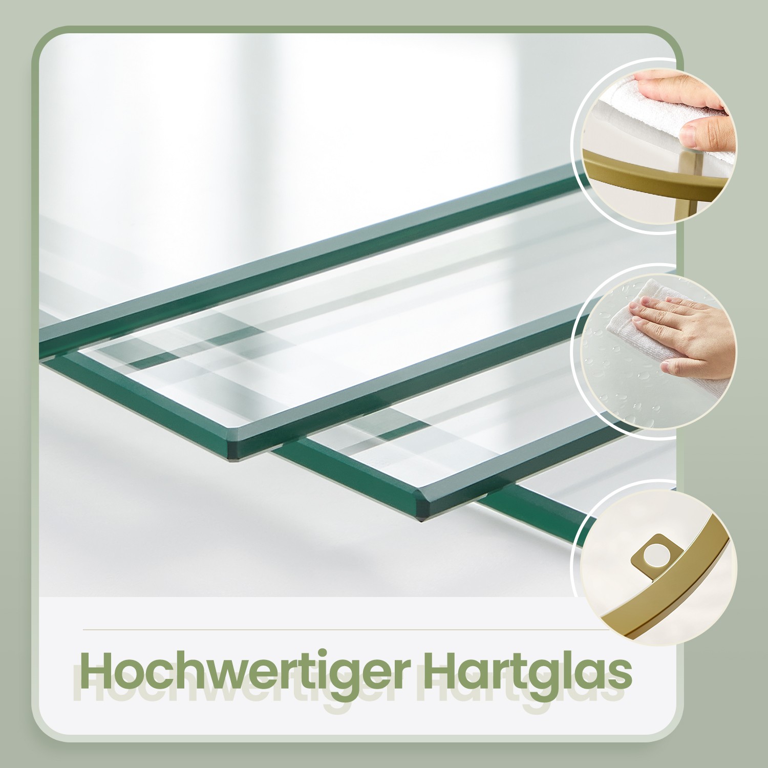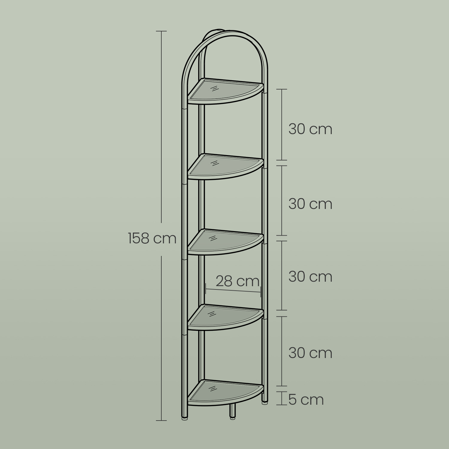 Tuotetiedot: – Väri: kultainen – Materiaali: lasi, metalli – Koko: 28 x 28 x 158 cm (P x L x K) – Hyllyjen välinen etäisyys: 30 cm – Paino: 5,3 kg – Maks. staattinen kantavuus per hylly: 5 kg Toimitus sisältää:- 1 x kulmahylly – 1 x lisävarustepaketti – 1 x kaatumissuoja – 1 x ohjeet VASAGLE Huomautukset: – Kiinnitä tuote seinään mukana toimitetulla kaatumissuojalla turvallisuuden takaamiseksi käytön aikana. – Turvallisuussyistä lapset eivät saa kiivetä tuotteelle tai leikkiä sillä.