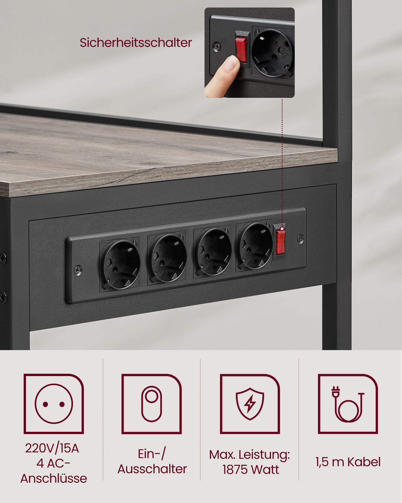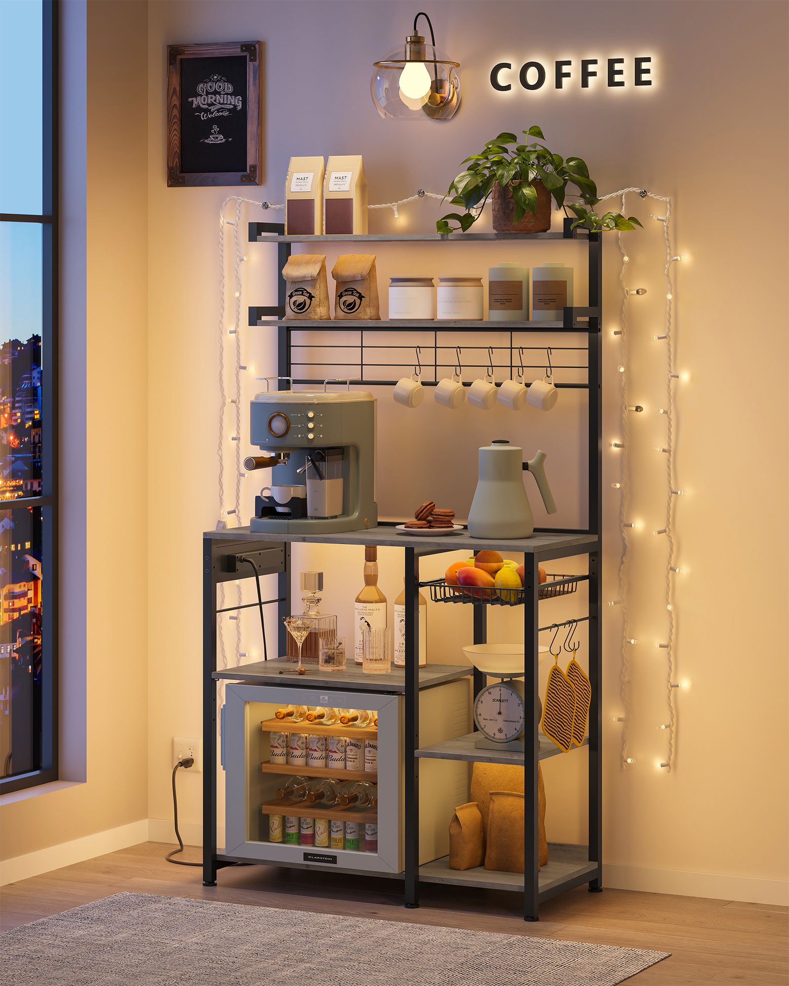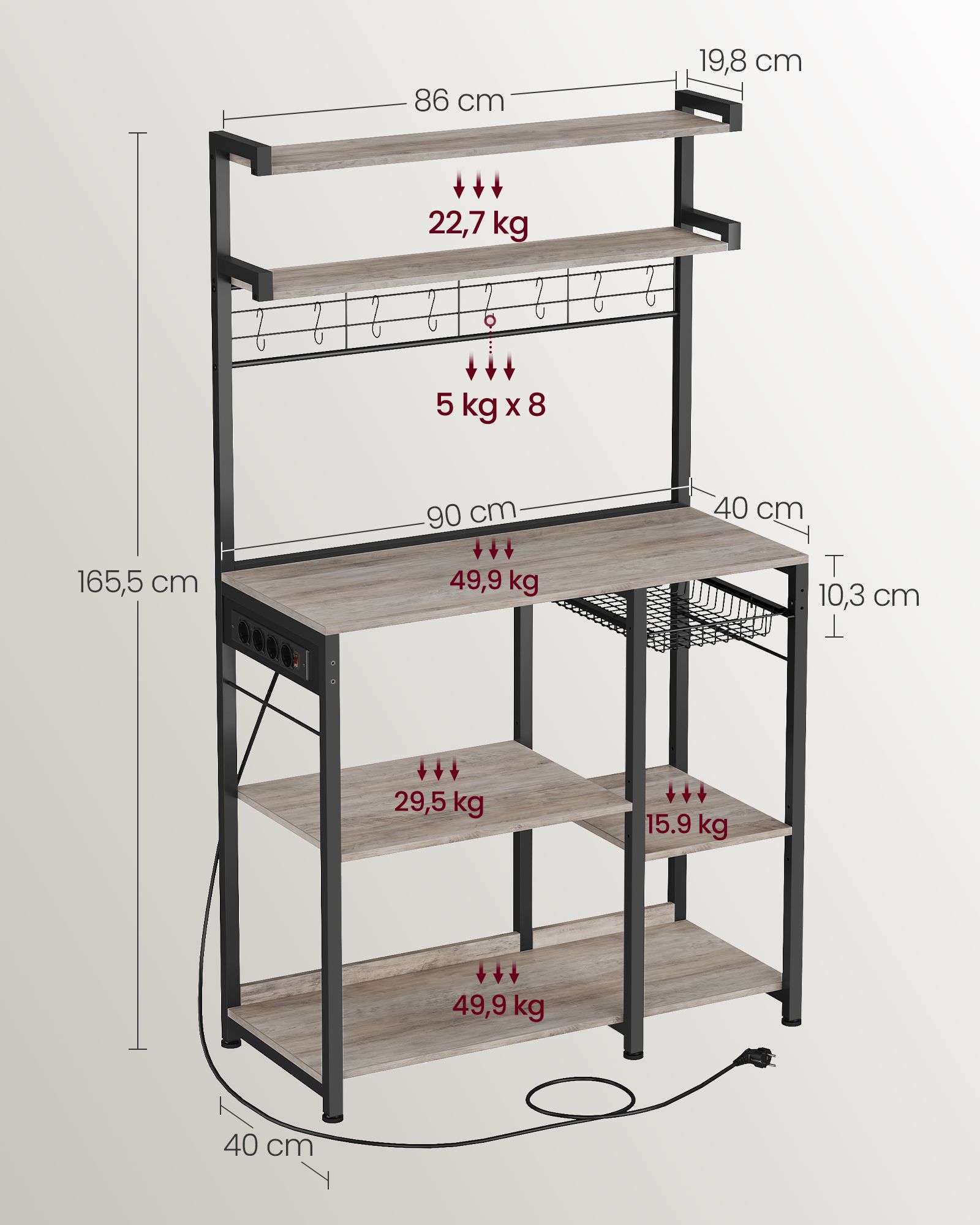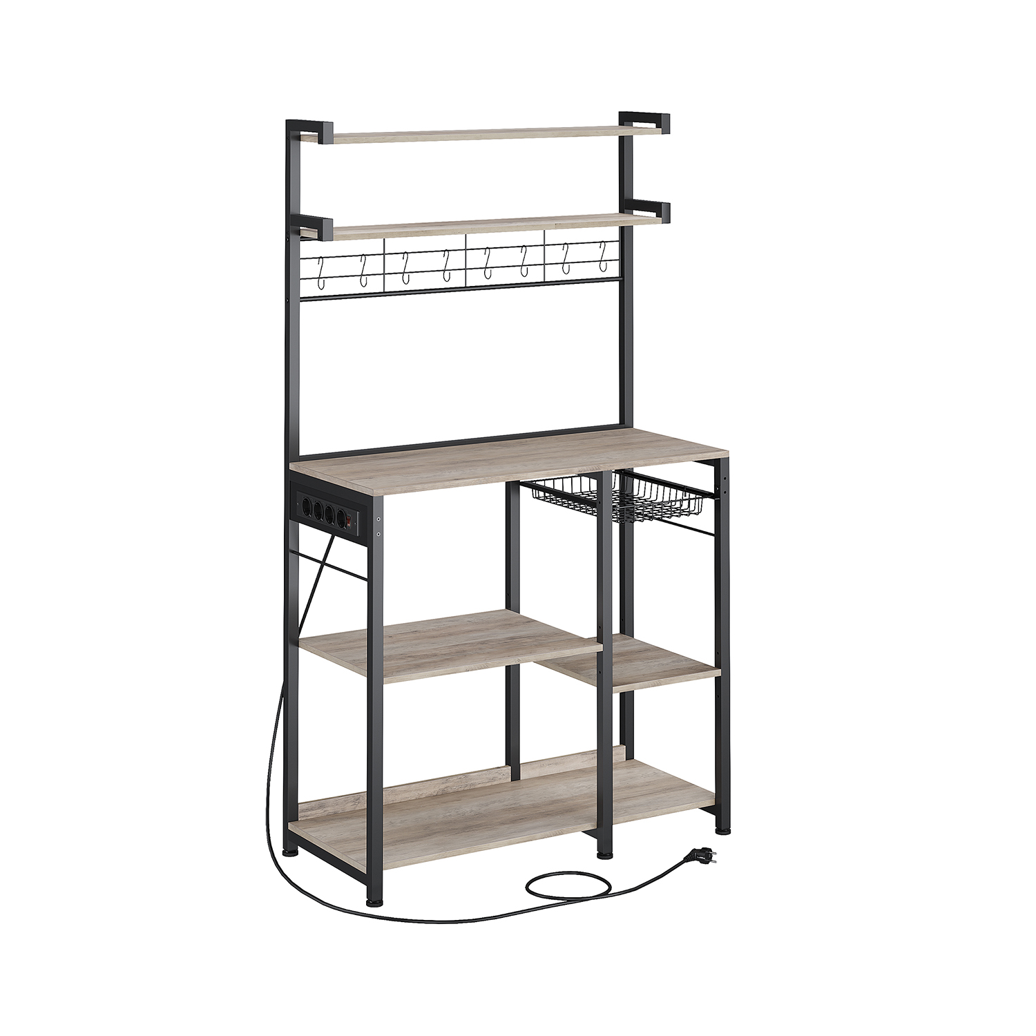 VASAGLE keittiöhylly, seisomahylly pistorasioilla, mikroaaltouunihylly, kahvibaari, leipomohylly, 8 S-koukkua, korilla, maustehylly