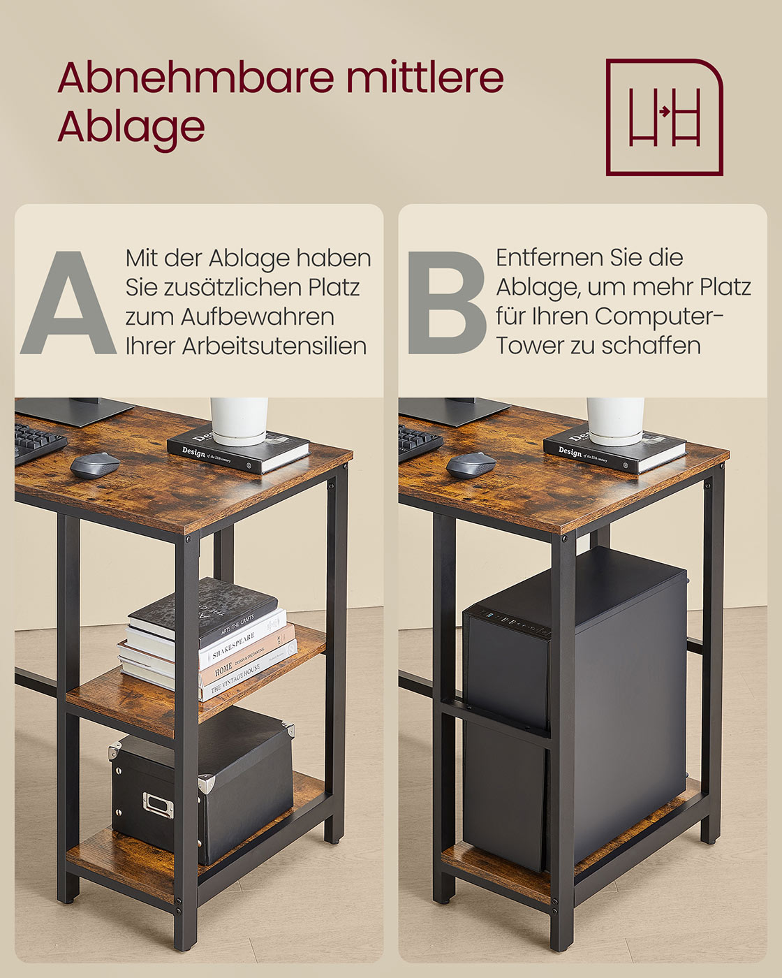 VASAGLE-kirjoituspöytä, L-muotoinen tietokonepöytä, kulmapöytä 2 hyllyllä, tilaa säästävä toimistopöytä teollisessa designissa, pelaamiseen, helppo koota, vintage-ruskea-musta LWD72X