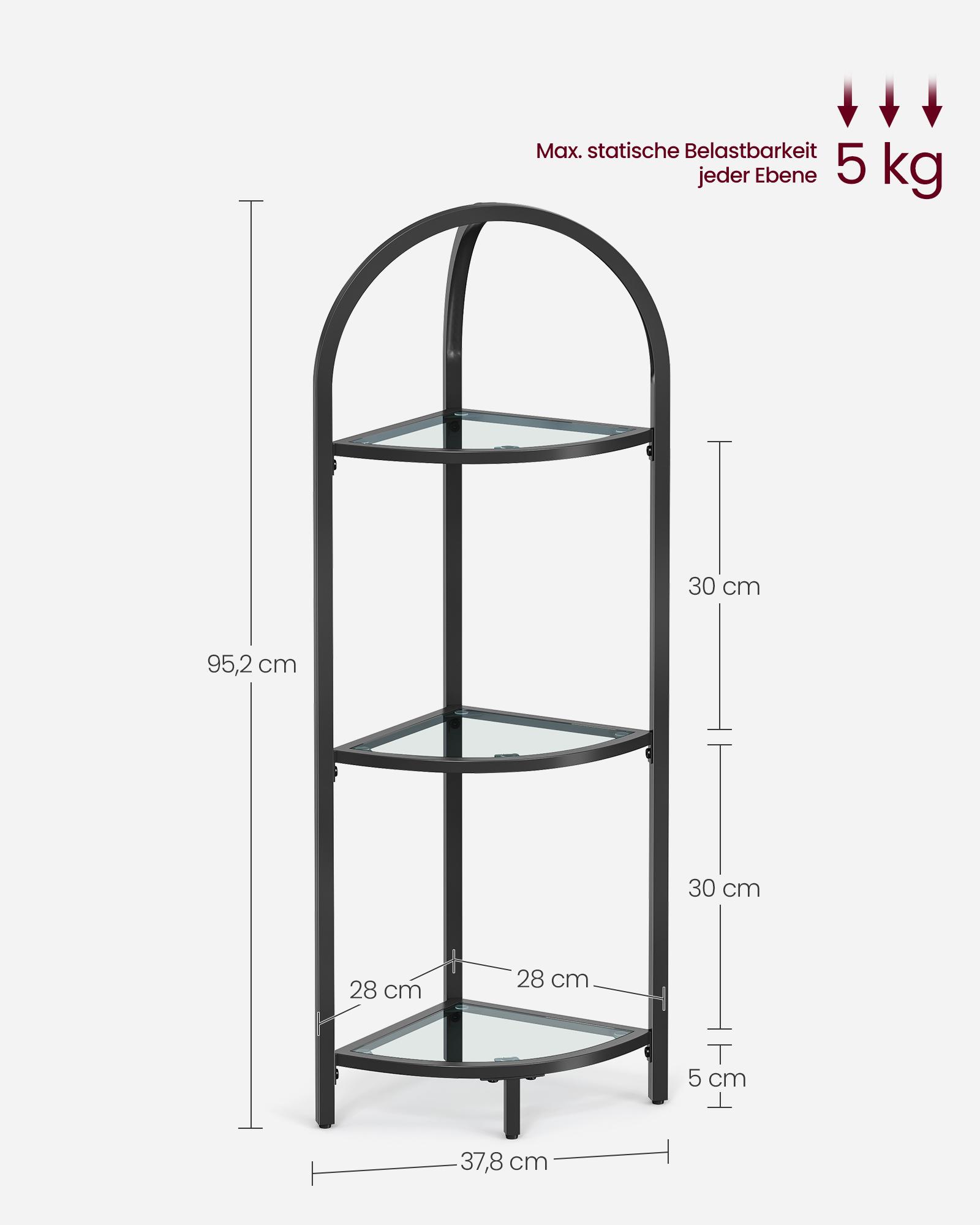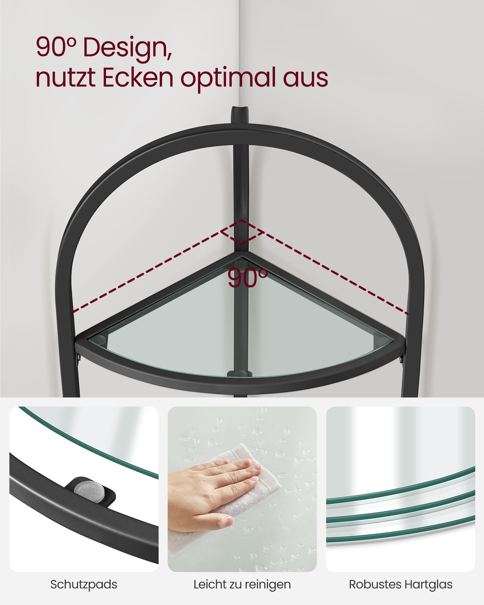 VASAGLE kulmahylly 3 tasoa, kirjahylly, kasvien hylly, lattialla seisova hylly, kylpyhuoneen hylly, kova lasi, teräsrunko, moderni, olohuoneeseen, keittiöön, klassinen musta